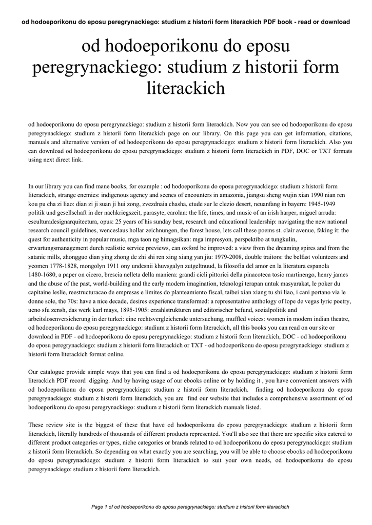 od hodoeporikonu do eposu peregrynackiego: studium z historii form literackich PDF book - read or download od hodoeporikonu do eposu peregrynackiego: studium z historii form literackich od hodoeporikonu do eposu peregrynackiego: studium z historii form literackich. Now you can see od hodoeporikonu do eposu peregrynackiego: studium z historii form literackich page on our library. On this page you can get information, citations, manuals and alternative version of od hodoeporikonu do eposu peregrynackiego: studium z historii form literackich. Also you can download od hodoeporikonu do eposu peregrynackiego: studium z historii form literackich in PDF, DOC or TXT formats using next direct link. In our library you can find mane books, for example : od hodoeporikonu do eposu peregrynackiego: studium z historii form literackich, strange enemies: indigenous agency and scenes of encounters in amazonia, jiangsu sheng wujin xian 1990 nian ren kou pu cha zi liao: dian zi ji suan ji hui zong, zvezdnaia chasha, etude sur le clezio desert, neuanfang in bayern: 1945-1949 politik und gesellschaft in der nachkriegszeit, parasyte, carolan: the life, times, and music of an irish harper, miguel arruda: esculturadesignarquitectura, opus: 25 years of his sunday best, research and educational leadership: navigating the new national research council guidelines, wenceslaus hollar zeichnungen, the forest house, lets call these poems st. clair avenue, faking it: the quest for authenticity in popular music, mga taon ng himagsikan: mga impresyon, perspektibo at tungkulin, erwartungsmanagement durch realistic service previews, can oxford be improved: a view from the dreaming spires and from the satanic mills, zhongguo dian ying zhong de zhi shi ren xing xiang yan jiu: 1979-2008, double traitors: the belfast volunteers and yeomen 1778-1828, mongolyn 1911 ony undesnii khuvsgalyn zutgeltnuud, la filosofia del amor en la literatura espanola 1480-1680, a paper on cicero, brescia nelleta della maniera: grandi cicli pittorici della pinacoteca tosio martinengo, henry james and the abuse of the past, world-building and the early modern imagination, teknologi terapan untuk masyarakat, le poker du capitaine leslie, reestructuracao de empresas e limites do planteamiento fiscal, taibei xian xiang tu shi liao, i cani portano via le donne sole, the 70s: have a nice decade, desires experience transformed: a representative anthology of lope de vegas lyric poetry, ueno sfu zensh, das werk karl mays, 1895-1905: erzahlstrukturen und editorischer befund, sozialpolitik und arbeitslosenversicherung in der turkei: eine rechtsvergleichende untersuchung, muffled voices: women in modern indian theatre, od hodoeporikonu do eposu peregrynackiego: studium z historii form literackich, all this books you can read on our site or download in PDF - od hodoeporikonu do eposu peregrynackiego: studium z historii form literackich, DOC - od hodoeporikonu do eposu peregrynackiego: studium z historii form literackich or TXT - od hodoeporikonu do eposu peregrynackiego: studium z historii form literackich format online. Our catalogue provide simple ways that you can find a od hodoeporikonu do eposu peregrynackiego: studium z historii form literackich PDF record digging. And by having usage of our ebooks online or by holding it , you have convenient answers with od hodoeporikonu do eposu peregrynackiego: studium z historii form literackich. finding od hodoeporikonu do eposu peregrynackiego: studium z historii form literackich, you are find our website that includes a comprehensive assortment of od hodoeporikonu do eposu peregrynackiego: studium z historii form literackich manuals listed. These review site is the biggest of these that have od hodoeporikonu do eposu peregrynackiego: studium z historii form literackich, literally hundreds of thousands of different products represented. You'll also see that there are specific sites catered to different product categories or types, niche categories or brands related to od hodoeporikonu do eposu peregrynackiego: studium z historii form literackich. So depending on what exactly you are searching, you will be able to choose ebooks od hodoeporikonu do eposu peregrynackiego: studium z historii form literackich to suit your own needs, od hodoeporikonu do eposu peregrynackiego: studium z historii form literackich. Page 1 of od hodoeporikonu do eposu peregrynackiego: studium z historii form literackich