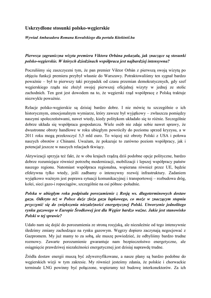 Uskrzydlone stosunki polsko-węgierskie Wywiad Ambasadora Romana Kowalskiego dla portalu Kitekintő.hu Pierwsza zagraniczna wizyta premiera Viktora Orbána pokazała, jak znaczące są stosunki polsko-węgierskie. W których dziedzinach współpraca jest najbardziej intensywna? Poczuliśmy się zaszczyceni tym, że pan premier Viktor Orbán z pierwszą swoją wizytą po objęciu funkcji premiera przybył własnie do Warszawy. Potraktowaliśmy ten sygnał bardzo poważnie – był to pierwszy taki przypadek od czasu przemian demokratycznych, gdy szef węgierskiego rządu nie złożył swojej pierwszej oficjalnej wizyty w jednej ze stolic zachodnich. Ten gest jest dowodem na to, że węgierski rząd współpracę z Polską traktuje niezwykle poważnie. Relacje polsko-węgierskie są dzisiaj bardzo dobre. I nie mówię tu szczególnie o ich historycznym, emocjonalnym wymiarze, który zawsze był wyjątkowy – zwłaszcza pomiędzy naszymi społeczeństwami, nawet wtedy, kiedy politykom układało się to różnie. Szczególnie dobrze układa się współpraca gospodarcza. Wiele osób nie zdaje sobie nawet sprawy, że dwustronne obroty handlowe w roku ubiegłym powróciły do poziomu sprzed kryzysu, a w 2011 roku mogą przekroczyć 5,5 mld euro. To więcej niż obroty Polski z USA i połowa naszych obrotów z Chinami. Uważam, że pokazuje to zarówno poziom współpracy, jak i potencjał jeszcze w naszych relacjach tkwiący. Aktywizacji sprzyja też fakt, że w obu krajach rządzą dziś podobne opcje polityczne, bardzo dobrze rozumiejące również potrzebę modernizacji, mobilizacji i lepszej współpracy państw naszego regionu. Natomiast współpraca regionalna, wspierana również przez UE, będzie efektywna tylko wtedy, jeśli zadbamy o intensywny rozwój infrastruktury. Zadaniem wyjątkowo ważnym jest poprawa sytuacji komunikacyjnej i transportowej – rozbudowa dróg, kolei, sieci gazo-i ropociągów, szczególnie na osi północ–południe. Polska w ubiegłym roku podpisała porozumienie z Rosją ws. długoterminowych dostaw gazu. Odkryto też w Polsce duże złoża gazu łupkowego, co może w znaczącym stopniu przyczynić się do zwiększenia niezależności energetycznej Polski. Utworzenie jednolitego rynku gazowego w Europie Środkowej jest dla Węgier bardzo ważne. Jakie jest stanowisko Polski w tej sprawie? Udało nam się dojść do porozumienia ze stroną rosyjską, ale niezależnie od tego intensywnie śledzimy zmiany zachodzące na rynku gazowym. Węgrzy dopiero zaczynają negocjować z Gazpromem. My już mamy to za sobą, ale muszę powiedzieć, że odbyliśmy bardzo trudne rozmowy. Zawarte porozumienie gwarantuje nam bezpieczeństwo energetyczne, ale osiągnięcie prawdziwej niezależności energetycznej jest dzisiaj naprawdę trudne. Źródła dostaw energii muszą być zdywersyfikowane, a nasze plany są bardzo podobne do węgierskich wizji w tym zakresie. My również jesteśmy zdania, że polskie i chorwackie terminale LNG powinny być połączone, wspieramy też budowę interkonektorów. Za ich pomocą będziemy w stanie utworzyć system, który zapewni większe bezpieczeństwo energetyczne dla krajów regionu. Ten plan jest jednym ze wspólnych dla Węgier i Polski priorytetów w ramach naszych prezydencji, od dawna negocjujemy między sobą tę kwestię. Węgrów bardzo interesują doświadczenia z polsko-rosyjskich obrad nad umową gazową i my również będziemy obserwować, jakie porozumienie zostanie zawarte między Budapesztem a Moskwą. Węgry są kluczem do bezpieczeństwa energetycznego Europy Środkowej – występują we wszystkich planach związanych z gazem i ropą. Biorąc pod uwagę, że Rosja traktuje Budapeszt jako poważnego partnera energetycznego, decyzje węgierskiego rządu są ważne również dla nas. Przy polskich złożach gazu łupkowego ruszyły poważne prace. Jako obywatel bardzo bym się cieszył, gdyby potwierdziły się przypuszczenia ekspertów. W znacznym stopniu przyczyniłoby się to do zwiększenia niezależności energetycznej Polski i całego regionu. Minister Spraw Zagranicznym Radosław Sikorski podczas swojej grudniowej wizyty w Budapeszcie powiedział, że Prezydencje Węgier i Polski doskonale się uzupełniają. W jakim zakresie pokrywają się programy dwóch Prezydencji i jakie są priorytety polskiego przewodnictwa w UE? Rok 2011 jest wyjątkowy zarówno dla Polski jak i dla Węgier, ponieważ przewodnictwo w Radzie UE obejmą po sobie dwa nowe kraje członkowskie UE, kraje środkowoeuropejskie i wyszehradzkie. Jest to wyjątkowa szansa dla obu naszych krajów, nawet jeśli pracujemy w ramach dwóch różnych trio. Polska przejmie Prezydencję od Węgier, co określi też wiele naszych działań w drugim półroczu. Sukces węgierskiej Prezydencji stanowiłby wielką pomoc również dla polskiego rządu, który po udanym przewodnictwie łatwiej przejąłby pracę. Także dlatego bardzo zależy nam na węgierskim sukcesie i chcemy wspierać Węgrów jak tylko jest to możliwe. Oczywiście bardzo ważny jest fakt, że wśród priorytetów mamy wiele ważnych i wspólnych dla obu krajów celów – bezpieczeństwo energetyczne, czy utrzymanie otwartego charakteru UE w kontekście bliskiej współpracy z państwami z Partnerstwa Wschodniego. Dla obu naszych krajów kluczowe znaczenie maja też podejmowane obecnie sprawy gospodarcze i przyszłość wspólnej waluty. Musimy jak najszybszej wyjść z kryzysu i ponownie wprowadzić Unię na ścieżkę rozwoju. Polska, podobnie jak Węgry, rozumie aspiracje i działania Bułgarii i Rumunii, by jak najszybciej znaleźć się w grupie państw Schengen. Nasze stanowisko jest identyczne – kraje które spełniły kryteria, powinny znaleźć się w Schengen. Absolutnie zgadzamy się z Węgrami w tej kwestii. Z polskich celów należy wymienić przede wszystkim negocjacje wieloletnich ram finansowych – już wiadomo, że Węgry nie podejmą tego tematu podczas swojego przewo