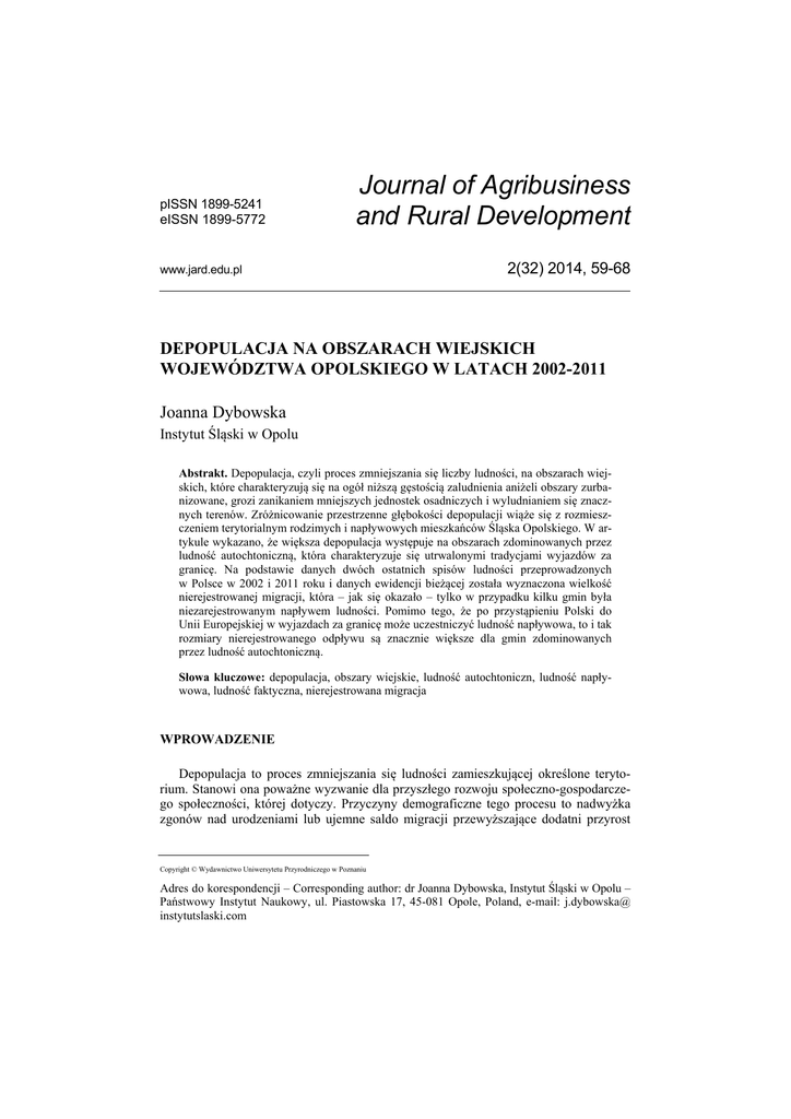 pISSN 1899-5241 eISSN 1899-5772 Journal of Agribusiness and Rural Development www.jard.edu.pl 2(32) 2014, 59-68 DEPOPULACJA NA OBSZARACH WIEJSKICH WOJEWÓDZTWA OPOLSKIEGO W LATACH 2002-2011 Joanna Dybowska Instytut Śląski w Opolu Abstrakt. Depopulacja, czyli proces zmniejszania się liczby ludności, na obszarach wiejskich, które charakteryzują się na ogół niższą gęstością zaludnienia aniżeli obszary zurbanizowane, grozi zanikaniem mniejszych jednostek osadniczych i wyludnianiem się znacznych terenów. Zróżnicowanie przestrzenne głębokości depopulacji wiąże się z rozmieszczeniem terytorialnym rodzimych i napływowych mieszkańców Śląska Opolskiego. W artykule wykazano, że większa depopulacja występuje na obszarach zdominowanych przez ludność autochtoniczną, która charakteryzuje się utrwalonymi tradycjami wyjazdów za granicę. Na podstawie danych dwóch ostatnich spisów ludności przeprowadzonych w Polsce w 2002 i 2011 roku i danych ewidencji bieżącej została wyznaczona wielkość nierejestrowanej migracji, która – jak się okazało – tylko w przypadku kilku gmin była niezarejestrowanym napływem ludności. Pomimo tego, że po przystąpieniu Polski do Unii Europejskiej w wyjazdach za granicę może uczestniczyć ludność napływowa, to i tak rozmiary nierejestrowanego odpływu są znacznie większe dla gmin zdominowanych przez ludność autochtoniczną. Słowa kluczowe: depopulacja, obszary wiejskie, ludność autochtoniczn, ludność napływowa, ludność faktyczna, nierejestrowana migracja WPROWADZENIE Depopulacja to proces zmniejszania się ludności zamieszkującej określone terytorium. Stanowi ona poważne wyzwanie dla przyszłego rozwoju społeczno-gospodarczego społeczności, której dotyczy. Przyczyny demograficzne tego procesu to nadwyżka zgonów nad urodzeniami lub ujemne saldo migracji przewyższające dodatni przyrost Copyright © Wydawnictwo Uniwersytetu Przyrodniczego w Poznaniu Adres do korespondencji – Corresponding author: dr Joanna Dybowska, Instytut Śląski w Opolu – Państwowy Instytut Naukowy, ul. Piastowska 17, 45-081 Opole, Poland, e-mail: j.dybowska@ instytutslaski.com 60 J. Dybowska naturalny. Występowanie łączne ujemnego przyrostu naturalnego i ujemnego salda migracji prowadzi do wyludnienia. Wyludnianie jest oceniane jako proces niekorzystny, gdyż obejmuje nie tylko zmniejszanie liczby ludności, ale wiąże się z regresem infrastruktury (społecznej, technicznej), zanikaniem mniejszych ognisk sieci osadniczej i pogarszaniem dostępu do usług publicznych [Eberhardt 1989, Rosner 2010]. Celem prezentowanego artykułu jest diagnoza wielkości depopulacji w przekroju terytorialnym województwa opolskiego. Na podstawie danych pochodzących z dwóch ostatnich spisów powszechnych ludności, które przeprowadzono w 2002 i 2011 roku, oraz danych z ewidencji bieżącej obejmujących lata międzyspisowe przeanalizowano zmianę liczby ludności faktycznej na obszarach wiejskich w poszczególnych gminach województwa opolskiego oraz wyznaczono wielkość migracji nierejestrowanej w ewidencji bieżącej. Stan ludności zależy od trzech procesów demograficznych: płodności, umieralności i migracji. Na bieżąco są rejestrowane takie zdarzenia, jak: urodzenie, zgon, zameldowanie, wymeldowanie. Na podstawie danych ewidencji bieżącej jest bilansowana liczba ludności z uwzględnieniem przyrostu naturalnego i salda migracji. Spis powszechny, jako pełne badanie statystyczne ludności, wyznacza liczbę ludności w ściśle określonym momencie, tzw. momencie krytycznym spisu. Porównanie informacji o liczbie ludności pochodzących z ewidencji bieżącej i spisu powszechnego ujawnia rozbieżności, które są związane z niekompletnością zapisów ewidencji bieżącej. Dotyczy to przede wszystkim ruchów migracyjnych. W warunkach swobody poruszania się i wzrostu znaczenia migracji o charakterze czasowym, nie każdy fakt zmiany miejsca pobytu, nawet jeżeli dotyczy to dzisiaj wyjazdów za granicę, znajduje odzwierciedlenie w ewidencji bieżącej. Konfrontacja danych ewidencji bieżącej i spisu powszechnego może służyć wyznaczeniu wielkości nierejestrowanej migracji w rozumieniu salda, a nie strumieni przepływu. Rozbieżności w informacjach o stanie ludności pochodzących z ewidencji i spisu będą tym większe, im większa jest intensywność ruchów migracyjnych na danym terenie, zwłaszcza o charakterze czasowym, które na ogół nie są odnotowywane. POCHODZENIE REGIONALNE A PROCESY DEMOGRAFICZNE NA ŚLĄSKU OPOLSKIM Śląsk Opolski jest uznawany za region migracyjny [Heffner i Rauziński 2003, Śleszyński 2013], gdyż saldo migracji było znaczącym elementem w ruchu ludności. Obszar ten wyróżnia się też w całym powojennym rozwoju demograficznym najintensywniejszym w skali Polski odpływem emigracyjnym [Dybowska 2013]. Ze Śląska Opolskiego emigrowali głównie do Niemiec rodzimi mieszkańcy tej ziemi włączonej w granice państwa polskiego w 1945 roku. Ludność Śląska Opolskiego jest przykładem społeczności postmigracyjnej [Sakson 2013], gdyż ukształtowanej na powojennych, często przymusowych migracjach i jednocześnie migracyjnej – z powodu masowych wyjazdów do Niemiec ludności rodzimej. Na Śląsku Opolskim spotkały się więc grupy ludności o różnym pochodzeniu regionalnym – rodzima oraz napływowa z różnych stron Polski, w tym z utraconych Kresów Wschodnich II Rzeczypospolitej. Ludność rodzima do dzisiaj dominuje w centralnej i wschodniej części województwa opolskiego, zwłaszcza na obszarach wiejskich. Na pozostałym obszarze województwa dominuje Journal of Agribusiness and Rural Development Depopulacja na obszarach wiejskich województwa opolskiego w latach 2002-2011 61 ludność napływowa. Różnice w pochodzeniu regionalnym mieszkańców województwa opolskiego wiązały się z odmienną sytuacją demograficzną w przekroju terytorialnym. Obecnie, gdy roz