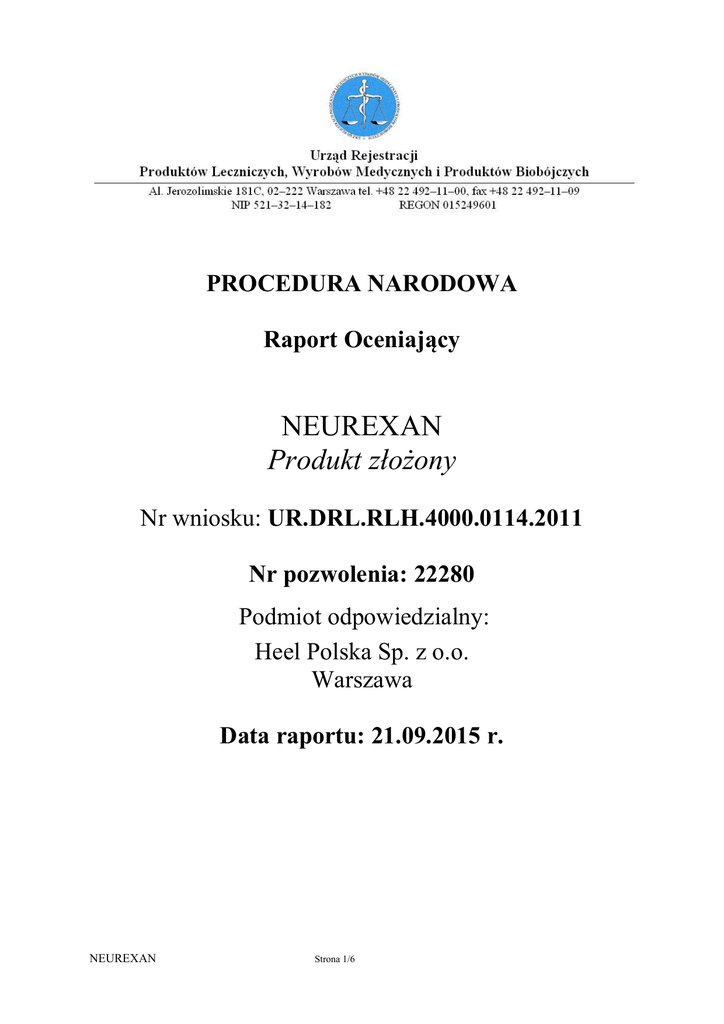 PROCEDURA NARODOWA Raport Oceniający NEUREXAN Produkt złożony Nr wniosku: UR.DRL.RLH.4000.0114.2011 Nr pozwolenia: 22280 Podmiot odpowiedzialny: Heel Polska Sp. z o.o. Warszawa Data raportu: 21.09.2015 r. NEUREXAN Strona 1/6 SPIS TREŚCI I WSTĘP II II.1 II.2 II.3 III PRZEGLĄD NAUKOWY I DYSKUSJA ASPEKTY DOTYCZĄCE JAKOŚCI ASPEKTY NIEKLINICZNE ASPEKTY KLINICZNE OCENA STOSUNKU KORZYŚCI DO RYZYKA IV ZALECANE WARUNKI POZWOLENIA NA DOPUSZCZENIE DO OBROTU I INFORMACJI O PRODUKCIE IV.1 IV.2 KATEGORIA DOSTĘPNOŚCI PRODUKTU LECZNICZEGO PROPONOWANA LISTA ZOBOWIĄZAŃ PO DOPUSZCZENIU DO OBROTU <I SZCZEGÓLNYCH OBOWIĄZKÓW> W PRZYPADKU POZYTYWNEJ OCENY STOSUNKU KORZYŚCI DO RYZYKA ZOBOWIĄZANIA PO DOPUSZCZENIU DO OBROTU IV.3 POZOSTAŁE WARUNKI NEUREXAN Strona 2/6 INFORMACJE ADMINISTRACYJNE Proponowana nazwa produktu leczniczego NEUREXAN Nazwa substancji czynnej (Nazwa INN): Produkt złożony Grupa farmakoterapeutyczna (kod ATC): - Postać (-ci) farmaceutyczna i moc(e): Tabletka Numer wniosku UR.DRL.RLH.4000.0114.2011 Heel Polska Sp. z o.o. ul. Poleczki 21 02-822 Warszawa Art. 17 ust. 2 i art. 16 ust. 1 ustawy z dnia 6 września 2001 r. Prawo farmaceutyczne Podmiot odpowiedzialny (nazwa i adres) Podstawa prawna wniosku I WSTĘP Po przeanalizowaniu danych odnośnie jakości, skuteczności i bezpieczeństwa zawartych w przedłożonej dokumentacji rejestracyjnej dołączonej do wniosku o pozwolenie na dopuszczenie do obrotu produktu leczniczego homeopatycznego NEUREXAN, we wskazaniach do stosowania w zaburzeniach snu i stanach wzmożonego napięcia nerwowego uznano, że: przedłożone dane pozwoliły na wydanie pozwolenia na dopuszczenie do obrotu. Pozwolenie Nr 22280 wydano w dniu 10.02.2015 r. NEUREXAN Strona 3/6 II II.1 PRZEGLĄD NAUKOWY I DYSKUSJA Aspekty dotyczące jakości Substancja czynna Avena sativa D2 Coffea arabica D12 Passiflora incarnata D2 Zincum isovalerianicum D4 Specyfikacje substancji czynnych, metody badań i ich walidacje zostały zaakceptowane. Produkt leczniczy homeopatyczny NEUREXAN tabletka Dokumentacja chemiczna, farmaceutyczna i biologiczna produktu Neurexan spełnia wymagania prawa farmaceutycznego. II.2 Aspekty niekliniczne Brak danych farmakokinetycznych i farmakologicznych, które dostępne są dla innych produktów leczniczych niż produkty homeopatyczne. Wyjaśniono, że działanie leków homeopatycznych opiera się na obrazach leków homeopatycznych i nie wynika z dawkozależnego działania farmakologicznego poszczególnych substancji czynnych. Ocena toksykologiczna została dokonana na podstawie eksperymentów in vitro i badań in vivo dla substancji wyjściowych substancji czynnych, dostępnych w piśmiennictwie. Przegląd niekliniczny został napisany przez Dr. Tankreda Wegenera, a następnie uzupełniony przez Dr. Karin Jochins. Ocena zagrożeń dla środowiska naturalnego (ERA) Zgodnie z wytyczną „Guideline on the Environmental Risk Assessment of Medicinal Products for Human Use” EMEA/CHMP/SWP/4447/00 przedłożono ocenę ryzyka dla środowiska naturalnego. [...] W oparciu o wytyczną EMEA/CHMP/SWP/4447/00 dopuszcza się dla substancji o ugruntowanym zastosowaniu medycznym odstępstwo od wykonywania szczegółowej analizy ryzyka środowiskowego. II.3 Aspekty kliniczne Biorównoważność Nie dotyczy. Produkt zawierający substancje czynne o ugruntowanym zastosowaniu klinicznym – nie określono więc produktu referencyjnego i nie jest wymagane wykonywanie badań biorównoważności. NEUREXAN Strona 4/6 Skuteczność kliniczna Najważniejsze badania dostępne w piśmiennictwie dla produktu homeopatycznego Neurexan to badanie randomizowane z podwójną ślepą próbą i kontrolą placebo u zdrowych ochotników (Dimpfel, 2007) oraz 2 badania obserwacyjne porównujące skuteczność produktu Neurexan z produktami zawierającymi wyciąg z kozłka u osób chorych z zaburzeniami snu i wzmożonym napięciem nerwowym (Hübner et al., 2009; Waldschütz, Klein, 2008). Badanie kontrolowane wykazało wpływ produktu Neurexan na aktywność fal mózgowych w sposób statystycznie znamienny w porównaniu do placebo. Badania obserwacyjne, które objęły łącznie grupę ponad 1000 osób, wskazują że produkt homeopatyczny Neurexan wykazuje nie mniejszą skuteczność niż produkty zawierające przetwory z kozłka. Wyciąg etanolowo-wodny z kozłka lekarskiego został uznany za skuteczny w łagodnych stanach napięcia nerwowego i zaburzeniach snu przez Europejską Agencje Leków EMA, o czym świadczy monografia wspólnotowa HMPC. Bezpieczeństwo kliniczne Bezpieczeństwo kliniczne opiera się na 1 badaniu kontrolowanym, 2 badaniach obserwacyjnych produktu, danych zbieranych przez lekarzy oraz monitorowaniu działań niepożądanych (przedstawiono raporty PSUR za okres 2001-2012r.). Bardzo rzadko (1 na 10000 pacjentów leczonych) zgłaszano skórne reakcje alergiczne. System monitorowania bezpieczeństwa (Pharmacovigilance System) stosowania produktu leczniczego Wnioskodawca przedstawił poprawny szczegółowy opis systemu monitorowania stosowania produktu leczniczego, dysponuje usługami osoby wykwalifikowanej odpowiedzialnej za nadzór nad bezpieczeństwem stosowania produktów leczniczych i środkami służącymi wypełnieniu obowiązków związanych z tym nadzorem. Okresowy raport o bezpieczeństwie stosowania produktu leczniczego (PSUR) Dla produktów leczniczych dopuszczonych do obrotu jako leki o ugruntowanym zastosowaniu medycznym nie ma obowiązku przygotowywania okresowych raportów o bezpieczeństwie, chyba, że lista EURD stanowi inaczej. III OCENA STOSUNKU KORZYŚCI DO RYZYKA Przedstawiona dokumentacja wskazuje że, korzyści terapeutyczne przewyższają ewentualne ryzyko stosowania. IV IV.1 ZALECANE WARUNKI POZWOLENIA NA DOPUSZCZENIE DO OBROTU I INFORMACJI O PRODUKCIE Kategoria dostępności produktu leczniczego Produkt leczniczy wydawany bez przepisu lekarza – OTC. NEUREXAN Strona 5/6 IV.2 Proponowana lista zobowiązań po dopuszczeniu do obrotu <i sz