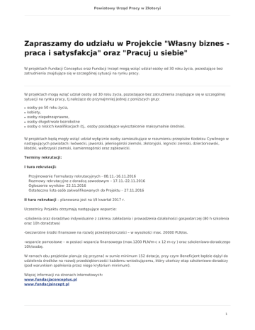 Powiatowy Urząd Pracy w Złotoryi Zapraszamy do udziału w Projekcie "Własny biznes praca i satysfakcja" oraz "Pracuj u siebie" W projektach Fundacji Conceptus oraz Fundacji Incept mogą wziąć udział osoby od 30 roku życia, pozostające bez zatrudnienia znajdujące się w szczególnej sytuacji na rynku pracy. W projektach mogą wziąć udział osoby od 30 roku życia, pozostające bez zatrudnienia znajdujące się w szczególnej sytuacji na rynku pracy, tj.należące do przynajmniej jednej z poniższych grup: ● ● ● ● ● osoby po 50 roku życia, kobiety, osoby niepełnosprawne, osoby długotrwale bezrobotne osoby o niskich kwalifikacjach (tj,. osoby posiadające wykształcenie maksymalnie średnie). W projektach będą mogły wziąć udział wyłącznie osoby zamieszkujące w rozumieniu przepisów Kodeksu Cywilnego w następujących powiatach: lwówecki, jaworski, jeleniogórski ziemski, złotoryjski, legnicki ziemski, dzierżoniowski, kłodzki, wałbrzyski ziemski, kamiennogórski oraz ząbkowicki. Terminy rekrutacji: I tura rekrutacji: Przyjmowanie Formularzy rekrutacyjnych - 08.11.-16.11.2016 Rozmowy rekrutacyjne z doradcą zawodowym – 17.11.-22.11.2016 Ogłoszenie wyników- 22.11.2016 Ostateczna lista osób zakwalifikowanych do Projektu – 27.11.2016 II tura rekrutacji – planowana jest na I/II kwartał 2017 r. Uczestnicy Projektu otrzymają następujące wsparcie: -szkolenia oraz doradztwo indywidualne z zakresu zakładania i prowadzenia działalności gospodarczej (80 h szkolenia oraz 10h doradztwa) -bezzwrotne środki finansowe na rozwój przedsiębiorczości – w wysokości max. 20000 PLN/os. -wsparcie pomostowe – w postaci wsparcia finansowego (max.1200 PLN/m-c x 12 m-cy ) oraz szkoleniowo-doradczego 10h/osobę. W ramach obu projektów planuje się przyznać w sumie minimum 152 dotacje, przy czym Beneficjent będzie dążył do udzielenia środków na rozwój przedsiębiorczości każdemu wnioskującemu, który ukończy etap szkoleniowo-doradczy (pod warunkiem spełnienia przez niego kryterium minimum). Więcej informacji na stronach internetowych: www.fundacjaconceptus.pl www.fundacjaincept.pl 1 Powiatowy Urząd Pracy w Złotoryi 2 Powiatowy Urząd Pracy w Złotoryi 3 Powiatowy Urząd Pracy w Złotoryi 4