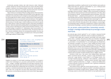Grochowska pozostaje niestety zbyt mało krytyczna wobec Giedroycia – polityka. Brakuje jej warsztatu historyka idei oraz zmysłu człowieka polityki, a książka o Giedroyciu musi dotykać polityki i historii idei. Autorkę jakby przytłoczył tytuł serii wydawniczej. Jej książka dowodzi konieczności stworzenia krytycznego studium idei oraz politycznego oblicza Giedroycia. Wpływ Giedroycia na dzisiejszą Polskę nie podlega dyskusji. Obecnie jesteśmy w przełomowym momencie, dlatego warto przemyśleć na nowo jego idee i samą osobę jako twórcę idei politycznych i strategii rozwoju polskiej polityki. Prorosyjski kurs, jaki przyjęły obecne władze w Kijowie, a także poważna zmiana polityki amerykańskiej każą nam jeszcze raz przemyśleć spuściznę Giedroycia. Wystrzegałbym się jednak prostego odrzucenia politycznego programu Redaktora. Został on tak skonstruowany, że nie dało się go w całości zrealizować, ale również nie sposób go w całości odrzucić. Chyba, że przestaje się myśleć o Polsce jako samodzielnym państwie. Całkowite pozbawienie polskiej polityki wschodniej giedroyciowskiego wymiaru oznacza wepchnięcie jej w płytki strumień doraźnych interesów, a sztuka polityki polega na zespoleniu ich z dalekosiężną wizją rozwoju państwa. To jest prawdziwa lekcja Giedroycia. Antyendeckie tyrady, równościowe hasła oraz listy w obronie ukraińskiej wolności nie wyczerpują istoty polityki. Ona toczy się w głębi i musimy w tę głębię wejrzeć, prowadzeni przez mistrza-przewodnika, czyli cichego redaktora z Maison-Lafitte. Mateusz Kędzierski 324 Reinhard Marx (we współpracy z Arndem Küpersem) Kapitał. Mowa w obronie człowieka Das Kapital. Ein Plädoyer für den Menschen, 2008 przeł. Janusz Serafin CSsR Homo Dei Kraków 2009 306 stron; twarda oprawa cena 39,90 zł Mogłoby się wydawać, że tytuł książki arcybiskupa Monachium i Fryzyngi to zwykły chwyt marketingowy; ot, po prostu wykorzystał Marx homonimię nazwisk − swojego i zmarłego siedemdziesiąt lat przed jego urodzeniem Karla. A jednak autor tego Kapitału całkiem poważnie nawiązuje do myśli tamtego Kapitału, które okazują się być według niego nad wyraz aktualne. Jest przekonany, że żyjemy w momencie przełomowym (zob. jego tekst w przedostatnich „Pressjach”, Marx 2010: 47-49), który nie może zostać zlekceważony, jeśli bowiem tak się stanie, na arenę dziejową niechybnie wróci tamten Marks i jego epigoni. Odpowiedzią na problemy współczesności ma być katolicka nauka społeczna (KNS), której Marx jest „gorącym zwolennikiem” (s. 231) i o której poważne traktowanie w debacie publicznej apeluje. Marx nie podziela oczywiście manichejskiego stosunku do kapitału, jaki przejawiał jego „kuzyn po nazwisku”, dlatego w obliczu nowej sytuacji na światowym rynku, której nie waha się porównywać do kwestii robotniczej w XIX wieku, zaleca nie rewolucję, lecz reformę – tak aby gospodarka rynkowa stawała się – jak to określił Alexander Rüstow – „służebnicą człowieczeństwa” (s. 38). Czy jednak wrażliwość Kościoła na losy tych, którzy zdają się dziś być wykorzystywani przez globalne rynki, nie słusznie nazywa się dziś „marksizmem Serca Jezusowego” (s. 20)? To dowcipne sformułowanie wymaga rzetelnej odpowiedzi. Niemało wszak jest tych, którzy KNS albo odrzucają a priori, albo uważają za „trzecią drogą”, coś pośredniego między socjalizmem a kapitalizmem. Punktem wyjścia Kościóła jest jednak antropologia: „«punktem węzłowym» katolickiej nauki społecznej Ot, po prostu wykorzystał Marx homonimię nazwisk − swojego i zmarłego siedemdziesiąt lat przed jego urodzeniem Karla. jest człowiek, jego wolność i godność” (s. 14). To właśnie z tej pozycji Kościół krytykuje indywidualistyczny liberalizm i odrzuca socjalistyczny kolektywizm. Co jednak zrobić, gdyby jakiś zwolennik czarno-białej wizji świata zapytał wprost, który z systemów ekonomicznych bliższy jest Kościołowi? Należałoby mu odpowiedzieć, że KNS znajduje się między socjalizmem i kapitalizmem, ale z „«przechyłem» w stronę liberalizmu” (s. 51). Kościół zgadza się z liberalizmem, ale uznaje go za narzędzie, a nie cel sam w sobie. Według Jana Pawła II oczekiwanie, że pozostawienie wszystkiego „swobodnej grze sił rynkowych” wystarczy, żeby uporać się z biedą i innymi problemami światowymi, jest „ślepą wiarą” (Centesimus Annus, 42); nie wolno akceptować takiego kapitalizmu, „w którym wolność gospodarcza nie jest ujęta w ramy systemu prawnego, wprzęgającego ją w służbę integralnej wolności ludzkiej i traktującego jako szczególny wymiar tejże wolności, która ma przede wszystkim charakter etyczny i religijny” (tamże). Kościołowi chodzi więc o taki system, który najlepiej będzie odpowiadał dobrze rozumianej naturze człowieka, „zarówno w jego samodzielnym bytowaniu, jak i w jego relacjach z innymi ludźmi” (s. 73). Dlatego zamiast „trzeciej drogi” Kościół proponuje „solidaryzm”, który podkreśla „z jednej strony – w opozycji do indywidualizmu – społeczną naturę człowieka i jego związek z dobrem wspólnym społeczności, a z drugiej – w opozycji do kolektywizmu – wolność jednostki i jej prawo do własności, choć w granicach nakreślonych przez owo dobro wspólne” (s. 51). Teoria Adama Smitha w głównym zarysie okazuje się słuszna – wolny rynek przyczynia się rzeczywiście do „bogactwa narodów”, ale praktyka pokazuje, że kapitalistyczna ortodoksja wymaga reformy. Kapitalizm należy „«obłaskawić» i pchnąć go, poprzez ustanowienie odpowiednich ram porządku politycznego, Kompressje 325 326 na drogę rozwoju ku społecznej gospodarce rynkowej” (s. 37). Cel gospodarki polega bowiem – cytuje Marx klasyczną definicję Josepha Höffnera – na „ciągłym i pewnym tworzeniu materialnych prz