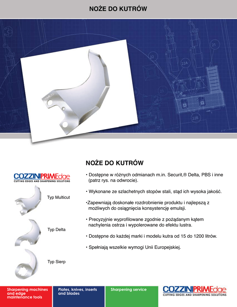 NOŻE DO KUTRÓW NOŻE DO KUTRÓW • Dostępne w różnych odmianach m.in. Securit,® Delta, PBS i inne (patrz rys. na odwrocie). Typ Multicut Typ Delta • Wykonane ze szlachetnych stopów stali, stąd ich wysoka jakość. •Zapewniają doskonałe rozdrobnienie produktu i najlepszą z możliwych do osiągnięcia konsystencję emulsji. • Precyzyjnie wyprofilowane zgodnie z pożądanym kątem nachylenia ostrza i wypolerowane do efektu lustra. • Dostępne do każdej marki i modelu kutra od 15 do 1200 litrów. • Spełniają wszelkie wymogi Unii Europejskiej. Typ Sierp Sharpening machines and edge maintenance tools Plates, knives, inserts and blades Sharpening service NOŻE DO KUTRÓW Cozzini oferuje wymianę noży do kutrów wszystkich poniższych marek. Jeżeli używają Państwo nietypowych modeli, Cozzini może wykonać dowolne noże na zamówienie. Akkord Alexanderwerk Alexandre Alpina Aubert Boss (Sickle and 4-cut styles only) Bouvard Buffalo Cato DesMulle Diana Fatos Fimpel Finis Hely-Joly Hobart Iozelli Kilia Krämer & Grebe Laska Manurhin Meissner Müller Presto Rex Sema Seydelmann Strömmen Vall Villa 4300 West Bryn Mawr Avenue Chicago, IL 60646-5943 U.S.A. 877-322-EDGE (3343) primedge.com [email protected]