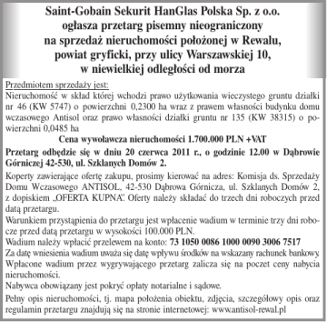 Saint-Gobain Sekurit HanGlas Polska Sp. z o.o. ogłasza przetarg pisemny nieograniczony na sprzedaż nieruchomości położonej w Rewalu, powiat gryficki, przy ulicy Warszawskiej 10, w niewielkiej odległości od morza Przedmiotem sprzedaży jest: Nieruchomość w skład której wchodzi prawo użytkowania wieczystego gruntu działki nr 46 (KW 5747) o powierzchni 0,2300 ha wraz z prawem własności budynku domu wczasowego Antisol oraz prawo własności działki gruntu nr 135 (KW 38315) o powierzchni 0,0485 ha Cena wywoławcza nieruchomości 1.700.000 PLN +VAT Przetarg odbędzie się w dniu 20 czerwca 2011 r., o godzinie 12.00 w Dąbrowie Górniczej 42-530, ul. Szklanych Domów 2. Koperty zawierające ofertę zakupu, prosimy kierować na adres: Komisja ds. Sprzedaży Domu Wczasowego ANTISOL, 42-530 Dąbrowa Górnicza, ul. Szklanych Domów 2, z dopiskiem „OFERTA KUPNA”. Oferty należy składać do trzech dni roboczych przed datą przetargu. Warunkiem przystąpienia do przetargu jest wpłacenie wadium w terminie trzy dni robocze przed datą przetargu w wysokości 100.000 PLN. Wadium należy wpłacić przelewem na konto: 73 1050 0086 1000 0090 3006 7517 Za datę wniesienia wadium uważa się datę wpływu środków na wskazany rachunek bankowy. Wpłacone wadium przez wygrywającego przetarg zalicza się na poczet ceny nabycia nieruchomości. Nabywca obowiązany jest pokryć opłaty notarialne i sądowe. Pełny opis nieruchomości, tj. mapa położenia obiektu, zdjęcia, szczegółowy opis oraz regulamin przetargu znajdują się na stronie internetowej: www.antisol-rewal.pl