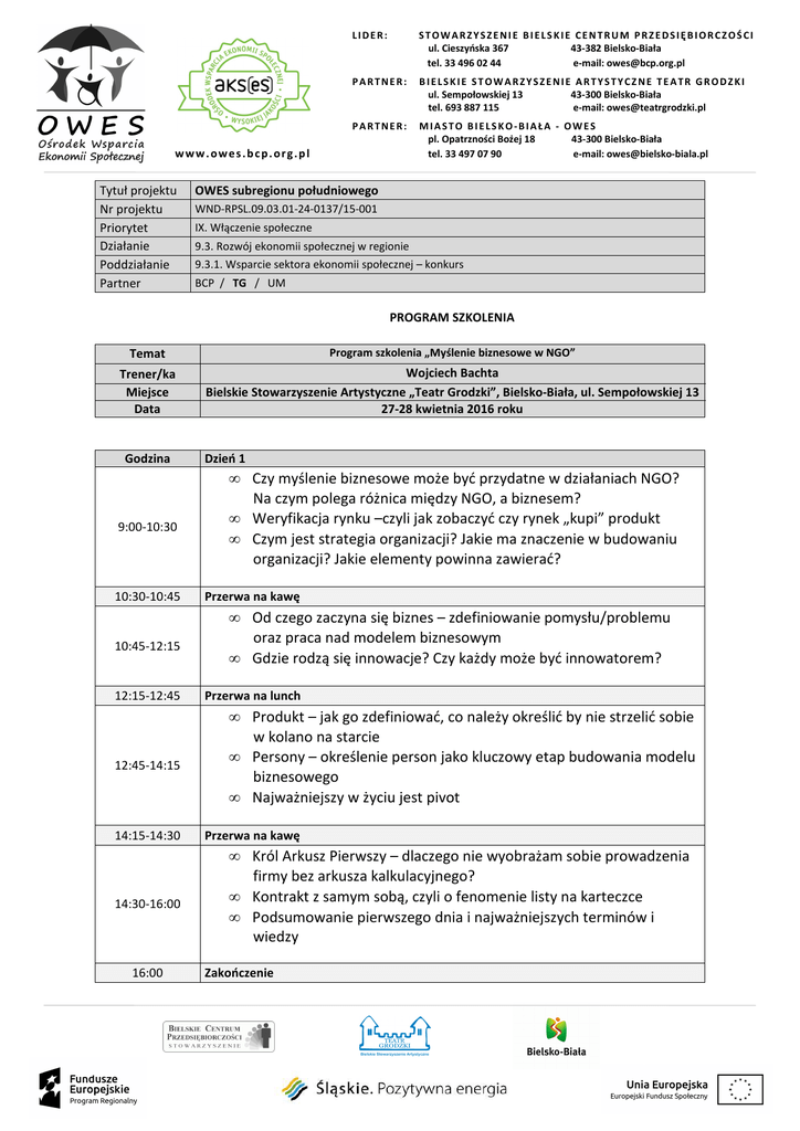 LIDER: STOWARZYSZENIE BIELSKIE CENTRUM PRZEDSIĘBIORCZOŚCI ul. Cieszyńska 367 43-382 Bielsko-Biała tel. 33 496 02 44 e-mail: [email protected] PARTNER: BIELSKIE STOWARZYSZENIE ARTYSTYCZNE TEATR GRODZKI ul. Sempołowskiej 13 43-300 Bielsko-Biała tel. 693 887 115 e-mail: [email protected] PARTNER: MIASTO BIELSKO-BIAŁA - OWES pl. Opatrzności Bożej 18 43-300 Bielsko-Biała tel. 33 497 07 90 e-mail: [email protected] www.owes.bcp.org.pl Tytuł projektu Nr projektu Priorytet Działanie Poddziałanie Partner OWES subregionu południowego WND-RPSL.09.03.01-24-0137/15-001 IX. Włączenie społeczne 9.3. Rozwój ekonomii społecznej w regionie 9.3.1. Wsparcie sektora ekonomii społecznej – konkurs BCP / TG / UM PROGRAM SZKOLENIA Temat Program szkolenia „Myślenie biznesowe w NGO” Trener/ka Miejsce Data Wojciech Bachta Bielskie Stowarzyszenie Artystyczne „Teatr Grodzki”, Bielsko-Biała, ul. Sempołowskiej 13 27-28 kwietnia 2016 roku Godzina 9:00-10:30 10:30-10:45 10:45-12:15 12:15-12:45 12:45-14:15 14:15-14:30 14:30-16:00 16:00 Dzień 1 • Czy myślenie biznesowe może być przydatne w działaniach NGO? Na czym polega różnica między NGO, a biznesem? • Weryfikacja rynku –czyli jak zobaczyć czy rynek „kupi” produkt • Czym jest strategia organizacji? Jakie ma znaczenie w budowaniu organizacji? Jakie elementy powinna zawierać? Przerwa na kawę • Od czego zaczyna się biznes – zdefiniowanie pomysłu/problemu oraz praca nad modelem biznesowym • Gdzie rodzą się innowacje? Czy każdy może być innowatorem? Przerwa na lunch • Produkt – jak go zdefiniować, co należy określić by nie strzelić sobie w kolano na starcie • Persony – określenie person jako kluczowy etap budowania modelu biznesowego • Najważniejszy w życiu jest pivot Przerwa na kawę • Król Arkusz Pierwszy – dlaczego nie wyobrażam sobie prowadzenia firmy bez arkusza kalkulacyjnego? • Kontrakt z samym sobą, czyli o fenomenie listy na karteczce • Podsumowanie pierwszego dnia i najważniejszych terminów i wiedzy Zakończenie www.owes.bcp.org.pl Godzina 9:00-10:30 10:30-10:45 10:45-12:15 12:15-12:45 12:45-14:15 14:15-14:30 14:30-16:00 16:00 LIDER: STOWARZYSZENIE BIELSKIE CENTRUM PRZEDSIĘBIORCZOŚCI ul. Cieszyńska 367 43-382 Bielsko-Biała tel. 33 496 02 44 e-mail: [email protected] PARTNER: BIELSKIE STOWARZYSZENIE ARTYSTYCZNE TEATR GRODZKI ul. Sempołowskiej 13 43-300 Bielsko-Biała tel. 693 887 115 e-mail: [email protected] PARTNER: MIASTO BIELSKO-BIAŁA - OWES pl. Opatrzności Bożej 18 43-300 Bielsko-Biała tel. 33 497 07 90 e-mail: [email protected] Dzień 2 • Czym jest biznes plan– planowanie, finansowanie, ryzyko • Biznesplan – elementy i struktura, co jest ważne, na co zwracają uwagę inwestorzy Przerwa na kawę • Analiza SWOT Przerwa na lunch • Model biznesowy CANVAS oraz model biznesu innowacyjnego Przerwa na kawę • Trochę dobrych porad na koniec – czyli bądź zawsze S.M.A.R.T. • Inne metodologie które warto znać… design thinking, prototypowanie, burza mózgów, notes złych pomysłów – główne założenia • Podsumowanie obu dni szkolenia, powtórzenie najważniejszych terminów i wiedzy oraz omówienie pytań i wątpliwości Zakończenie szkolenia