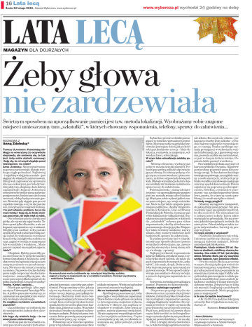 16 Lata lecą www.wyborcza.pl wychodzi 24 godziny na dobę Środa 10 lutego 2010 Gazeta Wyborcza www.wyborcza.pl + + LATA LECĄ Żeby głowa nie zardzewiała MAGAZYN DLA DOJRZAŁYCH MICHAŁ ŁEPECKI Świetnym sposobem na uporządkowanie pamięci jest tzw. metoda lokalizacji. Wyobrażamy sobie znajome miejsce i umieszczamy tam „szkatułki”, w których chowamy wspomnienia, telefony, sprawy do załatwienia... ROZMOWA Z Anną Zdebską* TOMASZ ULANOWSKI: Przechodzę niedługo na emeryturę (to oczywiście nieprawda, ale umówmy się, że tak jest, żeby sobie ułatwić rozmowę) i boję się, że mi umysł otępieje przed telewizorem. Co robić? ANNA ZDEBSKA: Mózg nieużywany W czym taka wizualizacja miałaby pomóc? na pewno zardzewieje, dlatego trzeba go ciągle pobudzać. Najłatwiej – i najefektywniej jednocześnie – jest sięgnąć do własnych zainteresowań. Mózg woli zajmować się sprawami dla nas ciekawymi, jest wtedy bardziej aktywny, skupiony, dużo łatwiej zapamiętuje i kojarzy. Jeśli praca umysłowa nie będzie panu sprawiać przyjemności, będzie pan się do niej zmuszał, efekty będą znacznie gorsze. Również gdy sięgnie pan po coś zupełnie nowego, o czym nic pan nie wie, mózg będzie reagował wolniej. I to jest właśnie problem, bo ja nie mam hobby. I boję się, że kiedy skończę pracować, nie będę miał co robić. – No to będzie przez chwilę pod górkę, ale czymś się zająć trzeba. Takim czymś tylko dla siebie, a nie zakupami, sprzątaniem czy wnukami. Mógłby pan zadbać, żeby pański umysł otrzymał codziennie małą porcję zadań do wykonania: rozwiązać krzyżówkę, łamigłówkę sudoku na czas, zagrać w brydża ze znajomymi lub w scrabble z wnukiem… Może pan też zapisać się na jakieś zajęcia. Jakie? – Obojętnie. Byleby pozwoliły panu utrzymać się w dotychczasowej formie umysłowej. Chodzi o to, żeby aktywować mózg mniej więcej na tym samym poziomie co przed emeryturą. Nie ma co się rzucać z motyką na słońce. Na pewno trudno byłoby panu nagle rozpocząć studia matematyczne – zamęczyłby się pan – ale może pan na przykład zapisać się do kółka szachowego. Gra pan wszachy? Trochę. Kiedyś częściej... – Niech pan spróbuje. Albo zapisze się na Uniwersytet Trzeciego Wieku. A jeśli to panu nie wystarczy, to zapraszam na specjalistyczne warsztaty treningu umysłowego. Co mógłbym na takich warsztatach poprawić? – Zaczęlibyśmy od cofnięcia się do umiejętności nabytych w dzieciństwie... Ale tego się właśnie boję – że na emeryturze zdziecinnieję! – Niech się pan nie boi, chodzi o to, żeby pan znowu zaczął z tych umie- Są bardzo proste techniki pomagające w robieniu wirtualnych terminarzy. Może pan sobie na przykład wyobrażać jutrzejszy dzień, jak po kolei robi pan konkretne rzeczy – idzie do lekarza, rozmawia ze znajomym, odwiedza dzieci, robi zakupy. Na emeryturze warto codziennie np. rozwiązać krzyżówkę, sudoku, zagrać w karty ze znajomymi czy w scrabble z wnukiem. Ćwiczyć wyobraźnię – radzi Anna Zdebska jętności korzystać, a nie żeby pan zdziecinniał. Przypomnimy sobie, jak się używa wyobraźni, wizualizuje sobie różne rzeczy, kojarzy, porządkuje informacje. Będziemy robić dużo ćwiczeń wspomagających koncentrację uwagi. Koncentracja błyskawicznie spada, kiedy nie trzeba planować każdego dnia, pilnować czasu. Wszystko się rozłazi i trudno się skupić na konkretnym zadaniu. Pokażę też panu ćwiczenia, które pozwolą panu poprawić efektywność pracy, np. tempo. Pobawimy się w dziecko i spróbujemy w tej zabawie zaangażować dwie półkule mózgowe. Wtedy mózg będzie pracował znacznie wydajniej. Ale co konkretnie będziemy robić? – Spróbujemy pana nauczyć, żeby pan ciągle o wszystkim nie zapominał. Starsi ludzie często gdzieś coś położą i o tym zapomną, czegoś nie wyłączą, zostawią w sklepie, nie zapłacą rachunków w terminie. Żeby temu zapobiec, należy planować swój dzień. Ale nie zapisywać wszystkiego na kartce, bo to pójście na łatwiznę. Często zresztą kończy się tak, że człowiek zastanawia się, gdzie położył „tę karteczkę”. – Mówiąc obrazowo, wydrąży pan sobie w mózgu ścieżki pamięci. Pobudzi pan prawą półkulę odpowiadającą za obrazy. I te obrazy połączy z logicznym rozumowaniem i planowaniem, za które odpowiada lewa półkula. Dlatego wizualizacja da dużo lepsze rezultaty niż zrobienie na karteczce spisu rzeczy do załatwienia. Świetną metodą – znaną od starożytności – na uporządkowanie pamięci jest tzw. metoda miejsc albo lokalizacji. Musi pan sobie wybrać jakieś znane panu miejsce, np. swoje mieszkanie. Może to być także znajome panu miejsce publiczne, choćby droga królewska w Krakowie. Idąc od Bramy Floriańskiej do Wawelu, wyznaczy pan sobie kilkanaście-kilkadziesiąt charakterystycznych punktów, w których do „szkatułek” schowa pan różne wspomnienia, choćby słówka nowo poznawanego obcego języka. Mogą to być także terminy naukowe, nazwy własne, daty, numery telefonów, kont bankowych, sprawy do załatwienia. Te punkty powinny być w charakterystyczny sposób ułożone i potem w myślach odwiedzane, np. zawsze w jedną stronę idę z lewej strony ulicy, a w drugą – z prawej. Najlepiej też każde wspomnienie kojarzyć kilkoma zmysłami naraz. Czyli nie tylko słuch i wzrok, ale także zapach wspomnień chowanych do „szkatułek”, ich smak, dotyk. Dobrze też, żeby dużo się pan przy tym ruszał, angażował emocje. W ten sposób zaktywizuje pan większe obszary mózgu, a przez to lepiej pan zapamięta to, co chce. To świetna technika porządkująca pamięć. Poprawia też koncentrację. A nauka szybkiego czytania? – Na pewno przydaje się do studiowania oraz czytania dużej ilości tekstów, z których szybko i trwale chcemy wyciągnąć i zapamiętać esencję, omijając fragmenty nieistot