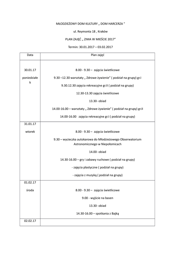 MŁODZIEŻOWY DOM KULTURY „ DOM HARCERZA ” ul. Reymonta 18 , Kraków PLAN ZAJĘĆ „ ZIMA W MIEŚCIE 2017” Termin: 30.01.2017 – 03.02.2017 Data Plan zajęć 30.01.17 8.00 - 9.30 – zajęcia świetlicowe poniedziałe k 9.30 –12.30 warsztaty „ Zdrowe żywienie” ( podział na grupy) gr.I 9.30.12.30 zajęcia rekreacyjne gr.II ( podział na grupy) 12.30-13.30 zajęcia świetlicowe 13.30- obiad 14.00-16.00 – warsztaty „ Zdrowe żywienie” ( podział na grupy) gr.II 14.00-16.00 zajęcia rekreacyjne gr.I ( podział na grupy) 31.01.17 wtorek 8.00 - 9.30 – zajęcia świetlicowe 9.30 – wycieczka autokarowa do Młodzieżowego Obserwatorium Astronomicznego w Niepołomicach 14.00- obiad 14.30-16.00 – gry i zabawy ruchowe ( podział na grupy) - zajęcia plastyczne ( podział na grupy) - zajęcia z muzyką ( podział na grupy) 01.02.17 środa 8.00 - 9.30 – zajęcia świetlicowe 9.00 - wyjście na basen 13.30- obiad 14.30-16.00 – spotkania z Bajką 02.02.17 czwartek 8.00 - 9.30 – zajęcia świetlicowe 9.30 – wycieczka piesza do Muzeum Archeologicznego 13.30- obiad 14.00-16.00 – zajęcia plastyczne ( podział na grupy) - gry i zabawy ruchowe ( podział na grupy) - zajęcia z muzyką ( podział na grupy) 03.02.17 piątek 8.00 - 9.30 – zajęcia świetlicowe 9.30 – wycieczka piesza na kopiec Kościuszki 13.30- obiad 14.00-16.00 –zajęcia rekreacyjne na podział na grupy Organizatorzy półkolonii „ Zima mieście” turnus I, zastrzegają sobie prawo do zmian organizacyjnych w powyższym planie.
