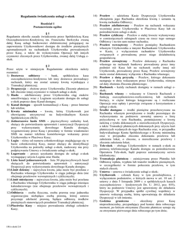 Regulamin świadczenia usługi e-skok Rozdział 1 Postanowienia ogólne §1 Regulamin określa zasady świadczenia przez Spółdzielczą Kasę Oszczędnościowo-Kredytową im. Franciszka Stefczyka zwaną dalej Kasą usługi bankowości elektronicznej polegającej na zapewnieniu Użytkownikowi dostępu do środków pieniężnych zgromadzonych na rachunkach Użytkownika prowadzonych przez Kasę, a także do wykonywania Operacji lub innych czynności zleconych przez Użytkownika, zwanej dalej Usługą eskok. §2 Przez użyte w niniejszym Regulaminie określenia należy rozumieć: 1) Dostawca odbiorcy – bank, spółdzielcza kasa oszczędnościowo-kredytowa lub inny dostawca prowadzący rachunek, który ma zostać uznany kwotą wynikająca z Transakcji płatniczej; 2) Dyspozycja – złożone przez Użytkownika Zlecenie płatnicze lub zlecenie innej czynności w ramach usługi e-skok; 3) Hasło – zdefiniowany przez Użytkownika ciąg znaków umożliwiający wraz z Loginem uzyskanie dostępu do usługi e-skok poprzez dany Kanał dostępu; 4) Kanał dostępu – sposób komunikacji z Kasą – przez Internet lub telefon; 5) Kwota minimalna – kwota, którą Użytkownik jest obowiązany utrzymywać na Indywidualnym Koncie Spółdzielczym (IKS); 6) Jednorazowe hasło SMS – pięciocyfrowy unikalny kod, służący do potwierdzania uprawnień i autoryzacji Dyspozycji przy wykorzystaniu dowolnego Kanału dostępu, wygenerowany przez Kasę i przesłany w formie wiadomości SMS na numer telefonu komórkowego wskazany przez Użytkownika w Placówce Kasy; 7) Login – różny od numeru członkowskiego znajdującego się w bazie członkowskiej Kasy, numer służący do identyfikacji Użytkownika na potrzeby usługi e-skok, nadawany mu przy podpisywaniu Umowy o świadczenie usługi e-skok; 8) Logowanie – proces uzyskania dostępu do usługi e-skok wymagający użycia Loginu oraz Hasła; 9) Lista haseł jednorazowych – lista 50 pięciocyfrowych haseł służących do potwierdzania uprawnień i autoryzacji Dyspozycji przy wykorzystaniu dowolnego Kanału dostępu; 10) Limit dzienny – najwyższa kwota, jaka może być przelana z Rachunku własnego Użytkownika w ciągu jednego dnia (nie obejmuje przelewów wewnętrznych i cyklicznych); 11) Limit miesięczny – najwyższa kwota, jaka może być przelana z Rachunku własnego Użytkownika w ciągu jednego miesiąca kalendarzowego (nie obejmuje przelewów wewnętrznych i cyklicznych); 12) Odbiorca – osoba fizyczna, osoba prawna oraz jednostka organizacyjna niebędąca osobą prawną, której ustawa przyznaje zdolność prawną, będąca odbiorcą środków pieniężnych stanowiących przedmiot Transakcji płatniczej; 13) Placówka Kasy – miejsce prowadzenia obsługi członków Kasy; I/R/e-skok/2.0 14) Przelew – udzielona Kasie Dyspozycja Użytkownika obciążenia jego Rachunku określona kwotą i uznania tą kwotą rachunku Odbiorcy; 15) Przelew zdefiniowany – Przelew na rachunek wskazany wcześniej przez Użytkownika w Placówce Kasy lub za pośrednictwem usługi e-skok; 16) Przelew cykliczny – Przelew o stałej kwocie wykonywany w comiesięcznych odstępach czasu na rzecz tego samego Odbiorcy i na ten sam numer rachunku; 17) Przelew wewnętrzny – Przelew pomiędzy Rachunkiem własnym Użytkownika a innymi Rachunkami Użytkownika w Kasie, z wyłączeniem rachunków Użytkownika związanych z prowadzoną przez niego działalnością gospodarczą; 18) Przelew zewnętrzny - Przelew dokonany z Rachunku własnego na rachunek bankowy prowadzony przez inny podmiot niż Kasa lub na rachunek osoby innej niż Użytkownik, prowadzony przez Kasę. Przelew zewnętrzny może zostać dokonany wyłącznie z Rachunku własnego; 19) Przelew z datą przyszłą – Przelew, którego dokonanie następuje w dniu wskazanym przez Użytkownika, różnym od daty złożenia Zlecenia płatniczego; 20) Rachunek – każdy rachunek dostępny w ramach usługi eskok; 21) Rachunek własny – wskazany w Umowie Rachunek z funkcją oszczędnościowo-rozliczeniową lub rachunek bieżący, w ciężar którego księgowane są i rozliczane Operacje oraz opłaty i prowizje związane z korzystaniem z usługi e-skok; 22) Środki dostępne – środki pieniężne przechowywane na Rachunku własnym powiększone o środki pozostające do wykorzystania na podstawie zawartej umowy o linię pożyczkową w tym Rachunku, pomniejszone o kwotę należną z tytułu dokonanych a nierozliczonych Dyspozycji, a także Transakcji płatniczych dokonanych przy użyciu kart płatniczych wydanych do tego Rachunku oraz, w przypadku Indywidualnego Konta Spółdzielczego o Kwotę minimalną oraz w przypadku zlecenia dokonania przelewu lub założenia lokat, o zlecone, a nierozliczone przelewy i zlecenia założenia lokat; 23) Tele-skok – obsługa Użytkowników w ramach e-skok za pomocą telefonicznego Kanału dostępu za pośrednictwem Operatora Tele-skok, bądź poprzez automatyczny serwis telefoniczny; 24) Transakcja płatnicza – zainicjowana przez Płatnika lub Odbiorcę wpłata, wypłata lub transfer środków pieniężnych, w szczególności w formie polecenia przelewu, w tym stałych zleceń; 25) Umowa – umowa o świadczenie usługi e-skok; 26) Użytkownik – członek Kasy w tym przedsiębiorca, z wyłączeniem podmiotów, o których mowa w art. 10 ust. 2 ustawy z dnia 5 listopada 2009 r. o spółdzielczych kasach oszczędnościowo – kredytowych Dz. U. 2012, poz. 855), który na podstawie Umowy jest uprawniony do składania Dyspozycji. W przypadku spółki cywilnej wspólnicy w umowie wskazują osobę, którą upoważniają do składania Dyspozycji w ich imieniu; 27) Godzina graniczna – określony przez Kasę nieprzekraczalny, przypadający pod koniec dnia roboczego moment, po którym otrzymane Zlecenie płatnicze uznaje się za otrzymane pierwszego dnia roboczego po tym dniu; 28) Zlecenie płatnicze – oświadczenie Płatnika lub Odbiorcy skierowane do jego dostawcy zawierające po