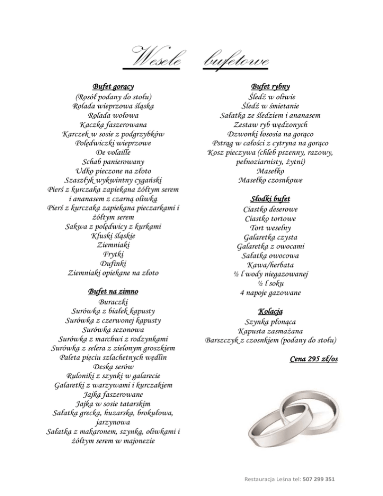 Wesele bufetowe Bufet gorący (Rosół podany do stołu) Rolada wieprzowa śląska Rolada wołowa Kaczka faszerowana Karczek w sosie z podgrzybków Polędwiczki wieprzowe De volaille Schab panierowany Udko pieczone na złoto Szaszłyk wykwintny cygański Pierś z kurczaka zapiekana żółtym serem i ananasem z czarną oliwką Pierś z kurczaka zapiekana pieczarkami i żółtym serem Sakwa z polędwicy z kurkami Kluski śląskie Ziemniaki Frytki Dufinki Ziemniaki opiekane na złoto Bufet na zimno Buraczki Surówka z białek kapusty Surówka z czerwonej kapusty Surówka sezonowa Surówka z marchwi z rodzynkami Surówka z selera z zielonym groszkiem Paleta pięciu szlachetnych wędlin Deska serów Ruloniki z szynki w galarecie Galaretki z warzywami i kurczakiem Jajka faszerowane Jajka w sosie tatarskim Sałatka grecka, huzarska, brokułowa, jarzynowa Sałatka z makaronem, szynką, oliwkami i żółtym serem w majonezie Bufet rybny Śledź w oliwie Śledź w śmietanie Sałatka ze śledziem i ananasem Zestaw ryb wędzonych Dzwonki łososia na gorąco Pstrąg w całości z cytryna na gorąco Kosz pieczywa (chleb pszenny, razowy, pełnoziarnisty, żytni) Masełko Masełko czosnkowe Słodki bufet Ciastko deserowe Ciastko tortowe Tort weselny Galaretka czysta Galaretka z owocami Sałatka owocowa Kawa/herbata ½ l wody niegazowanej ½ l soku 4 napoje gazowane Kolacja Szynka płonąca Kapusta zasmażana Barszczyk z czosnkiem (podany do stołu) Cena 295 zł/os Restauracja Leśna tel: 507 299 351