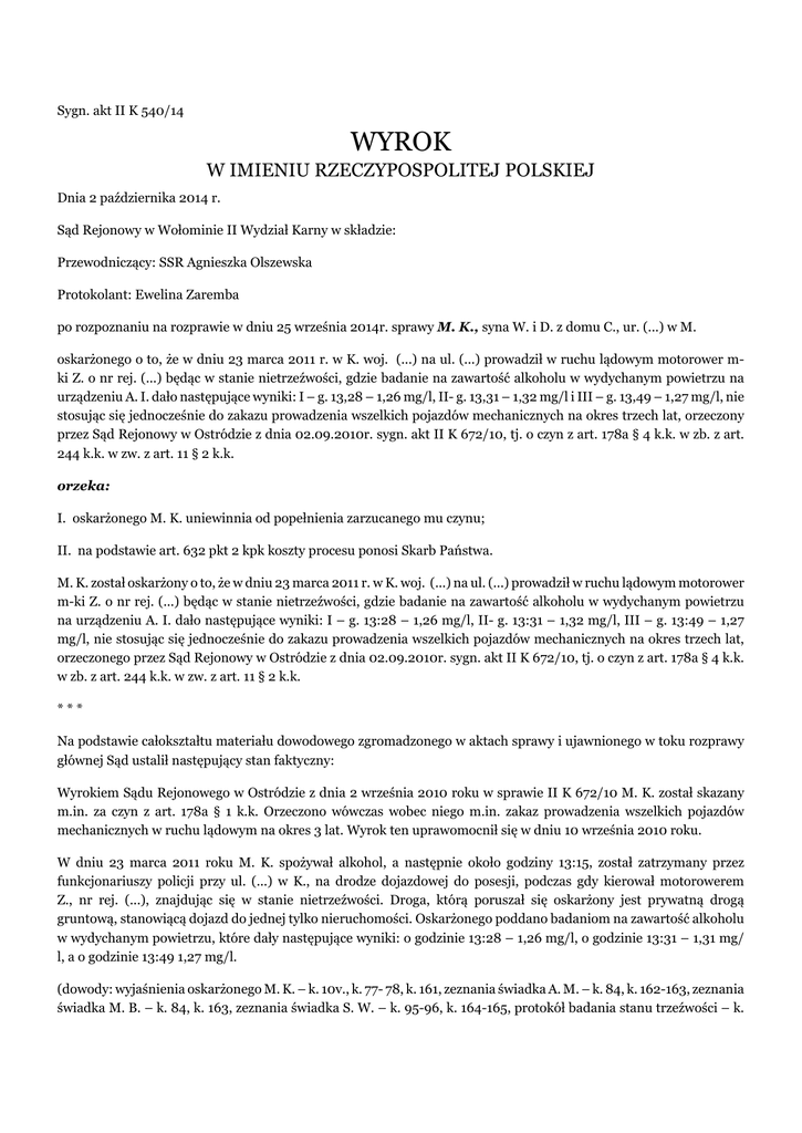 Sygn. akt II K 540/14 WYROK W IMIENIU RZECZYPOSPOLITEJ POLSKIEJ Dnia 2 października 2014 r. Sąd Rejonowy w Wołominie II Wydział Karny w składzie: Przewodniczący: SSR Agnieszka Olszewska Protokolant: Ewelina Zaremba po rozpoznaniu na rozprawie w dniu 25 września 2014r. sprawy M. K., syna W. i D. z domu C., ur. (...) w M. oskarżonego o to, że w dniu 23 marca 2011 r. w K. woj. (...) na ul. (...) prowadził w ruchu lądowym motorower mki Z. o nr rej. (...) będąc w stanie nietrzeźwości, gdzie badanie na zawartość alkoholu w wydychanym powietrzu na urządzeniu A. I. dało następujące wyniki: I – g. 13,28 – 1,26 mg/l, II- g. 13,31 – 1,32 mg/l i III – g. 13,49 – 1,27 mg/l, nie stosując się jednocześnie do zakazu prowadzenia wszelkich pojazdów mechanicznych na okres trzech lat, orzeczony przez Sąd Rejonowy w Ostródzie z dnia 02.09.2010r. sygn. akt II K 672/10, tj. o czyn z art. 178a § 4 k.k. w zb. z art. 244 k.k. w zw. z art. 11 § 2 k.k. orzeka: I. oskarżonego M. K. uniewinnia od popełnienia zarzucanego mu czynu; II. na podstawie art. 632 pkt 2 kpk koszty procesu ponosi Skarb Państwa. M. K. został oskarżony o to, że w dniu 23 marca 2011 r. w K. woj. (...) na ul. (...) prowadził w ruchu lądowym motorower m-ki Z. o nr rej. (...) będąc w stanie nietrzeźwości, gdzie badanie na zawartość alkoholu w wydychanym powietrzu na urządzeniu A. I. dało następujące wyniki: I – g. 13:28 – 1,26 mg/l, II- g. 13:31 – 1,32 mg/l, III – g. 13:49 – 1,27 mg/l, nie stosując się jednocześnie do zakazu prowadzenia wszelkich pojazdów mechanicznych na okres trzech lat, orzeczonego przez Sąd Rejonowy w Ostródzie z dnia 02.09.2010r. sygn. akt II K 672/10, tj. o czyn z art. 178a § 4 k.k. w zb. z art. 244 k.k. w zw. z art. 11 § 2 k.k. *** Na podstawie całokształtu materiału dowodowego zgromadzonego w aktach sprawy i ujawnionego w toku rozprawy głównej Sąd ustalił następujący stan faktyczny: Wyrokiem Sądu Rejonowego w Ostródzie z dnia 2 września 2010 roku w sprawie II K 672/10 M. K. został skazany m.in. za czyn z art. 178a § 1 k.k. Orzeczono wówczas wobec niego m.in. zakaz prowadzenia wszelkich pojazdów mechanicznych w ruchu lądowym na okres 3 lat. Wyrok ten uprawomocnił się w dniu 10 września 2010 roku. W dniu 23 marca 2011 roku M. K. spożywał alkohol, a następnie około godziny 13:15, został zatrzymany przez funkcjonariuszy policji przy ul. (...) w K., na drodze dojazdowej do posesji, podczas gdy kierował motorowerem Z., nr rej. (...), znajdując się w stanie nietrzeźwości. Droga, którą poruszał się oskarżony jest prywatną drogą gruntową, stanowiącą dojazd do jednej tylko nieruchomości. Oskarżonego poddano badaniom na zawartość alkoholu w wydychanym powietrzu, które dały następujące wyniki: o godzinie 13:28 – 1,26 mg/l, o godzinie 13:31 – 1,31 mg/ l, a o godzinie 13:49 1,27 mg/l. (dowody: wyjaśnienia oskarżonego M. K. – k. 10v., k. 77- 78, k. 161, zeznania świadka A. M. – k. 84, k. 162-163, zeznania świadka M. B. – k. 84, k. 163, zeznania świadka S. W. – k. 95-96, k. 164-165, protokół badania stanu trzeźwości – k. 2, odpis wyroku k. 6-7 wypis i wyrys z rejestru gruntów – k. 91-93, fotografia – k. 94 opinia sądowo psychiatryczna – k. 54) Powyższy stan faktyczny sąd ustalił na podstawie ww. dowodów oraz pozostałego uznanego za wiarygodny materiału dowodowego zgromadzonego w sprawie i ujawnionego w toku rozprawy głównej. Oskarżony M. K. w toku postępowania przygotowawczego przyznał się do popełnienia zarzucanego mu czynu, wyjaśnił też, że spożył wówczas 7 piw (k. 10v.). Składając wyjaśnienia w postępowaniu jurysdykcyjnym oskarżony podtrzymał swoje oświadczenie, iż w chwili zatrzymania kierował motorowerem, wskazał jednak, że jechał nim nie po drodze publicznej, a po prywatnej drodze dojazdowej do posesji. Podczas rozprawy głównej, przeprowadzonej w wyniku przekazania sprawy do ponownego rozpatrzenia wyrokiem Sądu Okręgowego Warszawa-Praga w Warszawie z dn. 1 lipca 2014 r., sygn. akt VI Ka 137/14 oskarżony skorzystał z prawa do odmowy składania wyjaśnień oraz potwierdził swoje wcześniejsze stanowisko w sprawie. W ocenie sądu wyjaśnienia oskarżonego M. K. w całości polegają na prawdzie. Są one logiczne i spójne, wolne od wewnętrznych sprzeczności, znajdują potwierdzenie w pozostałym, zgromadzonym w sprawie wiarygodnym materiale dowodowym. Co więcej, wyjaśnienia te korespondują z zeznaniami wszystkich przesłuchanych w toku postępowania świadków. Zważyć należy, że świadkowie A. M. i M. B., będący funkcjonariuszami Policji, którzy dokonali zatrzymania oskarżonego, nie zakwestionowali faktu, iż poruszał się on drogą dojazdową do posesji. Z uwagi na powyższe wyjaśnienia oskarżonego w tym zakresie również nie budzą wątpliwości sądu, znajdując ponadto potwierdzenie w dowodzie z dokumentów (k. 91-93, k. 162-163). Polegają na prawdzie zeznania świadków A. M. i M. B. (k. 84, k. 162, k. 163). Ww. świadkowie są funkcjonariuszami Policji, nie mieli powodu by narażając się na odpowiedzialność karną, zeznawać w nieniejszej sprawie nieprawdę, fałszywie obciążając oskarżonego. Co do zasady zeznania wskazanych świadków są zgodne, korespondują ze sobą, jak również z pozostałym zgromadzonym w sprawie materiałem dowodowym. Na ocenę wiarygodności ww. zeznań nie mogły wpłynąć negatywnie drobne nieścisłoci, w szczególności w zeznaniach A. M., która podczas prowadzonego uprzednio postępowania sądowego wskazała, że droga dojazdowa prowadziła do kilku posesji, co nie znalazło potwierdzenia w przedstawionej sądowi dokumentacji fotograficznej (k. 94). Nieścisłość tę, w ocenie sądu, tłumaczyć należy upływem czasu oraz faktem, iż w ramach podejmowanych czynności służbowych ww. funkcjonariusze przeprowadzają wiele podobnych interwencji, co powoduje zacieranie się w ich pam