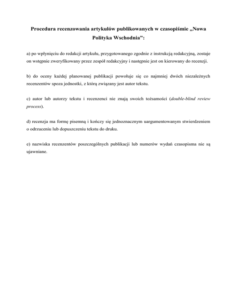 Procedura recenzowania artykułów publikowanych w czasopiśmie „Nowa Polityka Wschodnia”: a) po wpłynięciu do redakcji artykułu, przygotowanego zgodnie z instrukcją redakcyjną, zostaje on wstępnie zweryfikowany przez zespół redakcyjny i następnie jest on kierowany do recenzji. b) do oceny każdej planowanej publikacji powołuje się co najmniej dwóch niezależnych recenzentów spoza jednostki, z którą związany jest autor tekstu. c) autor lub autorzy tekstu i recenzenci nie znają swoich tożsamości (double-blind review process). d) recenzja ma formę pisemną i kończy się jednoznacznym uargumentowanym stwierdzeniem o odrzuceniu lub dopuszczeniu tekstu do druku. e) nazwiska recenzentów poszczególnych publikacji lub numerów wydań czasopisma nie są ujawniane.