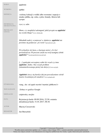 HASŁO appletini WYMOWA apltini DEFINICJA «zielony koktajl z wódki albo wermutu i napoju o smaku jabłka, np. soku, cydru, brandy, likieru lub syropu» INFORMACJA GRAMATYCZNA rzecz n, ndm PRZYKŁADY UŻYCIA Hmm, czy mogłabyś udostępnić jakiś przepis na appletini na swoim blogu? (www.2drink.pl). Składniki należy wymieszać w shakerze, appletini nie powinno się podawać „on rocks” (pizzadostawa.pl). Przychodzisz do baru, a barman mówi: „Co byś powiedział na 50 procent zniżki na twój następny drink appletini?” (monitorpolskislowian.iq24.pl). […] spokojnie serwujemy sobie kir royal czy inne appletini. Jedno. Nas wszak problem [nieumiarkowanego picia] nie dotyczy (www.styl.pl). Appletini cieszy się bardzo dużym powodzeniem wśród fanów kwaśniejszych smaków! (www.pitupitu.pl). ETYMOLOGIA WIZUALIZACJE <ang., skr. od apple martini ‘martini jabłkowe’> Zobacz w grafice Google ODSYŁACZE caipiroska, mojito DATA Rejestracja hasła: 09.09.2016, 22.50, ostatnia aktualizacja hasła: 31.01.2017, 00.36 AUTOR Maciej Czeszewski REDAKTOR Jan Burzyński Copyright © Uniwersytet Warszawski Wszelkie prawa zastrzeżone zgodnie z art.17 ustawy z dnia 4 lutego 1994 r. o prawie autorskim i prawach pokrewnych. Teksty oraz zdjęcia zawarte w tym dokumencie nie mogą być publikowane bez wiedzy i zgody właściciela praw autorskich. Powered by TCPDF (www.tcpdf.org)