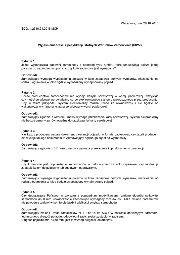 Warszawa, dnia 28.10.2016 BDG.III.2510.21.2016.MCH Wyjaśnienia treści Specyfikacji Istotnych Warunków Zamówienia (SIWZ) Pytanie 1: Jeżeli wykonawcza zapewni samochody z oponami typu runflat, które umożliwiają dalszą jazdę pojazdu po uszkodzeniu opony, to czy koło zapasowe jest wymagane? Odpowiedź: Zamawiający wymaga wyposażenia pojazdu w koło zapasowe pełnych wymiarów, niezależnie od rodzaju ogumienia w jakie będzie wyposażony wynajmowany pojazd. Pytanie 2: Część producentów samochodów nie wydaje książki serwisowej w wersji papierowej, wszystkie czynności serwisowe wprowadzane są do elektronicznego systemu prowadzonego przez producenta. Czy w takim przypadku system elektroniczny można uznać za równoważny i nie będzie od wykonawczy wymagana książka serwisowa w wersji papierowej. Odpowiedź: Zamawiający zgodnie z wzorem umowy wymaga przekazania karty serwisowej. System elektroniczny nie będzie uznany za równoważny do przekazania karty serwisowej. Pytanie 3: Nie każdy producent wydaje dokument gwarancji pojazdu w formie papierowej, czy jeżeli producent nie wydaje takiego dokumentu to Zamawiający będzie go żądał od wykonawcy. Odpowiedź: Zamawiający zgodnie z §11 wzoru umowy wymaga przekazania kopii dokumentu gwarancji. Pytanie 4: Czy konieczne jest doposażenie samochodów w pełnowymiarowe koło zapasowe, czy można je zastąpić kołem dojazdowym lub zestawem naprawczym. Odpowiedź: Zamawiający wymaga wyposażenia pojazdu w koło zapasowe pełnych wymiarów, niezależnie od rodzaju ogumienia w jakie będzie wyposażony wynajmowany pojazd. Pytanie 5: Czy dopuszczają Państwo, w związku z poprzednimi modyfikacjami, zmianę długości całkowitej samochodu 4630 mm, równocześnie zachowując wymagany rozstaw osi. Taka zmiana parametrów nie powoduje zmiany w komforcie jazdy i wielkości wnętrza samochodu. Odpowiedź: Zamawiający zmienił treść załączników nr 1 i nr 1a do SIWZ w zakresie dotyczącym parametru technicznego długość pojazdu, odpowiedni zapis został zastąpiony zapisem: Długość pojazdu min. 4750 mm, jest to wymóg długości ostateczny. Pytanie 6: Czy dopuszczają Państwo skórę ekologiczną na fotelach? Jest to materiał lepszej jakości niż alkantara, na którą wyrazili Państwo zgodę. Odpowiedź: Zamawiający zmienił treść załączników nr 1 i nr 1a do SIWZ w zakresie dotyczącym minimalnego wyposażenia, odpowiedni zapis został zastąpiony zapisem: Tapicerka skórzana lub tapicerka wykonana z materiału Alcantara lub równoważnego (w środkowej części) i skórzana na częściach bocznych. Powyższe wyjaśnienia stanowią integralną część SIWZ.
