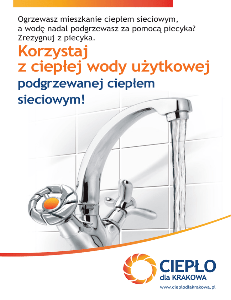 Ogrzewasz mieszkanie ciepłem sieciowym, a wodę nadal podgrzewasz za pomocą piecyka? Zrezygnuj z piecyka. Korzystaj z ciepłej wody użytkowej podgrzewanej ciepłem sieciowym! www.cieplodlakrakowa.pl Korzystasz z gazu? Musisz stale dbać o bezpieczeństwo! ! Jeśli w Twoim mieszkaniu znajduje się gazowy podgrzewacz wody, musisz bezwzględnie przestrzegać zasad montażu i eksploatacji tego urządzenia, zgodnie z wymaganiami prawa budowlanego i instrukcjami użytkowania. Aby prawidłowo, tzn. bezpiecznie i ekonomicznie spalić 1 m3 gazu, potrzeba 9 m powietrza. W efekcie tego procesu powstaje 12 m3 spalin. Jeśli do pomieszczenia będzie napływać zbyt mała ilość powietrza, nastąpi niepełne spalanie gazu. W spalinach pojawi się trujący tlenek węgla (czad), który przy niesprawnej wentylacji wywiewnej gromadzić się będzie w pomieszczeniu, a następnie będzie migrować po mieszkaniu i budynku, narażając jego mieszkańców na groźne dla zdrowia i życia zatrucie. Zastępując piecyk gazowy instalacją centralnej ciepłej wody, możesz zapomnieć o: poszukiwaniu fachowca, który naprawi piecyk, zagrożeniach, jakie stwarza niewłaściwa eksploatacja urządzeń gazowych, corocznych przeglądach ciągów spalinowych, ograniczeniach związanych z jednoczesnym korzystaniem z ciepłej wody przez wielu użytkowników w jednym mieszkaniu. Przez 10 lat funkcjonowania Programu w ponad 14 tys. mieszkań zmieniono system pozyskiwania ciepłej wody z gazowego na instalację wykorzystującą ciepło sieciowe. 4200 LICZBA PODŁĄCZONYCH MIESZKAŃ 5000 3850 3750 2500 1722 1250 1030 1250 2009 2010 2020 Łącznie 1720 0 przed 2004 2005 2006 2007 2008 2011 2012 2013 2014 ROK Rozwój Programu − liczba podłączonych mieszkań objętych zmianą systemu przygotowania ciepłej wody dla Krakowa Zdecyduj się na zmianę! Ty też wybierz wodę podgrzewaną ciepłem sieciowym Poproś zarządcę budynku, w którym mieszkasz, o przystąpienie do programu „Ciepła woda użytkowa”. Ciepła woda bez piecyka! W 2014 roku agencja badawcza TNS Polska przeprowadziła badanie satysfakcji mieszkańców budynków wielorodzinnych, którzy zastąpili ogrzewanie gazowe ciepłem sieciowym. Aż 97 proc. użytkowników jest zadowolonych z wody podgrzewanej ciepłem sieciowym. 3% Czy zmiana systemu pozyskiwania ciepłej wody na centralną ciepłą wodę spełniła Pana(i) oczekiwania? Tak 97% Nie 98 proc. użytkowników podtrzymałoby decyzję o wymianie instalacji, gdyby stanęli przed powtórnym wyborem! 90 proc. użytkowników nie odczuło uciążliwości związanej z przebiegiem prac instalacyjnych. 95 proc. użytkowników poleciłoby swoim bliskim i znajomym zmianę systemu pozyskiwania ciepłej wody z gazowego na instalację wykorzystującą ciepło sieciowe. Informacje o programie znajdziesz na: www.cieplodlakrakowa.pl Zadzwoń: 12 64 65 388, 12 64 66 404, 12 27 78 546 Napisz: [email protected] Partnerzy Programu: