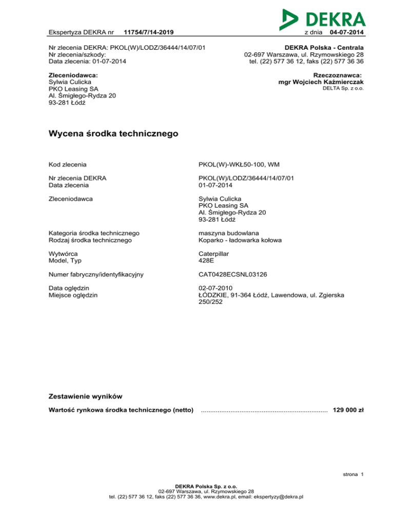 Ekspertyza DEKRA nr 11754/7/14-2019 z dnia Nr zlecenia DEKRA: PKOL(W)/LODZ/36444/14/07/01 Nr zlecenia/szkody: Data zlecenia: 01-07-2014 04-07-2014 DEKRA Polska - Centrala 02-697 Warszawa, ul. Rzymowskiego 28 tel. (22) 577 36 12, faks (22) 577 36 36 Zleceniodawca: Sylwia Culicka PKO Leasing SA Al. Śmigłego-Rydza 20 93-281 Łódź Rzeczoznawca: mgr Wojciech Kaźmierczak DELTA Sp. z o.o. Wycena środka technicznego Kod zlecenia PKOL(W)-WKŁ50-100, WM Nr zlecenia DEKRA Data zlecenia PKOL(W)/LODZ/36444/14/07/01 01-07-2014 Zleceniodawca Sylwia Culicka PKO Leasing SA Al. Śmigłego-Rydza 20 93-281 Łódź Kategoria środka technicznego Rodzaj środka technicznego maszyna budowlana Koparko - ładowarka kołowa Wytwórca Model, Typ Caterpillar 428E Numer fabryczny/identyfikacyjny CAT0428ECSNL03126 Data oględzin Miejsce oględzin 02-07-2010 ŁÓDZKIE, 91-364 Łódź, Lawendowa, ul. Zgierska 250/252 Zestawienie wyników Wartość rynkowa środka technicznego (netto) ..................................................................... 129 000 zł strona 1 DEKRA Polska Sp. z o.o. 02-697 Warszawa, ul. Rzymowskiego 28 tel. (22) 577 36 12, faks (22) 577 36 36, www.dekra.pl, email: [email protected] Ekspertyza DEKRA nr 11754/7/14-2019 z dnia 04-07-2014 Dane środka technicznego Dane ogólne Kategoria środka technicznego Rodzaj środka technicznego maszyna budowlana Koparko - ładowarka kołowa Wytwórca Model, Typ Caterpillar 428E Numer fabryczny/identyfikacyjny CAT0428ECSNL03126 Przebieg 6 511 mtg Rok produkcji 2008 Parametry techniczne Masa własna 10200 kg Moc silnika 67 kW Wyposażenie Maszyna w dniu oględzin wyposażona: - kabina operatora oszklona, - podpory hydrauliczne, - łyżka przednia dzielona, - widły, - szybkozłącze, - łyżka tylna, dodatkowo dwie łyżki: skarpowa, oraz kopiąca, - oświetlenie przednie i tylne. Zamontowane opony przód firmy Goodyear 340/80 R 18 zużycie około 95%, tył Goodyear 440/80 R 22.5 zużycie około 70%. Opis działania, przeznaczenie środka technicznego Wyceniana koparko-ładowarka firmy Caterpillar model 428E, przeznaczona jest do prac ziemnych i przeładunkowych. strona 2 DEKRA Polska Sp. z o.o. 02-697 Warszawa, ul. Rzymowskiego 28 tel. (22) 577 36 12, faks (22) 577 36 36, www.dekra.pl, email: [email protected] Ekspertyza DEKRA nr 11754/7/14-2019 z dnia 04-07-2014 Stan techniczny obiektu W dniu oględzin wykonano jazdę próbną bez obciążeń, oraz bez operatora maszyny. Praca silnika, układów: napędowego, kierowniczego, hamulcowego i jezdnego bez uwag. Deska rozdzielcza nie trzyma na zaczepach. Stwierdzono zapocenia na osprzęcie silnika. Drzwi lewe od wewnątrz na krawędzi ogniska korozji. Ramie przednie - na sworzniach luzy. Osłony boczne silnika lewa i prawa źle spasowane. Podstawa metodologiczna wyceny Aby spełnić zadanie wyceny określone potrzebą zleceniodawcy oszacowana zostanie wartość rynkowa środka technicznego, zdefiniowana w następujący sposób. Wartość rynkowa - jest to racjonalnie określona ilość pieniędzy, którą kupujący będzie skłonny zaoferować chętnemu sprzedającemu w zamian za przedmiot transakcji, przy założeniu równości stron, bez istnienia żadnego przymusu wpływającego na decyzję o zakupie i sprzedaży, przy pełnej znajomości przedmiotu i okoliczności transakcji oraz przy zachowaniu odpowiednio długiego czasu wyeksponowania przedmiotu sprzedaży na wolnym rynku. Powyższa wartość uwzględnia m.in. wytwórcę, rodzaj i zastosowanie maszyny, jej konstrukcję, kompletność, stan techniczny, wiek środka technicznego, okres i sposób eksploatacji, pozostały do dyspozycji przewidywany okres i sposób eksploatacji. Podstawą działań w wyżej wymienionym celu jest: - szczegółowa identyfikacja przedmiotu wyceny, - ustalenia dotyczące kompletności i sprawności technicznej, - ustalenia dotyczące eksploatacji (warunki, czas), - ustalenia dotyczące rynku pierwotnego Informacje o rynku i cenach Istnieje rozbudowany rynek wtórny maszyn/urządzeń przedmiotowego typu. Przykładowe oferty rynkowe maszyn/urządzeń przedmiotowego lub zbliżonego typu Lp. Producent Typ 1 Caterpillar 428E 2 Caterpillar 428E 3 Caterpillar 428E 4 Caterpillar 428E Rok Wyposażenie prod. dodatkowe 2011 wyjście do hydr.,szybkozłącze-brak, brak dod.łyż 2007 brak- szybkozłącza, brak dodatkowych łyżek, 2008 brak szybkozłącza, brak dodatkowych łyżek, 2007 brak: wideł, szybkozłącza, brak dodatkowych łyżek, Przebieg [km] 1 845 mtg Cena [zł] 186 552 Źródło oferty 7 415 mtg 143 023 5 000 mtg 135 000 Portal Autoline Portal Allegro 5 295 mtg 134 732 Portal Mobile Portal Autoline Przykładowe oferty sprzedaży maszyn o zbliżonych parametrach do wycenianej (ceny netto): 1. Portal Autoline - Koparko-Ładowarka CAT 428E, rok produkcji 2011, przebieg 1845 mtg, wyposażenie m.in: podpory, łyżka przednia dzielona, łyżka, widły, wyjście do hydrauliki, szybkozłącze - brak - 186 552 zł, strona 3 DEKRA Polska Sp. z o.o. 02-697 Warszawa, ul. Rzymowskiego 28 tel. (22) 577 36 12, faks (22) 577 36 36, www.dekra.pl, email: [email protected] Ekspertyza DEKRA nr 11754/7/14-2019 z dnia 04-07-2014 2. Portal Autoline - Koparko-Ładowarka CAT 428E, rok produkcji 2007 , przebieg 7 415 mtg, wyposażenie m.in: podpory, łyżka przednia dzielona, łyżka skarpowa, widły, szybkozłącze - brak - 143 023 zł, 3. Portal Allegro - Koparko-Ładowarka CAT 428E, rok produkcji 2008, przebieg 5 000 mtg, wyposażenie m.in: podpory, łyżka przednia dzielona, łyżka, szybkozłącze - brak - 135 000 zł, 4. Portal Mobile - Koparko-Ładowarka CAT 428E, rok produkcji 2007, przebieg 5 295 mtg, wyposażenie min: podpory, łyżka przednia dzielona, łyżka, brak: wyjścia do hydrauliki, szybkozłącza, wideł - 134 732 zł. Oszacowanie wartości środka technicznego w podejściu porównawczym Porównanie oferowanych obiektów względem obiektu wycenianego Lp. 1 2 Parametr porównawczy Wyposażenie dodatkowe Przebieg roczny Caterp