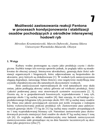 7 MoŜliwość zastosowania reakcji Fentona w procesach kondycjonowania i stabilizacji osadów pochodzących z ośrodków intensywnej hodowli ryb Mirosław Krzemieniewski, Marcin Dębowski, Joanna Sikora Uniwersytet Warmińsko-Mazurski, Olsztyn 1. Wstęp Kultury wodne postrzegane są często jako produkcja czysta i ekologiczna. Szybkie tempo ich rozwoju sprawiło jednak, Ŝe poglądy takie są nieadekwatne do obecnej sytuacji. Intensywne akwakultury, generują duŜe ilości substancji organicznych i biogennych, które odprowadzane są bezpośrednio do akwenów, przy których są zlokalizowane [1]. W wodach tych zanieczyszczenia ulęgają degradacji, naruszając bilans tlenowy oraz negatywnie modyfikują inne czynniki charakterystyczne dla naturalnych ekosystemów wodnych. Ilość zanieczyszczeń wprowadzanych do wód naturalnych oraz skala zmian, jakim podlegają akweny zaleŜy głównie od wielkości produkcji, ilości i jakości podawanej paszy oraz stosowanych systemów oczyszczania [2, 3]. Ocenia się, Ŝe w gospodarstwach łososiowych, wyprodukowanie 1 tony ryb, generuje około 1 kg suchej masy osadów [4]. Inni szacują, Ŝe od kaŜdego wyprodukowanego kilograma ryby powstaje około 303÷383 g suchej masy osadów [5]. Masa oraz jakość powstających zawiesin jest ściśle związana z rodzajem karmy wykorzystywanej podczas produkcji ryb. Zastosowanie pasz paletyzowanych generuje około 173 kg do 212 kg suchej masy osadów przypadających na 1 tonę wyprodukowanej biomasy ryb. Natomiast zastosowanie pasz ekstrudowanych pozwala zmniejszyć ilość osadów do około 87 kg suchej masy/1 tonę ryb [6]. Ze względu na skład, charakterystykę oraz ładunek zanieczyszczeń zanieczyszczenia stałe gromadzące się na dnie basenów tuczeniowych są określane jako gnojowica rybia [7]. Mirosław Krzemieniewski, Marcin Dębowski, Joanna Sikora Z ekologicznego punktu widzenia najbardziej uzasadnionym kierunkiem zagospodarowania osadów jest ich recykling i powtórne wykorzystanie. W większości przypadków ich charakterystyka i skład umoŜliwiają wprowadzenie tego odpadu do gleby z pozytywnym skutkiem dla tego środowiska. NaleŜy jednak zapewnić warunki określone w normach prawnych dotyczące stopnia uwodnienia, zawartości substancji organicznych, uciąŜliwości dla środowiska, zawartości metali cięŜkich czy organizmów chorobotwórczych. Stan obecny wymaga wdroŜenia nowych technologii, pozwalających na kształtowanie i ograniczenie, negatywnych z punktu widzenia ochrony środowiska, wskaźników fizyko – chemicznych i mikrobiologicznych. Dodatkową przesłanką skłaniającą do podjęcia badań nad unieszkodliwianiem osadów z pstrągowych gospodarstw rybackich jest konieczność przestrzegania przepisów Wspólnoty Europejskiej w tym zakresie [8]. RównieŜ międzynarodowe programy realizowane w ramach Konwencji Helsińskiej, zobowiązały nasz kraj do ograniczenia ilości odpływających zanieczyszczeń z gospodarstw rybackich [9]. Alternatywą, dla obecnie stosowanych metod, mogą stać się nowatorskie techniki, wykorzystywane z powodzeniem w technologii oczyszczania wody, ścieków oraz stabilizacji osadów ściekowych. Zaliczyć tu moŜna wydajne metody chemiczne, oparte głównie na intensywnym utlenianiu zanieczyszczeń. Jedną z metod pogłębionego utleniania jest tzw. reakcja Fentona zachodząca przy wykorzystaniu nadtlenku wodoru i jonów Ŝelaza, jako katalizatora procesu. Mechanizm reakcji prowadzi do katalitycznego rozkładu nadtlenku wodoru w obecności jonów Fe2+ lub Fe3+, w wyniku którego generowane są reaktywne rodniki hydroksylowe OH• o bardzo wysokim potencjale utleniającym wynoszącym 2,8 V [10]. Celem eksperymentu było określenie moŜliwości zastosowania techniki pogłębionego utleniania z wykorzystaniem odczynnika Fentona w procesie stabilizacji i kondycjonowania osadów pochodzących z intensywnej hodowli pstrąga tęczowego. 2. Metodyka badań Do badań wykorzystano osady pochodzące z ośrodka intensywnej hodowli pstrąga tęczowego w Rusi k. Olsztyna. Obiekt ten zasilany jest wodą z rzeki Łyny w ilości około 121000 m3/d. Gospodarstwo uŜytkuje 15 basenów tuczeniowych o łącznej powierzchni 3360 m2, zbudowanych z koryt przepływowych oraz wydzielonej części osadowej. Wydzielone osady odprowadzane są do odstojnika, spełniającą funkcje magazynujące. Materiał wykorzystywany w eksperymencie pobierano kaŜdorazowo z osadowej części basenów tuczeniowych. Parametry fizyczno-chemiczne testowanego osadu przedstawia tabela 1. 100 Środkowo-Pomorskie Towarzystwo Naukowe Ochrony Środowiska MoŜliwość zastosowania reakcji Fentona w procesach kondycjonowania ... Tabela 1. Charakterystyka osadów wykorzystywanych w doświadczeniu Table 1. Characteristics of the sludge used in the experiment Parametr CSK (czas ssania kapilarnego) Sucha masa Substancje mineralne Substancje lotne ChZT filtratu (Cr) Odczyn Jednostka Wartość min. Wartość max. Średnia [s] 320 530 425 35,73 15,81 19,92 432,9 5,84 54,85 26,96 27,89 508,5 6,06 43,02 21,38 23,90 470,7 5,95 3 [g/dm ] [g/dm3] [g/dm3] [mg O2/dm3] [pH] Doświadczenie przebiegało w skali laboratoryjnej, w temperaturze otoczenia, mieszczącej się w zakresie od 20ºC do 25ºC. Przeprowadzono je w czterech seriach badawczych róŜniących się od siebie dawkami wykorzystywanych reagentów chemicznych (tabela 2). Testowane w trakcie eksperymentu ilości jonów Fe3+ oraz H2O2 zostały określone na podstawie danych literaturowych oraz doświadczeń własnych autorów [12, 13]. Źródłem jonów Ŝelaza (III) był 40% roztwór Fe2(SO4)3, nadtlenek wodoru wprowadzano do układu technologicznego w postaci 30% roztworu perhydrolu. Tabela 2. Dawki reagentów chemicznych wykorzystywanych w badaniach Table 2. Doses of the reacting substances applied in the experiment SERIA I II III IV Fe3+ [g/dm3] 0,50 0,75 1,00 2,00 REAGENT CHEMICZNY H2O2 [g/dm3] 2,00 3,00 4,00 8,00 Badania przeprowadzono przy wykorzyst