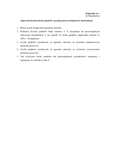 Załącznik nr 1 do Regulaminu Algorytm liczenia liczby punktów uzyskanych na świadectwie maturalnym 1. Brane są pod uwagę tylko egzaminy pisemne. 2. Podstawą liczenia punktów będą wartości w % przypisane do poszczególnych zdawanych przedmiotów w ten sposób, Ŝe liczba punktów odpowiada wartości % (50% = 50 punktów) 3. Liczbę punktów uzyskanych za egzamin zdawany na poziomie podstawowym mnoŜymy przez 0,4. 4. Liczbę punktów uzyskanych za egzamin zdawany na poziomie rozszerzonym mnoŜymy przez 0,6. 5. Tak wyliczone liczby punktów dla poszczególnych przedmiotów sumujemy i wpisujemy do wniosku w pkt. 6.