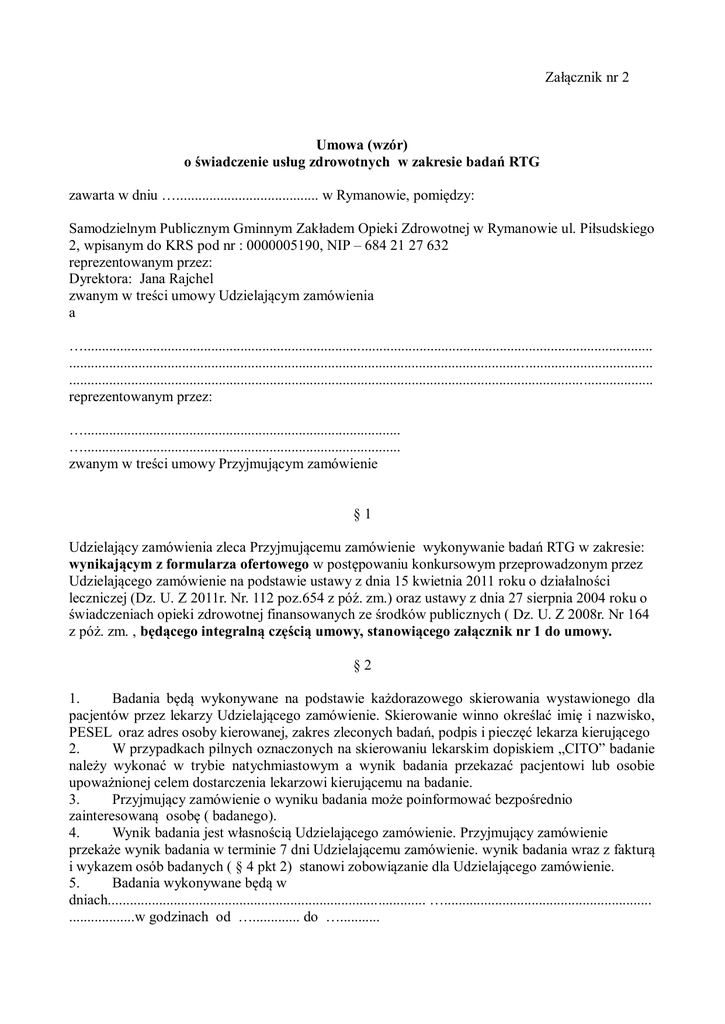 Załącznik nr 2 Umowa (wzór) o świadczenie usług zdrowotnych w zakresie badań RTG zawarta w dniu …....................................... w Rymanowie, pomiędzy: Samodzielnym Publicznym Gminnym Zakładem Opieki Zdrowotnej w Rymanowie ul. Piłsudskiego 2, wpisanym do KRS pod nr : 0000005190, NIP – 684 21 27 632 reprezentowanym przez: Dyrektora: Jana Rajchel zwanym w treści umowy Udzielającym zamówienia a …............................................................................................................................................................ ................................................................................................................................................................ ................................................................................................................................................................ reprezentowanym przez: …....................................................................................... …....................................................................................... zwanym w treści umowy Przyjmującym zamówienie §1 Udzielający zamówienia zleca Przyjmującemu zamówienie wykonywanie badań RTG w zakresie: wynikającym z formularza ofertowego w postępowaniu konkursowym przeprowadzonym przez Udzielającego zamówienie na podstawie ustawy z dnia 15 kwietnia 2011 roku o działalności leczniczej (Dz. U. Z 2011r. Nr. 112 poz.654 z póź. zm.) oraz ustawy z dnia 27 sierpnia 2004 roku o świadczeniach opieki zdrowotnej finansowanych ze środków publicznych ( Dz. U. Z 2008r. Nr 164 z póż. zm. , będącego integralną częścią umowy, stanowiącego załącznik nr 1 do umowy. §2 1. Badania będą wykonywane na podstawie każdorazowego skierowania wystawionego dla pacjentów przez lekarzy Udzielającego zamówienie. Skierowanie winno określać imię i nazwisko, PESEL oraz adres osoby kierowanej, zakres zleconych badań, podpis i pieczęć lekarza kierującego 2. W przypadkach pilnych oznaczonych na skierowaniu lekarskim dopiskiem „CITO” badanie należy wykonać w trybie natychmiastowym a wynik badania przekazać pacjentowi lub osobie upoważnionej celem dostarczenia lekarzowi kierującemu na badanie. 3. Przyjmujący zamówienie o wyniku badania może poinformować bezpośrednio zainteresowaną osobę ( badanego). 4. Wynik badania jest własnością Udzielającego zamówienie. Przyjmujący zamówienie przekaże wynik badania w terminie 7 dni Udzielającemu zamówienie. wynik badania wraz z fakturą i wykazem osób badanych ( § 4 pkt 2) stanowi zobowiązanie dla Udzielającego zamówienie. 5. Badania wykonywane będą w dniach....................................................................................... …......................................................... ..................w godzinach od …............. do …........... §3 1. Za wykonane badania Przyjmujący zamówienie pobierał będzie wynagrodzenie w wysokości obliczonej na podstawie cen z załącznika nr 1 do niniejszej umowy, 2. Rozliczenie realizowane będzie w okresach miesięcznych. Faktura dotycząca płatności za dany okres będzie wystawiona do 10 dnia następnego miesiąca. Faktura winna zawierać specyfikację z wykazem badanych osób, rodzajem wykonanych badań oraz imieniem i nazwiskiem lekarza kierującego. 3. Należność za badania płatna będzie w terminie 14 dni od dnia doręczenia faktury na rachunek bankowy Przyjmującego zamówienie podany na fakturze. 4. W przypadku opóźnienia w zapłacie Udzielający zamówienie zapłaci Przyjmującemu zamówienie odsetki ustawowe. 5. Przyjmujący zamówienie uprawniony jest do odmowy wykonania badań w przypadku opóźnienia w zapłacie wynagrodzenia wynoszącego powyżej 30 dni. 6. Przyjmujący zamówienie na wniosek Udzielającego zamówienia ma obowiązek poddania się kontroli w zakresie wynikającym z przedmiotu umowy ( art. 27 ust.2 pkt.4 ustawy z dnia 15 kwietnia 2011 r. o działalności leczniczej Dz. U. Z 2011 r. Nr 112, poz. 654 z póź. zm). §4 Strony zawierają umowę na okres do 31 grudnia 2013 roku. Umowa może zostać rozwiązana przez każdą ze stron na koniec miesiąca za jednomiesięcznym okresem wypowiedzenia. §5 Zmiany umowy mogą mieć miejsce jedynie w formie pisemnego aneksu do umowy. Zmiany nie mogą dotyczyć cen jednostkowych za wykonanie badań. §6 Wszelkie spory na tle umowy, strony będą rozstrzygać polubownie. W razie niemożliwości polubownego rozwiązania sporu Sądem właściwym będzie Sąd miejscowy dla Udzielającego zamówienie. §7 Umowę sporządzono w 2 jednobrzmiących egzemplarzach dla każdej ze stron. Udzielający zamówienie: Przyjmujący zamówienie: