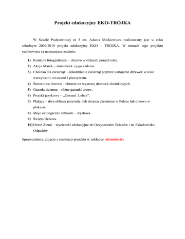 Projekt edukacyjny EKO-TRÓJKA W Szkole Podstawowej nr 3 im. Adama Mickiewicza realizowany jest w roku szkolnym 2009/2010 projekt edukacyjny EKO – TRÓJKA. W ramach tego projektu realizowane są następujące zadania: 1) Konkurs fotograficzny – drzewo w różnych porach roku. 2) Akcja Marek – śmieciarek i jego zadania. 3) Choinka dla zwierząt – dokarmianie zwierząt poprzez ustrojenie drzewek w lesie warzywami, owocami i pieczywem. 4) Śmieciowe drzewo – ubranie na wystawę drzewek choinkowych. 5) Gazetka ścienna – różne gatunki drzew. 6) Projekt językowy – „Gesund Leben”. 7) Plakaty – dwa oblicza przyrody, lub drzewa chronione w Polsce lub drzewo w plakacie. 8) Moje ekologiczne zabawki – wystawa. 9) Święto Drzewa. 10) Dzień Ziemi – wycieczki edukacyjne do Oczyszczalni Ścieków i na Składowisko Odpadów. Sprawozdania, zdjęcia z realizacji projektu w zakładce Aktualności.