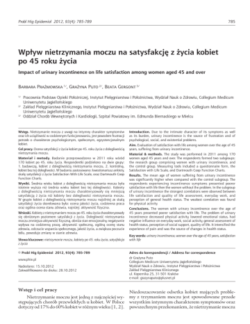 Prażmowska Probl Hig Epidemiol B, Puto G, 2012, Gergont 93(4): B. 785-789 Wpływ nietrzymania moczu na satysfakcję z życia kobiet po 45 roku życia 785 Wpływ nietrzymania moczu na satysfakcję z życia kobiet po 45 roku życia Impact of urinary incontinence on life satisfaction among women aged 45 and over Barbara Prażmowska 1/, Grażyna Puto 2/, Beata Gergont 3/ Pracownia Podstaw Opieki Położniczej, Instytut Pielęgniarstwa i Położnictwa, Wydział Nauk o Zdrowiu, Collegium Medicum Uniwersytetu Jagiellońskiego 2/ Zakład Pielęgniarstwa Klinicznego, Instytut Pielęgniarstwa i Położnictwa, Wydział Nauk o Zdrowiu, Collegium Medicum Uniwersytetu Jagiellońskiego 3/ Oddział Chorób Wewnętrznych i Kardiologii, Szpital Powiatowy im. Edmunda Biernackiego w Mielcu 1/ Wstęp. Nietrzymanie moczu z uwagi na intymny charakter symptomów oraz ich uciążliwość w codziennym funkcjonowaniu, jest powodem frustracji potrzeb o charakterze psychologicznym, społecznym, egzystencjonalnym kobiet. Cel pracy. Ocena satysfakcji z życia kobiet po 45. roku życia z dolegliwością nietrzymania moczu. Materiał i metody. Badanie przeprowadzono w 2011 roku wśród 170 kobiet po 45. roku życia. Respondentki podzielono na dwie grupy: 1. badawczą, kobiet z dolegliwością nietrzymania moczu, 2. kontrolną, kobiet bez tej dolegliwości. W badaniu zastosowano: kwestionariusz ankiety, skalę satysfakcji z życia Satisfaction With Life Scale, oraz Dartmouth Coop Function Charts. Wyniki. Średnia wieku kobiet z dolegliwością nietrzymania moczu była istotnie wyższa niż średnia wieku kobiet bez tej dolegliwości. Kobiety z dolegliwością nietrzymania moczu charakteryzowały się mniejszą satysfakcją ż życia niż kobiety bez dolegliwości nietrzymania moczu. W grupie kobiet z dolegliwością nietrzymania moczu najsilniej ze skalą satysfakcji życia skorelowana była: ocena jakości życia, codzienna praca oraz ogólna ocena stanu zdrowia, najniżej: aktywność fizyczna. Wnioski. Kobiety z nietrzymaniem moczu po 45. roku życia charakteryzowały się obniżonym poziomem satysfakcji z życia. Dolegliwość nietrzymania moczu zmniejsza aktywność fizyczną, obniża stan emocjonalny, negatywnie wpływa na codzienną pracę, aktywność społeczną, ogólną ocenę stanu zdrowia, odczucie wsparcia społecznego, jakość życia, a zwiększa poczucie bólu, powoduje zmiany w stanie zdrowia. Słowa kluczowe: nietrzymanie moczu, kobiety po 45. roku życia, satysfakcja z życia © Probl Hig Epidemiol 2012, 93(4): 785-789 www.phie.pl Nadesłano: 15.10.2012 Zakwalifikowano do druku: 28.10.2012 Wstęp i cel pracy Nietrzymanie moczu jest jedną z najczęściej występujących chorób przewlekłych u kobiet. W Polsce dotyczy od 17% do 60% kobiet w różnym wieku [1, 2]. Introduction. Due to the intimate character of its symptoms as well as its burden, urinary incontinence is the source of frustration and of psychological, social, and existential problems. Aim. Evaluation of satisfaction with life among women over the age of 45 years, suffering from urinary incontinence. Material & methods. The study was performed in 2011 among 170 women aged 45 years and over. The respondents formed two subgroups: the research group comprising women with urinary incontinence, and the control group. Measuring tools included a questionnaire form, the Satisfaction with Life Scale, and Dartmouth Coop Function Charts. Results. The mean age of women suffering from urinary incontinence was significantly higher when compared with the control subgroup. The respondents experiencing incontinence symptoms presented poorer satisfaction with life then the women without the problem. In the subgroup of urinary incontinence the strongest correlations were observed between life satisfaction and quality of life assessment, everyday work, and perception of general health status. The weakest correlation was found for physical activity. Conclusions. The women with urinary incontinence over the age of 45 years presented poorer satisfaction with life. The problem of urinary incontinence decreased physical activity, lowered emotional status, had negative influence on everyday work, social activity, general assessment of health status, perception of social support, quality of life. It intensified the experience of pain and was the source of changes in health status. Key words: urinary incontinence, women over the age of 45 years, satisfaction with life Adres do korespondencji / Address for correspondence dr Grażyna Puto Collegium Medicum Uniwersytetu Jagiellońskiego Wydział Nauk o Zdrowiu, Instytut Pielęgniarstwa i Położnictwa Zakład Pielęgniarstwa Klinicznego ul. Kopernika 25, 31-501 Kraków e-mail: [email protected] Niedoszacowanie odsetka kobiet mających problemy z trzymaniem moczu jest spowodowane przede wszystkim intymnym charakterem symptomów oraz powszechnym przekonaniem, że nietrzymanie moczu 786 jest nieodłącznie związane ze starzeniem się. Jednakże nietrzymanie moczu może występować w różnych grupach wiekowych [2, 3]. Wiek jest znaczącym czynnikiem ryzyka wzrostu częstości występowania nietrzymania moczu, co szczególnie zauważalne jest u kobiet w okresie menopauzy. Nietrzymanie moczu staje się typowe dla kobiet w tym okresie, co zapewne związane jest z charakterystycznym dla tego okresu stanem hipoestrogenizmu odpowiedzialnym za wystąpienie szeregu niekorzystnych zmian w organizmie, m.in. w narządach moczowo-płciowych. Niepokojący jest jednak fakt, iż liczba incydentów nietrzymania moczu dotyczy coraz młodszych kobiet [1, 3, 4]. Nietrzymanie moczu – według Międzynarodowego Towarzystwa ds. Nietrzymania Moczu (International Continence Society – ICS) – to niekontrolowany mimowolny wypływ moczu, stwierdzony obiektywnie, stanowiący problem higieniczny i społeczny [3]. Stopień nasilenia tych objawów może być różny – od popuszczania niewielkiej ilości moczu przy kaszlu, kichaniu lub przy zby