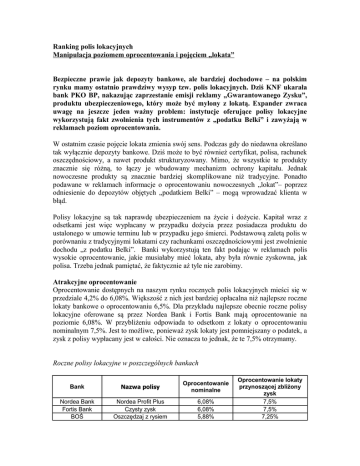Ranking polis lokacyjnych Manipulacja poziomem oprocentowania i pojęciem „lokata” Bezpieczne prawie jak depozyty bankowe, ale bardziej dochodowe – na polskim rynku mamy ostatnio prawdziwy wysyp tzw. polis lokacyjnych. Dziś KNF ukarała bank PKO BP, nakazując zaprzestanie emisji reklamy „Gwarantowanego Zysku”, produktu ubezpieczeniowego, który może być mylony z lokatą. Expander zwraca uwagę na jeszcze jeden ważny problem: instytucje oferujące polisy lokacyjne wykorzystują fakt zwolnienia tych instrumentów z „podatku Belki” i zawyżają w reklamach poziom oprocentowania. W ostatnim czasie pojęcie lokata zmienia swój sens. Podczas gdy do niedawna określano tak wyłącznie depozyty bankowe. Dziś może to być również certyfikat, polisa, rachunek oszczędnościowy, a nawet produkt strukturyzowany. Mimo, że wszystkie te produkty znacznie się różną, to łączy je wbudowany mechanizm ochrony kapitału. Jednak nowoczesne produkty są znacznie bardziej skomplikowane niż tradycyjne. Ponadto podawane w reklamach informacje o oprocentowaniu nowoczesnych „lokat”– poprzez odniesienie do depozytów objętych „podatkiem Belki” – mogą wprowadzać klienta w błąd. Polisy lokacyjne są tak naprawdę ubezpieczeniem na życie i dożycie. Kapitał wraz z odsetkami jest więc wypłacany w przypadku dożycia przez posiadacza produktu do ustalonego w umowie terminu lub w przypadku jego śmierci. Podstawową zaletą polis w porównaniu z tradycyjnymi lokatami czy rachunkami oszczędnościowymi jest zwolnienie dochodu „z podatku Belki”. Banki wykorzystują ten fakt podając w reklamach polis wysokie oprocentowanie, jakie musiałaby mieć lokata, aby była równie zyskowna, jak polisa. Trzeba jednak pamiętać, że faktycznie aż tyle nie zarobimy. Atrakcyjne oprocentowanie Oprocentowanie dostępnych na naszym rynku rocznych polis lokacyjnych mieści się w przedziale 4,2% do 6,08%. Większość z nich jest bardziej opłacalna niż najlepsze roczne lokaty bankowe o oprocentowaniu 6,5%. Dla przykładu najlepsze obecnie roczne polisy lokacyjne oferowane są przez Nordea Bank i Fortis Bank mają oprocentowanie na poziomie 6,08%. W przybliżeniu odpowiada to odsetkom z lokaty o oprocentowaniu nominalnym 7,5%. Jest to możliwe, ponieważ zysk lokaty jest pomniejszany o podatek, a zysk z polisy wypłacany jest w całości. Nie oznacza to jednak, że te 7,5% otrzymamy. Roczne polisy lokacyjne w poszczególnych bankach Bank Nazwa polisy Oprocentowanie nominalne Nordea Bank Fortis Bank BOŚ Nordea Profit Plus Czysty zysk Oszczędzaj z rysiem 6,08% 6,08% 5,88% Oprocentowanie lokaty przynoszącej zbliżony zysk 7,5% 7,5% 7,25% Raiffeisen Bank Getin Bank Kapitał & Pewność Pewne oszczędzanie 5,68% 5,67% 7,01% 7% Deutsche Bank Polisa lokacyjna Commercial Union 5,67% 7% Lukas Bank PKO BP Antidotum PRO Gwarantowany Zysk 4,5% 4,2% 5,5% 5,19% Banki wykorzystują ten fakt eksponując w materiałach reklamowych oprocentowanie, jakie musiałaby przynieść lokata, aby po odliczeniu podatku zarobiła tyle, co polisa. Ten chwyt marketingowy może zmylić osoby mniej zorientowane co do sposobu funkcjonowania tego rodzaju produktów. Faktycznie na żadnej rocznej polisie nie zarobimy nawet 7%. Ponadto, jeśli zgodnie z zapowiedziami, zostanie zniesiony podatek Belki to zysk z polisy będzie znacznie niższy niż z czołowych lokat. Tradycyjne lokaty mniej rentowne Dla porównania najlepsze roczne lokaty o stałym oprocentowaniu oferowane przez AIG Bank, Dominet Bank, Getin Bank i Bank Millennium przynoszą zysk na poziomie 6,5%. Niestety odsetki od lokat zostają pomniejszone o 19% podatku od zysków kapitałowych więc obecnie są mniej zyskowne, niż większość polis lokacyjnych. Dla przykładu po roku odsetki z lokaty oprocentowanej na poziomie 6,5% od kwoty 5 tys. zł wyniosą 325 zł. Od tego należy jednak odliczyć 19% podatku, czyli 62 zł. Pozostaje więc 263 zł, czyli faktyczny zysk wyniósł jedynie 5,27%. Większość lokat na naszym rynku jest jednak oprocentowana znacznie nirzej. Średni zysk rocznej lokaty to obecne około 4,6%, z czego po opłaceniu podatku pozostaje tylko 3,7%. Natomiast najgorsza obecnie roczna lokata jest oferowana przez Bank BPH i przynosi zysk na poziomie 1,5%, z czego po odjęciu podatku pozostaje około 1,2%. Oprocentowanie stałe lokat w poszczególnych bankach Banki AIG Bank Bank Millennium Dominet Bank Getin Bank Toyota Bank Volkswagen Bank Direct MBank Polbank EFG Eurobank Multibank ING Bank Śląski** Deutsche BankPBC Raiffeisen Bank BZ WBK BPS Oprocentowanie lokaty 12-mies. na kwotę 5 tys. zł 6,50% 6,50% 6,50% 6,50% 6,20% 6,05% 6,00% 6,00% 5,80% 5,80% 5,50% 5,40% 5,40% 5,00% 4,80% Bank BGŻ Lukas Bank BGK BOŚ Fortis Bank Kredyt Bank Bank Pocztowy* BWE Citibank Pekao SA DnB Nord BPH 4,60% 4,60% 4,50% 4,20% 3,80% 3,80% 3,75% 3,50% 2,60% 2,60% 2,30% 1,50% * Dla klienta nie posiadającego konta; kwota 5000 zł + 1 gr. ** eLokata wymaga otwarcia bezpłatnego Otwartego Konta Oszczędnościowego Zysk z lokat po opłaceniu podatku Oprocentowanie nominalne Zysk po opłaceniu podatku Najwyższe oprocentowanie rocznej lokaty 6,5% 5,3% Średnie oprocentowanie rocznej lokaty 4,6% 3,7% Najniższe oprocentowanie rocznej lokaty 1,5% 1,2% Natomiast najwyżej oprocentowany rachunek na polskim rynku oferowany jest przez Euro Bank. Jego oprocentowane nominalne wynosi 5,55% i co ciekawe nie jest to rachunek oszczędnościowy tylko ROR. Podstawową zaletą wszystkich wysoko oprocentowanych rachunków w porównaniu z omawianymi wyżej produktami jest możliwość wypłaty środków w dowolnym momencie bez utraty należnych odsetek. Natomiast, jeśli klient posiadający lokatę lub polisę lokacyjną zażąda zwrotu środków przed upływem miesiąca to nie otrzyma żadnych odsetek, lub otrzyma tylko nie wielką ich część. Najwyżej oprocentowane konta oszczędnościowe Bank Nazwa konta Oprocentowanie dla kwoty 5 tys. zł Eurobank Konto olline 5,55% m