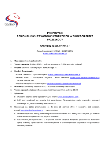 PROPOZYCJE REGIONALNYCH ZAWODÓW JEŹDZIECKICH W SKOKACH PRZEZ PRZESZKODY SZCZECIN 02-03.07.2016 r Zawody w ramach SEDINA HORSE SHOW www.sedinahorseshow.pl 1. Organizator: Fundacja Sedina HS. 2. Termin zawodów: 2-3lipca 2016 r., godzina rozpoczęcia: 7:30 (może ulec zmianie). 3. Miejsce: Szczecin, Stadion przy ul. Bandurskiego 35. 4. Komitet Organizacyjny: Daniel Jaśkiewicz - Dyrektor Projektu [email protected] Robert Palacz - Koordynator Projektu, Biuro zawodów [email protected] tel: +48 609 506 635 Paulina Muszyńska – Biuro Projektu [email protected] 5. Uczestnicy: Zawodnicy zrzeszeni w PZJ i WZJ oraz zawodnicy niezrzeszeni. 6. Termin zgłoszeń ostatecznych: poniedziałek 27czerwca 2016, godzina: 20:00. 7. Zgłoszenia: a) Wyłącznie poprzez panel zgłoszeniowy na stronie www.zawodykonne.com . b) Ilość koni przyjętych na zawody jest ograniczona. Pierwszeństwo mają zawodnicy notowani w rankingu PZJ, oraz zawodnicy zrzeszeni w ZZJ. 8. Rezerwacje na boksy przyjmowane są do dnia 20 czerwca 2016 r. wyłącznie pod adresem e-mail: [email protected] , z zastrzeżeniem: a) W rezerwacji boksu należy podać imię i nazwisko zawodnika oraz nazwy koni i ich płeć, jak również numer kontaktowy który ma się pojawić na boksie. b) Ilość boksów jest ograniczona. O przydziale boksów decyduje kolejność zgłoszeń oraz dokonanie opłaty za boksy. Opłata za boks jest obowiązkowa, w przeciwnym razie organizator nie gwarantuje rezerwacji boksów. c) Cena za boks - 250 zł - za całe zawody. W tytule przelewu należy podać imię i nazwisko zawodnika, oraz nazwę koni. Wszystkie dodatkowe informacje Robert Palacz, tel. 609 506 635. d) Opłata za niewykorzystane boksy nie będzie zwracana. e) Konto do rezerwacji boksów: Fundacja Sedina HS, Bank BGŻ BNP Paribas S.A; 70 2030 0045 1110 0000 0421 3980 f) Boksy wyłącznie namiotowe dostarczane przez firmę Cartrans. g) Organizator gwarantuje pierwszą ściółkę w postaci słomy. Istnieje możliwość zamówienia trocin dodatkowo płatnych, 100 zł. h) Na terenie zawodów istnieje możliwość dokupienia słomy, trocin i siana. i) Otwarcie stajni: Piątek, 01 lipca 2016 r., godz. 13.00. j) Podłączenie koniowozu do prądu - 100 zł za całe zawody. Rezerwacja przyłącza prądu na adres mailowy jak do rezerwacji boksów. 9. Warunki techniczne: a) Parkur o wym.76m/60m podłoże trawiaste. b) Rozprężania o wym.33m/60m, podłoże trawiaste. 10. Osoby oficjalne: Komisja Sędziowska Przewodniczący: Marek Chojnacki Szef Komisarzy: Małgorzata Szkudlarek Sędzia WZJ: Halina Jezierska Komisarz: Olga Petryszak Sędzia: Natasza Wolska Sędzia: Marcelina Główczyńska Gospodarz Toru: Arkadiusz Weckwert Sędzia stylu: Janusz Bobik Lekarz weterynarii: Paulina Lansberg Sędzia stylu: Andrzej Matławski Kowal: Hubert Wojtyniak 11. Sprawy organizacyjne: a) Zawody rozgrywane są zgodnie z przepisami i regulaminem PZJ i PZHK. Zawodników i konie obowiązuje dokumentacja zgodna z aktualnymi przepisami i regulaminem PZJ i PZHK. b) Organizator zastrzega sobie prawo do wszelkich zmian w programie zawodów, informacje o zmianach będą umieszczone na bieżąco na stronie www.sedinahorseshow.pl . c) Zgłaszając się na zawody zawodnik, luzak, trener, zobowiązują się do noszenia bezpiecznego, trzypunktowego nakrycia głowy, każdorazowo dosiadając konia. d) Limituje się starty na jednym koniu do dwóch dziennie. e) Do dekoracji każdego konkursu zapraszamy 6 najlepszych par. f) Wszystkie opłaty muszą być uregulowane przed startem. g) Zmiany na listach startowych po ich wydrukowaniu – wyłącznie za zgodą Sędziego Głównego i za opłatą 30 zł za każdą zmianę (nie dotyczy skreśleń). h) Zgłaszając się na zawody zawodnik wyraża zgodę na rozpowszechnianie swojego wizerunku bez ograniczenia w zakresie czasu, miejsca lub liczby egzemplarzy na wszystkich polach eksploatacji, w tym m.in. w publikacjach na billboardach, plakatach, w reklamie prasowej, reklamie na środkach komunikacji, na stronach internetowych itp. i) Za ewentualne zachorowania członków ekip, zawodników lub koni, oraz kradzieże, wypadki, szkody i inne zdarzenia losowe Organizator nie ponosi odpowiedzialności 12. Opłaty Organizacyjne a) Opłata wpisowa: 100 zł za 2 dni zawodów od konia 70 zł za 1 dzień od konia b) Opłata startowa od każdego startu konia: Klasa L - 35zł ; Sedina Pony Cup - 35zł ; Konkursy eliminacyjne do MPMK - 40 zł ; Klasa P - 50 zł ; Klasa N - 80 zł ; Klasa C - 100 zł ; 6 barier - 70 zł ; Sedina Business Class Amatour - całkowita opłata 250 zł za dzień, zasady uczestnictwa dostępne na stronie www.sedinahorseshow.pl 13. Zakwaterowanie zawodników we własnym zakresie: Dom Studencki Andromeda, ul. Chopina 59, 71-450 Szczecin [email protected], tel. 91 449 64 80 /81 /82. Istnieje możliwość wyżywienia po wcześniejszej rezerwacji. 14. Program zawodów: Dzień 1, sobota 02.07, rozpoczęcie godz. 7.30 (może ulec zmianie) Konkurs nr 1: kl. L dokładności z trafieniem w normę czasu (towarzyski) 238.1.1 (S1) Konkurs nr 2: kl. L z oceną stylu konia dla koni 4-letnich (kwalifikacje do MPMK, zgodnie z Regulaminem MPMK 2016) Konkurs nr 3:Sedina Pony Cup pod patronatem dystrybutora pasz St.Hippolyt dla kuców, 60-70 cm, dwunawrotowy Art. 273.2.1, Art. 273.3.3.1. Szczegółowe warunki na stronie www.sedinahorseshow.pl Konkurs nr 4: Business Class ( towarzyski ) 80 cm, szybkości, Art. 239- dla osób w wieku 25+, bez ważnej licencji sportowej Konkurs nr 5: kl. P dwufazowy, Art. 274.5.3 Konkurs nr 6: kl. N z wyboru przeszkód, Art. 270 (12.1) Konkurs nr 7: kl. C pod patronatem Marszałka Województwa Zachodniopomorskiego zwykły, Art.238.2.1 Konkurs nr 8: BMW 6 barier, Art. 262.3 – wysokość przeszkód od 120cm, dla zawodników posiadających przynajmniej 2 klasę sportową. Dzień 2, niedziela 02.07, rozpoczęcie godz. 7.30 (może ulec zmianie) Konkurs nr 9: kl. L dokładności z trafieniem w normę czasu (towarzyski ) 238.1.1 (S1)