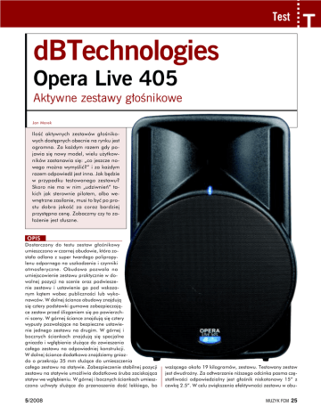 Test T dBTechnologies Opera Live 405 Aktywne zestawy głośnikowe Jan Marek Ilość aktywnych zestawów głośnikowych dostępnych obecnie na rynku jest ogromna. Za każdym razem gdy pojawia się nowy model, wielu użytkowników zastanawia się: „co jeszcze nowego można wymyślić?” i za każdym razem odpowiedź jest inna. Jak będzie w przypadku testowanego zestawu? Skoro nie ma w nim „udziwnień” takich jak sterownie pilotem, albo wewnętrzne zasilanie, musi to być po prostu dobra jakość za coraz bardziej przystępna cenę. Zobaczmy czy to założenie jest słuszne. OPIS Dostarczony do testu zestaw głośnikowy umieszczono w czarnej obudowie, która została odlana z super twardego polipropylenu odpornego na uszkodzenia i czynniki atmosferyczne. Obudowa pozwala na umiejscowienie zestawu praktycznie w dowolnej pozycji na scenie oraz podwieszenie zestawu i ustawienie go pod wskazanym kątem wobec publiczności lub wykonawców. W dolnej ściance obudowy znajdują się cztery podstawki gumowe zabezpieczające zestaw przed ślizganiem się po powierzchni sceny. W górnej ściance znajdują się cztery wypusty pozwalające na bezpieczne ustawienie jednego zestawu na drugim. W górnej i bocznych ściankach znajdują się specjalne gniazda i wgłębienia służące do zawieszenia całego zestawu na odpowiedniej konstrukcji. W dolnej ściance dodatkowo znajdziemy gniazdo o przekroju 35 mm służące do umieszczenia całego zestawu na statywie. Zabezpieczenie stabilnej pozycji zestawu na statywie umożliwia dodatkowa śruba zaciskająca statyw we wgłębieniu. W górnej i bocznych ściankach umieszczono uchwyty służące do przenoszenia dość lekkiego, bo 5/2008 ważącego około 19 kilogramów, zestawu. Testowany zestaw jest dwudrożny. Za odtwarzanie niższego odcinka pasma częstotliwości odpowiedzialny jest głośnik niskotonowy 15” z cewką 2.5”. W celu zwiększenia efektywności zestawu w obuMUZYK FCM 25 Test T dBTechnologies Opera Live 405 dowie wykonano otwory typu bass reflex. Membrana głośnika została zabezpieczona czarną, stalową siatką. W przedniej ściance obudowy umieszczono cztery otwory rezonansowe, dwa z nich – o kształcie zbliżonym do trójkątnego, znajdują się w dolnej części, oraz następne dwa – w kształtach przypominających prostokąt, w górnej. Do odtwarzania wyższego odcinka pasma częstotliwości służy jednocalowy driver z cewką 1.5” umieszczony nad głośnikiem niskotonowym. Tuba rezonansowa stanowi jednolitą całość z przednią ścianką obudowy, a jej szerokość jest prawie równa średnicy głośnika niskotonowego. Podział pasma następuje w punkcie znajdującym się około 2 kHz. Zestaw wyposażono w dwa wzmacniacze: wyższy odcinek pasma obsługuje wzmacniacz klasy AB o mocy 50 W RMS, niższy jest obsługiwany przez wzmacniacz klasy H o mocy 250 W RMS. Sygnał sterujący pracą zestawu możemy wprowadzić poprzez złącza umieszczone na panelu znajdującym się tradycyjnie z tyłu. Do dyspozycji mamy symetryczne gniazdo typu jack 1/4” oraz dwa gniazda typu XLR – wejściowe żeńskie i wyjściowe męskie. Wejścia pozwalają na wprowadzanie sygnału o poziomie mikrofonowym lub liniowym, zarówno symetrycznego jak i niesymetrycznego. Dzięki zlinkowaniu złączy, zarówno wyjście typu XLR jak i gniazdo jack 1/4” mogą służyć do przesyłania sygnału do innych urządzeń. Poziom głośności zestawu regulujemy za pomocą potencjometru obrotowego. Poniżej umieszczono przełącznik czułości wejściowej (-40 dB MIC / 0 dB LINE) oraz pokrętło regulujący barwę. Regulacja polega na zmianie proporcji pomiędzy zawartością tonów środkowych oraz wysokich i niskich. W związku z tym ustawienie potencjometru zwiększające zawartość tonów środkowych nazwano VOCAL, a odwrotne ustawienie nazwano MUSIC, środkowe określono jako FLAT i jest ono najbardziej uniwersalne. Testowany zestaw wyposażono w szereg zabezpieczeń. Jednym z nich jest limiter, o aktywności którego informuje dedykowana dioda znajdująca się tuż nad potencjometrem korekcji. WRAŻENIA Stosunkowo niewielki ciężar, obudowa pozwalająca na praktycznie dowolne umieszczenie zestawu, prostota w obsłudze i stabilność zabezpieczeń – to główne plusy testowanego urzą- dzenia. Czemu nie brzmienie? Bo dobra jakość brzmienia powinna być standardem, a nie zaletą. W przypadku OPERA LIVE 405 do brzmienia nie można mieć żadnych zastrzeżeń. Brzmienie zestawu jest dynamiczne, co pozwala na używanie go zarówno na małej jak i dużej głośności niezależnie od tego czy współpracuje się z wykonawcami grającymi na instrumentach akustycznych, elektrycznych, wokalistami, mówcami, czy przy odtwarzaniu muzyki mechanicznej. Zarówno na małej jak i dużej głośności pracy testowanego zestawu głośnikowego jego brzmienie pozostaje wyrównane, bez wyraźnych przekłamań – żaden odcinek pasma częstotliwości nie ginie ani nie dominuje nad resztą. Dzięki temu nawet przy dużej głośności Do testu dostarczył: Mega Music ul. Leśna 15 81-876 Sopot tel. (058) 5511882 Internet: www.megamusic.pl, www.dbtechnologies.com 26 MUZYK FCM 5/2008 Test brzmienie OPERA LIVE 405 nie jest drażniące. Oczywiście nie sposób nie docenić możliwości szybkiego ustawienia korekcji barwy poprzez jeden delikatny ruch gałką potencjometru obrotowego. PODSUMOWANIE OPERA LIVE 405 to godny polecenia aktywny zestaw głośnikowy, który można stosować w rozmaitych systemach nagłośnieniowych. Wysoka jakość brzmienia i zabezpieczeń czyni go stabilnym narzędziem pracy w każdych warunkach. 300 W RMS przy tej jakości brzmienia i wymiarach testowanego zestawu to dobry wynik. Połączenie tych właściwości pozwala uznać OPERA LIVE 405 za uniwersalny produkt. Zarówno w pomieszczeniach zamkniętych jak i na powietrzu testowany zestaw zachowuje się stabilnie, oferując użytkownikowi selektywne, dynamiczne i miękkie brzmienie. Obudowa testowane