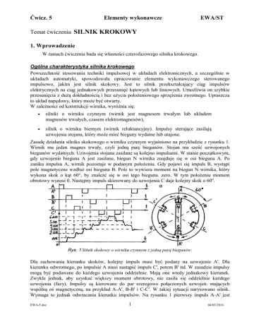Ćwicz. 5 Elementy wykonawcze EWA/ST Temat ćwiczenia: SILNIK KROKOWY 1. Wprowadzenie W ramach ćwiczenia bada się własności czterofazowego silnika krokowego. Ogólna charakterystyka silnika krokowego Powszechność stosowania techniki impulsowej w układach elektronicznych, a szczególnie w układach automatyki, spowodowała opracowanie elementu wykonawczego sterowanego impulsowo, jakim jest silnik skokowy. Jest to silnik przekształcający ciąg impulsów elektrycznych na ciąg jednakowych przesunięć kątowych lub liniowych. Umożliwia on szybkie przesunięcia z dużą dokładnością i bez użycia położeniowego sprzężenia zwrotnego. Upraszcza to układ napędowy, który może być otwarty. W zależności od konstrukcji wirnika, wyróżnia się: silniki o wirniku czynnym (wirnik jest magnesem trwałym lub układem magnesów trwałych, czasem elektromagnesów), silnik o wirniku biernym (wirnik reluktancyjny). Impulsy sterujące zasilają uzwojenia stojana, który może mieć bieguny wydatne lub utajone. Zasadę działania silnika skokowego o wirniku czynnym wyjaśniono na przykładzie z rysunku 1. Wirnik ma jeden magnes trwały, czyli jedną parę biegunów. Stojan ma sześć uzwojonych biegunów wydatnych. Uzwojenia stojana zasilane są kolejno impulsami. W stanie początkowym, gdy uzwojenie bieguna A jest zasilane, biegun N wirnika znajduje się w osi bieguna A. Po zaniku impulsu A, wirnik pozostaje w podanym położeniu. Gdy pojawi się impuls B, wystąpi pole magnetyczne wzdłuż osi bieguna B. Pole to wywiera moment na biegun N wirnika, który wykona skok o kąt 60°, by znaleźć się w osi tego bieguna. zero. W tym położeniu moment obrotowy wynosi 0. Następny impuls skierowany do uzwojenia C daje kolejny skok o 60o. Rys. 1 Silnik skokowy o wirniku czynnym z jedną parą biegunów: Dla zachowania kierunku skoków, kolejny impuls musi być podany na uzwojenie A'. Dla kierunku odwrotnego, po impulsie A musi nastąpić impuls C', potem B' itd. W zasadzie impulsy mogą być podawane do każdego uzwojenia oddzielnie. Mają one wtedy jednakowy kierunek. Zwykle jednak, aby uzyskać większy moment obrotowy, nie zasila się oddzielnie każdego uzwojenia (fazy). Impulsy są kierowane do par szeregowo połączonych uzwojeń. mających wspólną oś magnetyczną, na przykład A-A', B-B' i C-C'. W takiej sytuacji narysowano silnik. Wymaga to jednak odwracania kierunku impulsów. Na rysunku 1 pierwszy impuls A-A' jest EWA-5.doc 1 04/03/2016 Ćwicz. 5 Elementy wykonawcze EWA/ST przyjęty jako dodatni, czwarty zaś to A'-A lub -(A-A'), który ma kierunek odwrotny. Przedstawiono również skoki silnika, które mają charakter odpowiedzi oscylacyjnej, czasem wymagającej specjalnego tłumienia. Wartość pojedynczego skoku wirnika czynnego zależy od liczby jego par biegunów p oraz od liczby faz m, czyli od liczby uzwojeń sterujących i wynosi: = 360/(p m) Rys. .2 Silnik skokowy o wirniku czynnym z dwiema parani biegunów: a. zasada działania; b. b) przebieg skoków kątowych dla określonego ciągu impulsów sterujących W naszym przypadku p=1, m=6, stąd = 60°. Dla drugiego silnika, pokazanego na rysunku 2, mamy p=2, m=6, czyli tym razem = 30°. Warto zwrócić uwagę, że w tym przypadku skok pola z osi A-A' do B-B' daje skok wirnika o przeciwnym kierunku. W silnikach z wirnikiem czynnym, również przy braku impulsów sterujących, występuje moment Mt (reluktancyjny), utrzymujący wirnik w położeniu symetrycznym w stosunku do bieguna wydatnego stojana. Pokazuje to rysunek 3. Momentu takiego nie mają silniki z wirnikiem biernym. EWA-5.doc 2 04/03/2016 Ćwicz. 5 Elementy wykonawcze EWA/ST Rys. .3 Przebieg momentu trzymającego silnika skokowego o wirniku czynnym Ze względu na trudności technologiczne, silniki z dużą liczbą magnesów są wykonywane tylko dla bardzo małych mocy. Rozwój technologii materiałów magnetycznych umożliwił prowadzenie prac nad wyprodukowaniem silników skokowych o wirniku czynnym o bardzo dobrych parametrach – obecnie prace w tym kierunku są dalej kontynuowane. 2. Zestaw aparatury - silnik z czujnikiem kąta, sterownik bipolarny z translatorem AD31 i zasilaczem, komputer z oprogramowaniem Winsmc, oscyloskop cyfrowo analogowy, krążki metalowe umożliwiające zmianę momentu bezwładności obciążenia. 3. Zadania 3.1 Podłączyć do oscyloskopu sygnał z cyfrowego miernika kąta (wyjście „WY1”) i włączyć zakres 900. Zdjąć nakręcane krążki z ramienia silnika. 3.2 Ustawić położenie silnika krokowego w pozycję 00, a następnie włączyć zestaw laboratoryjny i uruchomić z pulpitu program „Winsmc”. Wybrać opcję ustawienia (okienko z symbolami narzędzi). Wybrać com 2 - dla połączenia z RS232. Następnie, uruchomić polecenie czytaj. Przy poprawnie dokonanych powyższych czynnościach powinien pojawić się adres sterownika. Jeżeli komputer nie wykryje sterownika to należy zmienić adres RS232 (np. com3). 3.3 Wczytać plik „silnik10”. Program przesłać do pamięci sterownika RAM i uruchomić jego działanie. Uwaga. Nowy program można zapisać do pamięci RAM sterownika po jej uprzednim wykasowaniu poprzez chwilowe wyłączenie zasilania sterownika (zasilanie EWA-5.doc 3 04/03/2016 Ćwicz. 5 Elementy wykonawcze EWA/ST 230V). W zależności od potrzeb można dowolnie modyfikować otwarty program (tworzyć nowy własny). Po uruchomieniu, silnik powinien obracać się ze stała możliwie najmniejszą prędkością 1/s umożliwiającą swobodne odczytywanie kąta po każdym skoku. Silnik powinien pracować w pętli wykonując cyklicznie 10 kroków. Jeżeli jest inaczej należy skorygować program. Zadbać o właściwe położenie początkowe wirnika silnika (skorygować ręcznie jego położenie) tak by obracał się on w pierwszej ćwiartce kąta pełnego - w obszarze położonym blisko 00. W przeciwny przypadku obraz może być niewidoczny – będzie położony poza ekranem (ponad) oscyloskopu. Ustawić rodzaj