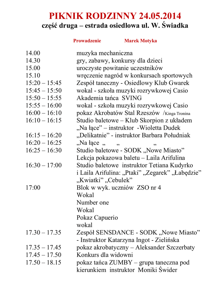 PIKNIK RODZINNY 24.05.2014 część druga – estrada osiedlowa ul. W. Świadka Prowadzenie 14.00 14.30 15.00 15.10 15:20 – 15:45 15:45 – 15:50 15:50 – 15:55 15:55 – 16:00 16:00 – 16:10 16:10 – 16:15 16:15 – 16:20 16:20 – 16:25 16:25 – 16:30 16:30 – 17:00 17:00 17.30 – 17.35 17.35 – 17.45 17.45 – 17.50 17.50 – 18.15 Marek Motyka muzyka mechaniczna gry, zabawy, konkursy dla dzieci uroczyste powitanie uczestników wręczenie nagród w konkursach sportowych Zespół taneczny - Osiedlowy Klub Gwarek wokal - szkoła muzyki rozrywkowej Casio Akademia tańca SVING wokal - szkoła muzyki rozrywkowej Casio pokaz Akrobatów Stal Rzeszów /Kinga Tronina Studio baletowe – Klub Skorpion z układem „Na łące” – instruktor -Wioletta Dudek „Delikatnie” - instruktor Barbara Południak „Na łące „ „ „ Studio baletowe - SODK „Nowe Miasto” Lekcja pokazowa baletu – Laila Arifulina Studio baletowe instruktor Tetiana Kudyrko i Laila Arifulina: „Ptaki” „Zegarek” „Łabędzie” „Kwiatki” „Cebulek” Blok w wyk. uczniów ZSO nr 4 Wokal Number one Wokal Pokaz Capuerio wokal Zespół SENSDANCE - SODK „Nowe Miasto” - Instruktor Katarzyna Ingot - Zielińska pokaz akrobatyczny – Aleksander Szczerbaty Konkurs dla widowni pokaz tańca ZUMBY – grupa taneczna pod kierunkiem instruktor Moniki Świder 18.15 - Zespół SENSDANCE - SODK „Nowe Miasto” Inst.. Katarzyna Ingot-Zielińska 18.20 Pokaz tańca arabskiego – solo Danuta Zagórska zespołu Lizel Rzeszowski Dom Kultury 18.30 wokal od Laili 18.35 konkurs dla widowni 18.40 18.45 19.10 19.15 20.00 Zespół SENSDANCE - SODK „Nowe Miasto” - Inst.. Katarzyna Ingot- Zielińska Taneczny Klub Sportowy „Gasiek” Zespół SENSDANCE - wokal od Laili Podziękowanie wszystkim uczestnikom zaproszenie na „Sportowy Dzień Radości Dziecka” 1.06.2014 boisko osiedlowe przy ul. Gen. Kustronia i imprezę po wakacjach „Nowe Miasto” mieszkańcom Rzeszowa 14.09.2014r. ul. Świadka Pomiędzy występami wstawki konkursy i quizy dla widowni