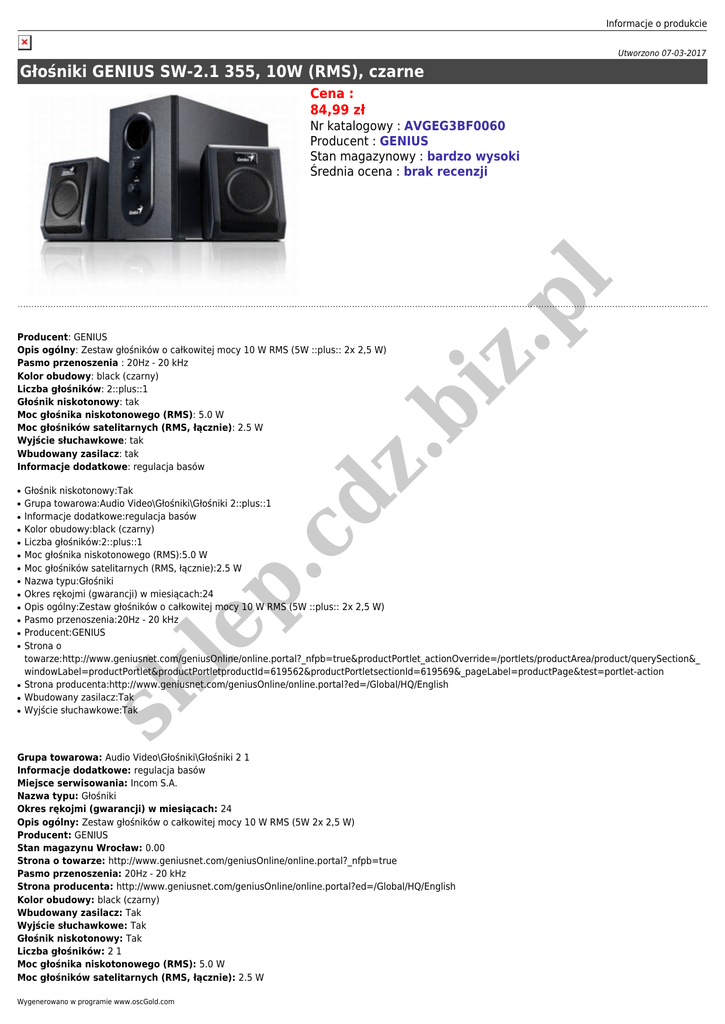 Informacje o produkcie Utworzono 07-03-2017 Głośniki GENIUS SW-2.1 355, 10W (RMS), czarne Cena : 84,99 zł ● ● ● ● ● ● ● ● ● ● ● ● ● .c ● Głośnik niskotonowy:Tak Grupa towarowa:Audio Video\Głośniki\Głośniki 2::plus::1 Informacje dodatkowe:regulacja basów Kolor obudowy:black (czarny) Liczba głośników:2::plus::1 Moc głośnika niskotonowego (RMS):5.0 W Moc głośników satelitarnych (RMS, łącznie):2.5 W Nazwa typu:Głośniki Okres rękojmi (gwarancji) w miesiącach:24 Opis ogólny:Zestaw głośników o całkowitej mocy 10 W RMS (5W ::plus:: 2x 2,5 W) Pasmo przenoszenia:20Hz - 20 kHz Producent:GENIUS Strona o towarze:http://www.geniusnet.com/geniusOnline/online.portal?_nfpb=true&productPortlet_actionOverride=/portlets/productArea/product/querySection&_ windowLabel=productPortlet&productPortletproductId=619562&productPortletsectionId=619569&_pageLabel=productPage&test=portlet-action Strona producenta:http://www.geniusnet.com/geniusOnline/online.portal?ed=/Global/HQ/English Wbudowany zasilacz:Tak Wyjście słuchawkowe:Tak le p ● sk ● dz .b Producent: GENIUS Opis ogólny: Zestaw głośników o całkowitej mocy 10 W RMS (5W ::plus:: 2x 2,5 W) Pasmo przenoszenia : 20Hz - 20 kHz Kolor obudowy: black (czarny) Liczba głośników: 2::plus::1 Głośnik niskotonowy: tak Moc głośnika niskotonowego (RMS): 5.0 W Moc głośników satelitarnych (RMS, łącznie): 2.5 W Wyjście słuchawkowe: tak Wbudowany zasilacz: tak Informacje dodatkowe: regulacja basów iz .p l Nr katalogowy : AVGEG3BF0060 Producent : GENIUS Stan magazynowy : bardzo wysoki Średnia ocena : brak recenzji Grupa towarowa: Audio Video\Głośniki\Głośniki 2 1 Informacje dodatkowe: regulacja basów Miejsce serwisowania: Incom S.A. Nazwa typu: Głośniki Okres rękojmi (gwarancji) w miesiącach: 24 Opis ogólny: Zestaw głośników o całkowitej mocy 10 W RMS (5W 2x 2,5 W) Producent: GENIUS Stan magazynu Wrocław: 0.00 Strona o towarze: http://www.geniusnet.com/geniusOnline/online.portal?_nfpb=true Pasmo przenoszenia: 20Hz - 20 kHz Strona producenta: http://www.geniusnet.com/geniusOnline/online.portal?ed=/Global/HQ/English Kolor obudowy: black (czarny) Wbudowany zasilacz: Tak Wyjście słuchawkowe: Tak Głośnik niskotonowy: Tak Liczba głośników: 2 1 Moc głośnika niskotonowego (RMS): 5.0 W Moc głośników satelitarnych (RMS, łącznie): 2.5 W Wygenerowano w programie www.oscGold.com iz .p .b dz .c le p sk l