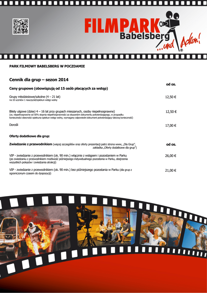 PARK FILMOWY BABELSBERG W POCZDAMIE Cennik dla grup – sezon 2014 od os. Ceny grupowe (obowiązują od 15 osób płacących za wstęp) Grupy młodzieżowe/szkolne (4 – 21 lat) 12,50 € na 10 uczniów 1 nauczyciel/opiekun wstęp wolny Bilety ulgowe (dzieci 4 – 16 lat przy grupach mieszanych, osoby niepełnosprawne) 12,50 € (os. niepełnosprawne od 50% stopnia niepełnosprawności za okazaniem dokumentu potwierdzającego, w przypadku konieczności obecności opiekuna opiekun wstęp wolny, wymagany odpowiedni dokument potwierdzający takową konieczność) Dorośli 17,00 € Oferty dodatkowe dla grup: Zwiedzanie z przewodnikiem (więcej szczegółów oraz oferty prezentacji patrz strona www, „Dla Grup”, od os. zakładka „Oferty dodatkowe dla grup”) VIP - zwiedzanie z przewodnikiem (ok. 90 min.) włącznie z wstępem i pozostaniem w Parku 26,00 € (po zwiedzaniu z przewodnikiem możliwość późniejszego indywidualnego pozostania w Parku, obejrzenia wszystkich pokazów i zwiedzania atrakcji) VIP - zwiedzanie z przewodnikiem (ok. 90 min.) bez późniejszego pozostania w Parku (dla grup z ograniczonym czasem do dyspozycji) 21,00 € Filmpark Babelsberg GmbH 14482 Potsdam/Niemcy Osoba kontaktowa: Michał Rydz Tel. +49 331 72 128 57 Faks +49 331 72 128 35 E-Mail: [email protected] Internet: www.filmpark-babelsberg.de dodatkowo do ceny wstępu grupowej od os., od os. „Jak powstaje film?” (ok. 60 min.) 6,00 € Park Filmowy od A do Z (ok. 30 min) 5,00 € Audio-Guide (w j. polskim, niemieckim, angielskim lub francuskim) 3,00 € Opłata dodatkowa za zwiedzanie z przewodnikiem w języku polskim: (nie dotyczy Audio-Guides) ryczałtowo od grupy 30,00 €¹ ¹ = bez możliwości prowizji i rabatów! Oferty przewodnickie ważne tylko za wcześniejszym zgłoszeniem i tylko w przypadku dyspozycyjności przewodnika w rezerwowanym terminie i godzinie. Wszystkie podane ceny zawierają 7% VAT, opłata za audio-guide 19% VAT. Stan: 11/2013. Zastrzega się możliwość zmian oraz wystąpienia błędów. Ze względu na warunki pogodowe i realizowane produkcje niektóre punkty programu mogą ulec zmianie lub przesunięciu! Filmpark Babelsberg GmbH 14482 Potsdam/Niemcy Tel. +49 331 72 128 52 Faks +49 331 72 128 35 E-Mail: [email protected] Internet: www.filmpark-babelsberg.de