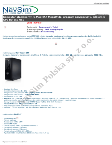 Informacje o produkcie Utworzono 07-03-2017 Komputer stacjonarny, C-MapMAX MegaWide, program nawigacyjny, odbiornik GPS BU-353 USB Cena : 0,00 zł Dostępność : Dostępność - 7 dni Stan magazynowy : brak w magazynie Średnia ocena : brak recenzji .z o. o. Profesjonalny zestaw nawigacyjny, w skład którego wchodzi: komputer stacjonarny i monitor, program nawigacyjny SailCruiser2.0 lub BoatCruiser 2.0 oraz dowolna mapa C-Map MAX MegaWide, a także odbiornik GPS BU-353 USB. model komputera: Dell Vostro 260 ● ● ● ● ● ● ● Si ● Obudowa Slim Tower Częstotliwość procesora: 3,1 GHz Zintegrowana karta graficzna: Intel Graphics Media Accelerator HD Zintegrowana karta sieciowa : 10/100/1000 Mbit/s Ilość slotów PCI-E 1x: 3 szt Interfejsy: 1 x 15-stykowe D-Sub (wyjście na monitor), 1 x HDMI, 10 x USB 2.0, 1 x RJ-45 (LAN), 1 x wyjście słuchawkowe (na froncie obudowy), 1 x wejście na mikrofon (na froncie obudowy), 1 x wejście na mikrofon, 1 x wejście liniowe, 1 x wyjście liniowe Napędy wbudowane (zainstalowane): DVDRW Super Multi (+ DVD-RAM) Dual Layer Microsoft Windows 7 Professional PL 64-bit Dołączone wyposażenie: Czytnik kart pamięci 19-in-1, Klawiatura, Mysz; Szerokość: 175 mm; Wysokość: 360 mm; Głębokość: 436,3 mm; Masa netto: 8,2 kg; av ● N ● m Po ls ka sp Komputer stacjonarny z procesorem Intel Core i5 Mobile, o pojemności dysku : 500 GB i zainstalowaną pamięcią: 4096 MBv. model monitora: Dell 24'' ● ● ● ● ● ● ● ● ● Podświetlenie LED Matryca matowa Rozdzielczość 1920x 1200 Jasność 300 cd/m2 Kontrast: typowy 1000:1, dynamiczny 2000000:1; Kąt widzenia poziomy: 178 stopni; Kąt widzenia pionowy: 178 stopni; Montaż na ścianie (VESA): 100 x 100 mm; Wysokość: 513,5 mm; Głębokość: 180,3 mm; Masa netto: 7,49 kg; Wygenerowano w programie www.oscGold.com Marki i modele komputerów podane zostały wyłącznie w celu zobrazowania parametrów jednostki. Mogą zostać dobrane indywidualnie do potrzeb klienta. Dostępne opcje Komputer stacjonarny, C-MapMAX MegaWide, program nawigacyjny, odbiornik GPS BU-353 USB Nośnik: C-Card, CD Voucher, SD-Card. Mapa: MW1.M.Śródziemne i M.Czarne, MW2.Atlantyckie wybrzeża Europy, MW3.Zach.wybrzeża Europy i M.Śródziemnego, MW4. Bałtyk N av Si m Po ls ka sp .z o. o. i Morze Północne, MW6. Wody śródlądowe Europy. Program nawigacyjny: SailCruiser2.0, BoatCruiser2.0.
