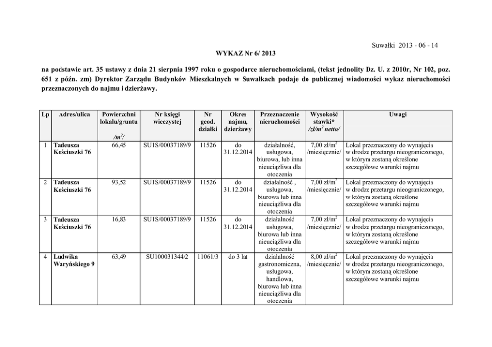 Suwałki 2013 - 06 - 14 WYKAZ Nr 6/ 2013 na podstawie art. 35 ustawy z dnia 21 sierpnia 1997 roku o gospodarce nieruchomościami, (tekst jednolity Dz. U. z 2010r, Nr 102, poz. 651 z późn. zm) Dyrektor Zarządu Budynków Mieszkalnych w Suwałkach podaje do publicznej wiadomości wykaz nieruchomości przeznaczonych do najmu i dzierżawy. Lp Adres/ulica 1 Tadeusza Kościuszki 76 Powierzchni lokalu/gruntu Nr księgi wieczystej Nr geod. działki Okres najmu, dzierżawy /m2/ 66,45 SU1S/00037189/9 11526 do 31.12.2014 2 Tadeusza Kościuszki 76 93,52 3 Tadeusza Kościuszki 76 16,83 4 Ludwika Waryńskiego 9 63,49 Przeznaczenie nieruchomości działalność, usługowa, biurowa, lub inna nieuciążliwa dla otoczenia SU1S/00037189/9 11526 do działalność , 31.12.2014 usługowa, biurowa lub inna nieuciążliwa dla otoczenia SU1S/00037189/9 11526 do działalność 31.12.2014 usługowa, biurowa lub inna nieuciążliwa dla otoczenia SU100031344/2 11061/3 do 3 lat działalność gastronomiczna, usługowa, handlowa, biurowa lub inna nieuciążliwa dla otoczenia Wysokość stawki* /zł/m2 netto/ Uwagi 7,00 zł/m2 Lokal przeznaczony do wynajęcia /miesięcznie/ w drodze przetargu nieograniczonego, w którym zostaną określone szczegółowe warunki najmu 7,00 zł/m2 Lokal przeznaczony do wynajęcia /miesięcznie/ w drodze przetargu nieograniczonego, w którym zostaną określone szczegółowe warunki najmu 7,00 zł/m2 Lokal przeznaczony do wynajęcia /miesięcznie/ w drodze przetargu nieograniczonego, w którym zostaną określone szczegółowe warunki najmu 8,00 zł/m2 Lokal przeznaczony do wynajęcia /miesięcznie/ w drodze przetargu nieograniczonego, w którym zostaną określone szczegółowe warunki najmu 5 Składowa 18,00 SU1S/00032645/9 10678/2 do 3 lat grunt pod garaż 6 Składowa 18,00 SU1S/00032645/9 10678/2 do 3 lat grunt pod garaż 7 Składowa 18,00 SU1S/00032645/9 10678/2 do 3 lat grunt pod garaż 8 Składowa 18,00 SU1S/00032645/9 10678/2 do 3 lat grunt pod garaż 9 Składowa 18,00 SU1S/00032645/9 10678/2 do 3 lat grunt pod garaż 10 Składowa 18,00 SU1S/00032645/9 10678/2 do 3 lat grunt pod garaż 11 Składowa 18,00 SU1S/00032645/9 10678/2 do 3 lat grunt pod garaż 12 Składowa 18,00 SU1S/00032645/9 10678/2 do 3 lat grunt pod garaż 13 Składowa 18,00 SU1S/00032645/9 10678/2 do 3 lat grunt pod garaż 14 Składowa 18,00 SU1S/00032645/9 10678/2 do 3 lat grunt pod garaż 15 Składowa 18,00 SU1S/00032645/9 10678/2 do 3 lat grunt pod garaż 1,70 zł/m2 Nieruchomość została przeznaczona do /miesięcznie/ najmu w trybie bezprzetargowym Panu Tadeuszowi Biłdzie 2 1,70 zł/m Nieruchomość została przeznaczona do /miesięcznie/ najmu w trybie bezprzetargowym Pani Swietłanie Wysockiej 2 1,70 zł/m Nieruchomość została przeznaczona do /miesięcznie/ najmu w trybie bezprzetargowym Pani Beacie Danucie Wójtowicz 2 1,70 zł/m Nieruchomość została przeznaczona do /miesięcznie/ najmu w trybie bezprzetargowym Panu Tadeuszowi Renkiewiczowi 2 1,70 zł/m Nieruchomość została przeznaczona do /miesięcznie/ najmu w trybie bezprzetargowym Pani Reginie Kolenkiewicz 2 1,70 zł/m Nieruchomość została przeznaczona do /miesięcznie/ najmu w trybie bezprzetargowym Panu Januszowi Buraczewskiemu 2 1,70 zł/m Nieruchomość została przeznaczona do /miesięcznie/ najmu w trybie bezprzetargowym Panu Andrzejowi Jabłońskiemu 2 1,70 zł/m Nieruchomość została przeznaczona do /miesięcznie/ najmu w trybie bezprzetargowym Pani Anicie Sylwii Szulc 2 1,70 zł/m Nieruchomość została przeznaczona do /miesięcznie/ najmu w trybie bezprzetargowym Panu Radosławowi Orłowskiemu 2 1,70 zł/m Nieruchomość została przeznaczona do /miesięcznie/ najmu w trybie bezprzetargowym Pani Annie Wichurze 2 1,70 zł/m Nieruchomość została przeznaczona do /miesięcznie/ najmu w trybie bezprzetargowym Panu Wojciechowi Pelczarskiemu 16 Składowa 18,00 SU1S/00032645/9 10678/2 do 3 lat grunt pod garaż 17 Składowa 18,00 SU1S/00032645/9 10678/2 do 3 lat grunt pod garaż 18 Składowa 24,00 SU1S/00037309/7 do 31.10.2015 grunt pod garażem wybudowany ze środków własnych 19 Składowa 8,00 SU1S/00037307/3 10681/2 do 3 lat pomieszczenie gospodarcze 20 Em. Plater 18,00 - 11455 do 30.06.2014 grunt pod garaż 21 Skłodowskiej 19,00 KW25271 11854 do 3 lat garaż 22 Sejneńska 18,00 do 3 lat garaż 11762 SU1S/00034027/5 24748/1 1,70 zł/m2 Nieruchomość została przeznaczona do /miesięcznie/ najmu w trybie bezprzetargowym Panu Marianowi Olechnie 2 1,70 zł/m Nieruchomość została przeznaczona do /miesięcznie/ najmu w trybie bezprzetargowym Panu Zbigniewowi Jacewiczowi 2 2,20 zł/m Wykaz stanowi jednocześnie ofertę /miesięcznie/ zawarcia umowy, które nastąpi po upływie 21 dni od dnia jego publikacji. Jeśli w powyższym terminie wpłyną inne wnioski o dzierżawę, zostanie przeprowadzony przetarg pisemny ofertowy ograniczony do wnioskodawców. 2,07 zł/m2 Wykaz stanowi jednocześnie ofertę /miesięcznie/ zawarcia umowy, która nastąpi po upływie 21 dni od dnia jego publikacji. Jeśli w powyższym terminie wpłyną inne wnioski o dzierżawę, zostanie przeprowadzony przetarg pisemny ofertowy ograniczony do wnioskodawców. 1,70 zł/m2 Wykaz stanowi jednocześnie ofertę /miesięcznie/ zawarcia umowy, które nastąpi po upływie 21 dni od dnia jego publikacji. Jeśli w powyższym terminie wpłyną inne wnioski o dzierżawę, zostanie przeprowadzony przetarg pisemny ofertowy ograniczony do wnioskodawców. 2 3,00 zł/m Garaż przeznaczony do wynajęcia /miesięcznie/ w drodze przetargu nieograniczonego. 3,00 zl/m2 Garaż przeznaczony do wynajęcia /miesięcznie/ w drodze przetargu nieograniczonego. 23 Władysława Jagiełły 201,00 SU1S/00016734/2 30970/5 do 3 lat nieruchomość gruntowa przeznaczona do dzierżawy na ogródek, tereny zielone. 0,27 zł/m2 /rocznie/ Nieruchomość gruntowa została przeznaczona do dzierżawy w trybie bezprzetargowym Państwu Małgorzacie i Adamowi Owsiejew Informacje dodatkowe: 1. Najemca/