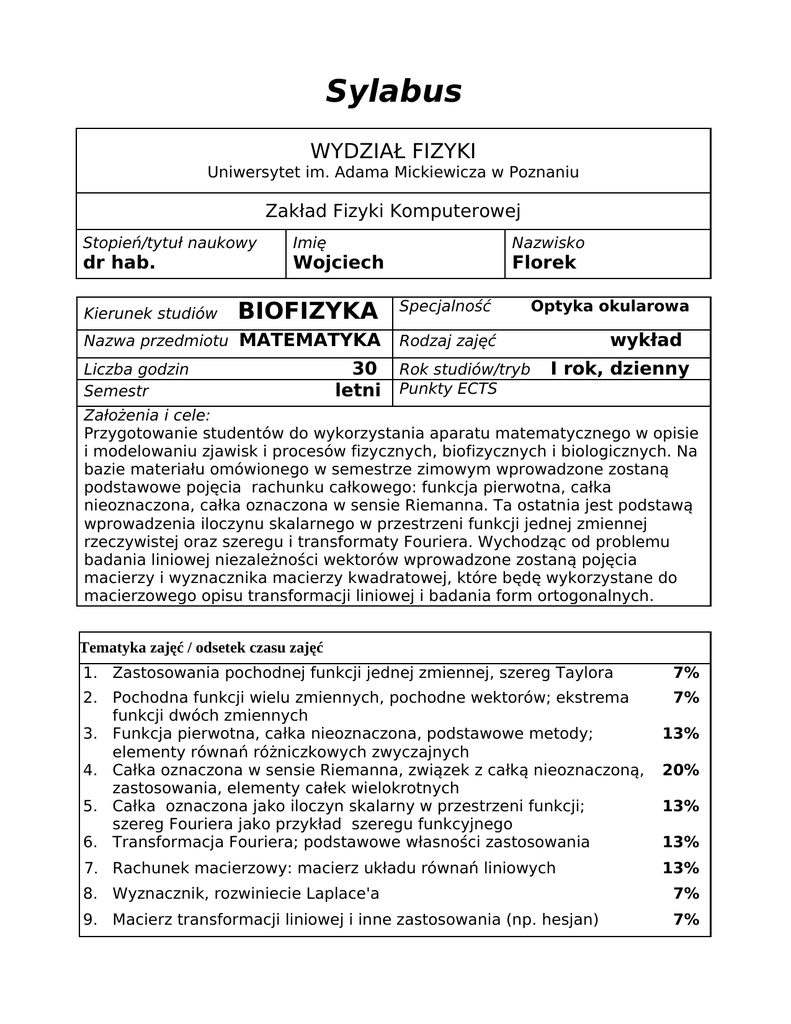 Sylabus WYDZIAŁ FIZYKI Uniwersytet im. Adama Mickiewicza w Poznaniu Zakład Fizyki Komputerowej Stopień/tytuł naukowy dr hab. Kierunek studiów Imię Nazwisko Wojciech BIOFIZYKA Nazwa przedmiotu MATEMATYKA Liczba godzin Semestr 30 letni Florek Specjalność Optyka okularowa wykład Rodzaj zajęć Rok studiów/tryb Punkty ECTS I rok, dzienny Założenia i cele: Przygotowanie studentów do wykorzystania aparatu matematycznego w opisie i modelowaniu zjawisk i procesów fizycznych, biofizycznych i biologicznych. Na bazie materiału omówionego w semestrze zimowym wprowadzone zostaną podstawowe pojęcia rachunku całkowego: funkcja pierwotna, całka nieoznaczona, całka oznaczona w sensie Riemanna. Ta ostatnia jest podstawą wprowadzenia iloczynu skalarnego w przestrzeni funkcji jednej zmiennej rzeczywistej oraz szeregu i transformaty Fouriera. Wychodząc od problemu badania liniowej niezależności wektorów wprowadzone zostaną pojęcia macierzy i wyznacznika macierzy kwadratowej, które będę wykorzystane do macierzowego opisu transformacji liniowej i badania form ortogonalnych. Tematyka zajęć / odsetek czasu zajęć 1. Zastosowania pochodnej funkcji jednej zmiennej, szereg Taylora 7% 2. Pochodna funkcji wielu zmiennych, pochodne wektorów; ekstrema funkcji dwóch zmiennych 3. Funkcja pierwotna, całka nieoznaczona, podstawowe metody; elementy równań różniczkowych zwyczajnych 4. Całka oznaczona w sensie Riemanna, związek z całką nieoznaczoną, zastosowania, elementy całek wielokrotnych 5. Całka oznaczona jako iloczyn skalarny w przestrzeni funkcji; szereg Fouriera jako przykład szeregu funkcyjnego 6. Transformacja Fouriera; podstawowe własności zastosowania 7% 7. Rachunek macierzowy: macierz układu równań liniowych 13% 20% 13% 13% 13% 8. Wyznacznik, rozwiniecie Laplace'a 7% 9. Macierz transformacji liniowej i inne zastosowania (np. hesjan) 7% Sposoby oceny pracy studenta Udział w ocenie końcowej ocena ciągła (bieżące przygotowanie do zajęć i aktywność) śródsemestralne kolokwia pisemne/ustne końcowe zaliczenie pisemne/ustne egzamin pisemny 2/3 egzamin ustny 1/3 kontrola obecności praca końcowa semestralna/roczna inne: Literatura obowiązkowa 1. R. Rudnicki, Wykłady z analizy matematycznej, Wydawnictwo Naukowe PWN, W-wa 2002 2. F.W. Byron, R.W. Fuller, Matematyka w fizyce klasycznej i kwantowej, PWN, W-wa 1975 3. A. Mostowski, M. Stark, Algebra liniowa, PWN, Warszawa 1973 Literatura uzupełniająca 1. F. Leja, Rachunek różniczkowy i całkowy, PWN, Warszawa 1975 2. D.A. McQuarrie, Matematyka dla przyrodników i inżynierów, t, 1, Wydawnictwo Naukowe PWN, Warszawa 2005 3. I.N. Bronsztejn, K.A. Siemiendiajew, Matematyka. Poradnik encyklopedyczny, Wydawnictwo Naukowe PWN, Warszawa 2005 4. W. Krysicki, L. Włodarski, Analiza matematyczna w zadaniach, cz. I, Wydawnictwo Naukowe PWN, Warszawa 2003 5. B. Gleigewicht, Algebra, PWN, Warszawa 1983 6. Inne dostępne podręczniki/skrypty obejmujące swym zakresem rachunek różniczkowy funkcji jednej zmiennej rzeczywistej 7. Materiały dostarczone przez prowadzącego