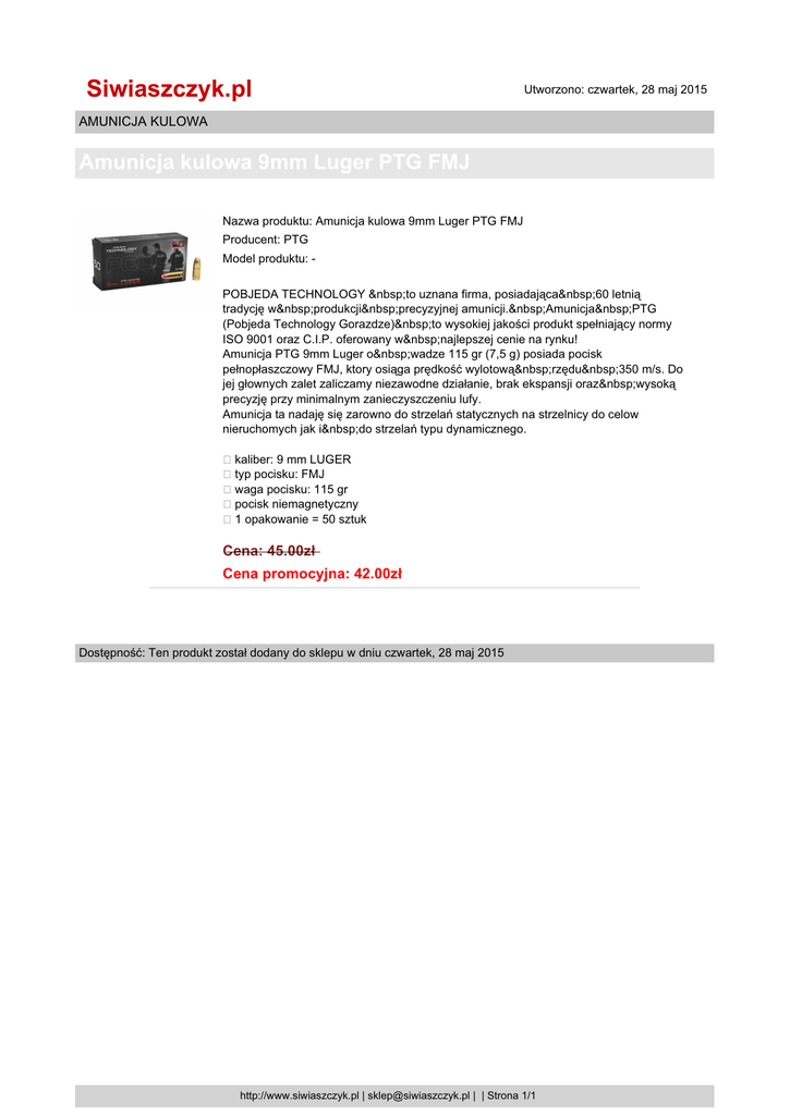 Siwiaszczyk.pl Utworzono: czwartek, 28 maj 2015 AMUNICJA KULOWA Amunicja kulowa 9mm Luger PTG FMJ Nazwa produktu: Amunicja kulowa 9mm Luger PTG FMJ Producent: PTG Model produktu: POBJEDA TECHNOLOGY to uznana firma, posiadająca 60 letnią tradycję w produkcji precyzyjnej amunicji. Amunicja PTG (Pobjeda Technology Gorazdze) to wysokiej jakości produkt spełniający normy ISO 9001 oraz C.I.P. oferowany w najlepszej cenie na rynku! Amunicja PTG 9mm Luger o wadze 115 gr (7,5 g) posiada pocisk pełnopłaszczowy FMJ, ktory osiąga prędkość wylotową rzędu 350 m/s. Do jej głownych zalet zaliczamy niezawodne działanie, brak ekspansji oraz wysoką precyzję przy minimalnym zanieczyszczeniu lufy. Amunicja ta nadaję się zarowno do strzelań statycznych na strzelnicy do celow nieruchomych jak i do strzelań typu dynamicznego. kaliber: 9 mm LUGER typ pocisku: FMJ waga pocisku: 115 gr pocisk niemagnetyczny 1 opakowanie = 50 sztuk Cena: 45.00zł Cena promocyjna: 42.00zł Dostępność: Ten produkt został dodany do sklepu w dniu czwartek, 28 maj 2015 http://www.siwiaszczyk.pl | [email protected] | | Strona 1/1