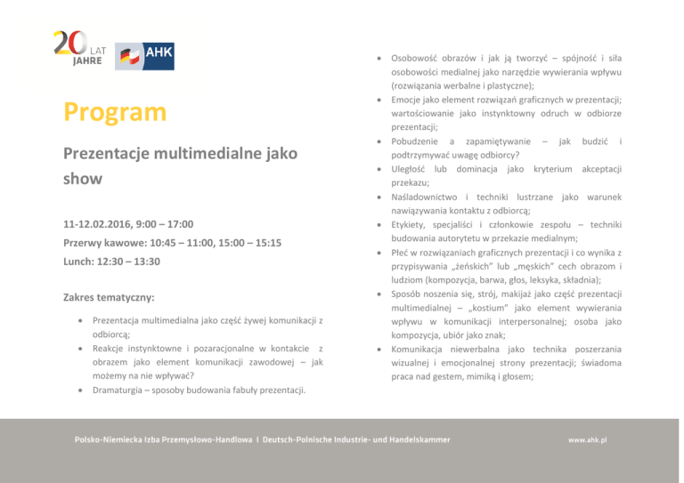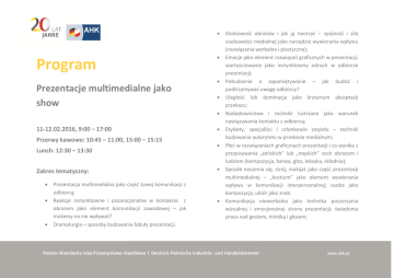 Program Prezentacje multimedialne jako show 11-12.02.2016, 9:00 – 17:00 Przerwy kawowe: 10:45 – 11:00, 15:00 – 15:15 Lunch: 12:30 – 13:30 Zakres tematyczny: Prezentacja multimedialna jako część żywej komunikacji z odbiorcą; Reakcje instynktowne i pozaracjonalne w kontakcie z obrazem jako element komunikacji zawodowej – jak możemy na nie wpływać? Dramaturgia – sposoby budowania fabuły prezentacji. Osobowość obrazów i jak ją tworzyć – spójność i siła osobowości medialnej jako narzędzie wywierania wpływu (rozwiązania werbalne i plastyczne); Emocje jako element rozwiązań graficznych w prezentacji; wartościowanie jako instynktowny odruch w odbiorze prezentacji; Pobudzenie a zapamiętywanie – jak budzić i podtrzymywać uwagę odbiorcy? Uległość lub dominacja jako kryterium akceptacji przekazu; Naśladownictwo i techniki lustrzane jako warunek nawiązywania kontaktu z odbiorcą; Etykiety, specjaliści i członkowie zespołu – techniki budowania autorytetu w przekazie medialnym; Płeć w rozwiązaniach graficznych prezentacji i co wynika z przypisywania „żeńskich” lub „męskich” cech obrazom i ludziom (kompozycja, barwa, głos, leksyka, składnia); Sposób noszenia się, strój, makijaż jako część prezentacji multimedialnej – „kostium” jako element wywierania wpływu w komunikacji interpersonalnej; osoba jako kompozycja, ubiór jako znak; Komunikacja niewerbalna jako technika poszerzania wizualnej i emocjonalnej strony prezentacji; świadoma praca nad gestem, mimiką i głosem; Dykcja jako zbliżenie filmowe i jako technika zjednywania odbiorcy; współzależność artykulacji i mimiki z koncentracją uwagi; Retoryka i techniki przekonywania; stosowanie wizualizacji słownych, efektywna składnia, praca nad słowem pod kątem oddziaływania na emocje odbiorcy; Strach i trema, techniki oddechowe i relaksacyjne, inne sposoby zmniejszania napięć podczas prezentacji; Kontakt z małym i dużym audytorium; metody podtrzymywania uwagi i zainteresowania odbiorcy; Inne pomoce audiowizualne, dokumenty, „rekwizyty” w prezentacji (notatki, wskaźniki i inne przedmioty) – jak się nimi posługiwać. Trener dr Monika Braun aktorka; nauczyciel aktorstwa, reżyserii i metod pracy głosem oraz technik przemawiania. Jest również trenerem i coachem posiadającym długoletnie doświadczenie z zakresu komunikacji interpersonalnej i wystąpień publicznych. Głównym kierunkiem jej pracy (dydaktycznej i naukowej) jest zastosowanie metod pracy aktora w innych zawodach. W spektrum jej zainteresowań leżą: efektywne porozumiewanie się, sztuka nawiązywania kontaktów, umiejętności przekonywania oraz kierowania emocjami. Jest także wykładowcą technik medialnych oraz metod prezentacji osobistej w Instytucie Dziennikarstwa i Komunikacji Społecznej Uniwersytetu Wrocławskiego. Tematem jej pracy doktorskiej (obronionej w Instytucie Kulturoznawstwa Wydziału Nauk Społecznych Uniwersytetu im. Adama Mickiewicza w Poznaniu) było „Wykorzystanie technik aktorskich w treningach społecznych”. Jako trener prowadzi przede wszystkim szkolenia z zakresu prezentacji, autoprezentacji, retoryki, technik wystąpień publicznych i etykiety w biznesie (dla banków, firm ubezpieczeniowych, firm motoryzacyjnych, telekomunikacji, firm zajmujących się produkcją urządzeń elektronicznych, itp.). Współpracowała miedzy innymi między z: Microsoft Polska Spółka Z o. o., Polkomtel S.A., SigmaKalon Deco Polska Sp. z o. o., Ericsson Sp. z o. o., Nissan Poland, Bayer Sp. Z o. o., Compensa Życie SA., Nokia Poland, Volksbank Leasing Polska SA., Generali TU S.A., Stoen, TU Gerling. Szczególnie specjalizuje się w technikach kształtowaniu wizerunku, retoryce, emocjonalnych aspektach komunikacji oraz związkach body-language z technikami wywierania wpływu. Podczas treningów pracuje nad ciałem, głosem oraz werbalnymi i niewerbalnymi aspektami komunikacji jako narzędziami wywierania wpływu w kontaktach zawodowych.