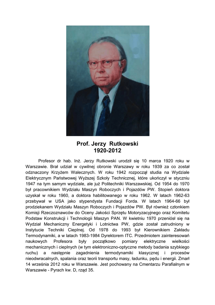 Prof. Jerzy Rutkowski 1920-2012 Profesor dr hab. Inż. Jerzy Rutkowski urodził się 10 marca 1920 roku w Warszawie. Brał udział w cywilnej obronie Warszawy w roku 1939 za co został odznaczony Krzyżem Walecznych. W roku 1942 rozpoczął studia na Wydziale Elektrycznym Państwowej Wyższej Szkoły Technicznej, które ukończył w styczniu 1947 na tym samym wydziale, ale już Politechniki Warszawskiej. Od 1954 do 1970 był pracownikiem Wydziału Maszyn Roboczych i Pojazdów PW. Stopień doktora uzyskał w roku 1960, a doktora habilitowanego w roku 1962. W latach 1962-63 przebywał w USA jako stypendysta Fundacji Forda. W latach 1964-66 był prodziekanem Wydziału Maszyn Roboczych i Pojazdów PW. Był również członkiem Komisji Rzeczoznawców do Oceny Jakości Sprzętu Motoryzacyjnego oraz Komitetu Podstaw Konstrukcji i Technologii Maszyn PAN. W kwietniu 1970 przeniósł się na Wydział Mechaniczny Energetyki i Lotnictwa PW, gdzie został zatrudniony w Instytucie Techniki Cieplnej. Od 1978 do 1993 był Kierownikiem Zakładu Termodynamiki, a w latach 1983-1984 Dyrektorem ITC. Przedmiotem zainteresowań naukowych Profesora były początkowo pomiary elektryczne wielkości mechanicznych i cieplnych (w tym elektroniczno-optyczne metody badania szybkiego ruchu) a następnie zagadnienia termodynamiki klasycznej i procesów nieodwracalnych, spalania oraz teorii transportu masy, ładunku, pędu i energii. Zmarł 14 września 2012 roku w Warszawie. Jest pochowany na Cmentarzu Parafialnym w Warszawie - Pyrach kw. D, rząd 35.