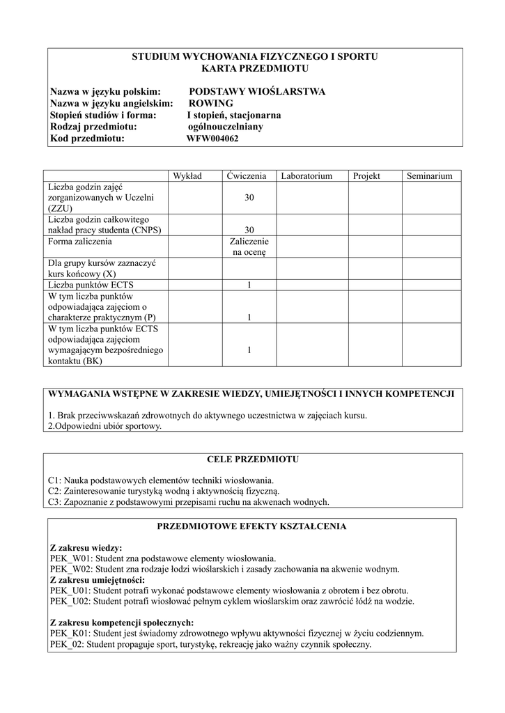 STUDIUM WYCHOWANIA FIZYCZNEGO I SPORTU KARTA PRZEDMIOTU Nazwa w języku polskim: Nazwa w języku angielskim: Stopień studiów i forma: Rodzaj przedmiotu: Kod przedmiotu: PODSTAWY WIOŚLARSTWA ROWING I stopień, stacjonarna ogólnouczelniany WFW004062 Wykład Liczba godzin zajęć zorganizowanych w Uczelni (ZZU) Liczba godzin całkowitego nakład pracy studenta (CNPS) Forma zaliczenia Dla grupy kursów zaznaczyć kurs końcowy (X) Liczba punktów ECTS W tym liczba punktów odpowiadająca zajęciom o charakterze praktycznym (P) W tym liczba punktów ECTS odpowiadająca zajęciom wymagającym bezpośredniego kontaktu (BK) Ćwiczenia Laboratorium Projekt Seminarium 30 30 Zaliczenie na ocenę 1 1 1 WYMAGANIA WSTĘPNE W ZAKRESIE WIEDZY, UMIEJĘTNOŚCI I INNYCH KOMPETENCJI 1. Brak przeciwwskazań zdrowotnych do aktywnego uczestnictwa w zajęciach kursu. 2.Odpowiedni ubiór sportowy. CELE PRZEDMIOTU C1: Nauka podstawowych elementów techniki wiosłowania. C2: Zainteresowanie turystyką wodną i aktywnością fizyczną. C3: Zapoznanie z podstawowymi przepisami ruchu na akwenach wodnych. PRZEDMIOTOWE EFEKTY KSZTAŁCENIA Z zakresu wiedzy: PEK_W01: Student zna podstawowe elementy wiosłowania. PEK_W02: Student zna rodzaje łodzi wioślarskich i zasady zachowania na akwenie wodnym. Z zakresu umiejętności: PEK_U01: Student potrafi wykonać podstawowe elementy wiosłowania z obrotem i bez obrotu. PEK_U02: Student potrafi wiosłować pełnym cyklem wioślarskim oraz zawrócić łódź na wodzie. Z zakresu kompetencji społecznych: PEK_K01: Student jest świadomy zdrowotnego wpływu aktywności fizycznej w życiu codziennym. PEK_02: Student propaguje sport, turystykę, rekreację jako ważny czynnik społeczny. TREŚCI PROGRAMOWE Forma zajęć – ćwiczenia Ćw.1 Liczba godzin Zajęcia organizacyjne: omówienie zasad BHP, omówienie regulaminów basenu wioślarskiego, siłowni, hangaru, omówienie zasad zejścia na wodę i powrotu z wody, zasady poruszania się na akwenie wodnym. 2 Ćw.2-5 Nauka wynoszenia łodzi wioślarskiej i wioseł, nauka wsiadania i wysiadania z łodzi, zasady zachowania się w łodzi, nauka trzymania wiosła, nauka elementów wioślarskich bez obrotu (same RR, RR z T, ½ podjazdu, cały podjazd), doskonalenie poznanych elementów wioślarskich. 8 Ćw.614 Nauka elementów wioślarskich z obracaniem (same RR, RR z T, ½ podjazdu, cały podjazd), wiosłowanie z koordynacją pracy w zespole, doskonalenie poznanych elementów, poznawanie ćwiczeń doskonalących technikę wiosłowania. 18 Ćw.15 Zaliczenie semestru 2 Ʃ godzin 30 STOSOWANE NARZĘDZIA DYDAKTYCZNE N1. Osprzęt wioślarski: łódź wioślarska, wózek, wiosło. motorówka, stoper, megafon. N2. Osprzęt dydaktyczny: motorówka, stoper, megafon. OCENA OSIĄGNIĘCIA PRZEDMIOTOWYCH EFEKTÓE KSZTAŁCENIA Oceny F- formująca w trakcie semestru; P- podsumowująca na koniec semestru. Numer efektu kształcenia Sposób oceny osiągnięcia efektu kształcenia F1 PEK_ U01, U02 Demonstracja, frekwencja P Frekwencja, aktywność, postawa na zajęciach. LITERATURA PODSTAWOWA I UZUPEŁNIAJĄCA LITERATURA PODSTAWOWA: [1] Hennig M. (red): Wioślarstwo. Warszawa: Polski Związek Towarzystw Wioślarskich, 2003. OPIEKUN PRZEDMIOTU (IMIĘ, NAZWISKO, ADRES E-MAIL) Paweł Rańda, [email protected] MACIERZ POWIĄZANIA EFEKTÓW KSZTAŁCENIA DLA PRZEDMIOTU WIOŚLARSTWO Przedmiotowy efekt kształcenia PEK_W01 (wiedza) Odniesienie przedmiotowego Cele efektu do efektów kształcenia przedmiotu** zdefiniowanych dla obszarowych efektów kształcenia Posiada podstawową wiedzę z C1, C2, C3 zakresu wybranej dyscypliny Treści programowe** Numer narzędzia dydaktycznego** Ćw. 1-15 N1, N2 PEK_W02 sportu (kursu wf) spośród kilkudziesięciu oferowanych Posiada podstawowe umiejętności z zakresu dyscyplin, którą wybrał, posiada, umiejętność PEK_U02 włączenia się w prozdrowotny styl życia z wybraniem aktywności na całe życie oraz kształtowania postaw sprzyjających całożyciowej aktywności fizycznej. Promuje społeczne i kulturowe PEK_K01 (kompetencje) znaczenie sportu i aktywności fizycznej oraz pielęgnuje własne upodobania z zakresu kultury fizycznej. ** - z tabel powyżej PEK_U01 (umiejętności) C1, C2, C3 Ćw. 1-15 N1, N2 C1, C2, C3 Ćw. 1-15 N1, N2 C1, C2, C3 Ćw. 1-15 N1, N2 C1, C2, C3 Ćw. 1-15 N1, N2