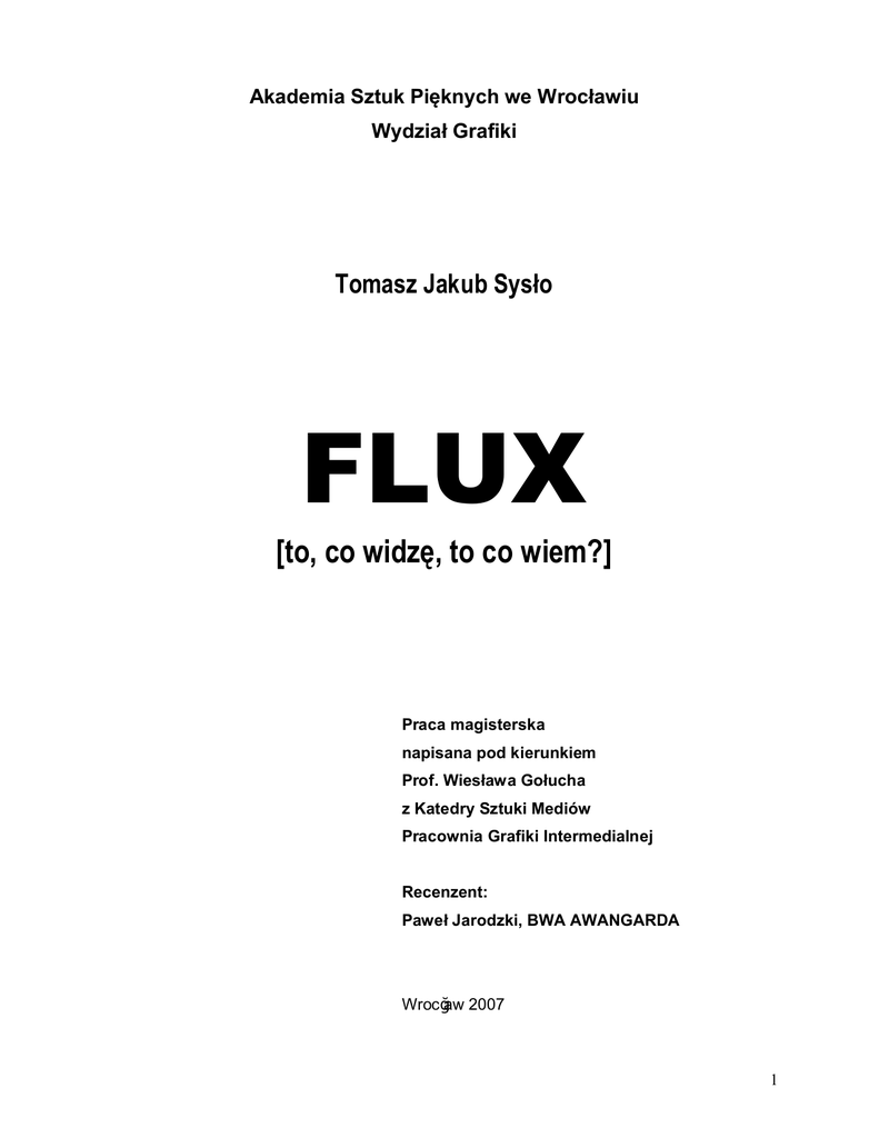 Akademia Sztuk Pięknych we Wrocławiu Wydział Grafiki Tomasz Jakub Sysło FLUX [to, co widzę, to co wiem?] Praca magisterska napisana pod kierunkiem Prof. Wiesława Gołucha z Katedry Sztuki Mediów Pracownia Grafiki Intermedialnej Recenzent: Paweł Jarodzki, BWA AWANGARDA Wrocław 2007 1 Świat, który widzimy jest złożony z pojedynczych klatek, mruganie powiekami oczu oddziela nam te klatki od siebie. Separuje w sposób niezauważalny te obrazy. Przyspieszone mruganie powiek lub jego brak tworzy przepływ, strumień. On nas otacza, tkwimy w nim, pływamy. Nasze oczy widzą, mózg rejestruje. Jest percepcja. Mamy pewność zawsze, że gdy zamykamy oczy i je po sekundzie otwieramy, znajdziemy się w tym samym miejscu i czasie, mamy pewność jedności. Hmmm, gdyby tak nie było? Zamykamy oczy patrząc na okno w pokoju; w mieszkaniu gdzie żyjemy, znamy każdy skrawek przestrzeni i otwieramy po chwili, będąc w Kairze i patrząc na piramidy… fajnie. Wydaje mi się, że sztuka video-art nam to umożliwia. Sen. Cud. Czy tak niedoskonały sposób widzenia świata poprzez nasze oczy-zmysły jest wierny próbując pokazać to, co nas otacza? Sto lat temu, gdy kino, film, fotografia dopiero raczkowały, takie eksperymenty - jedyne możliwe na ten czas techniczne możliwości - nadawały nowy wymiar prezentacji i przedstawieniom naszej przestrzeni. Czy w dzisiejszych, cyberdigitalnych czasach jesteśmy w stanie unaocznić sobie świat widziany poprzez nasze mrugające powieki? Czy będziemy w stanie go zaakceptować, czy nie będzie on kaleki? Jesteśmy dziś przyzwyczajeni do idealnych obrazów, megapikseli, highendowych oraz high-definition wizji, ostrych kolorów, doskonałego dźwięku … 2 Czy artystyczna wizja świata, który mnie otacza jest do zaakceptowania i dziś? Czy próba przefiltrowania obrazów przez technologię i własną wrażliwość by stworzyć swoistą esencję, nieobciążoną „dłużyznami”, z jakich składa się w większości egzystencja, zaowocuje stworzeniem frapującego tworu wizualnego?.. Oto problem artystyczny, którego dotyczy mój FLUX. To także problem filozoficzny czy też mentalny, dotyczący postrzegania szeroko pojętego wszechświata nas otaczającego. Problem, że aż oczy bolą … Każda istota od wieków, miliardów lat separuje natłok obrazów, było tak zanim staliśmy się ludźmi. To na wpół atawistyczne przypatrywanie się zmianom w otoczeniu i interakcjom w nim się zdarzającym, kodowanie zjawisk, zdarzeń i postrzeganie związków przyczynowoskutkowych – to także jest przyczyną nabywania pewnych odruchów, kreowania wrażliwości. Wygenerowane przez świat zewnętrzny bodźce przyczyniają się do rozwoju człowieka od niemowlęctwa, począwszy od wytworzenia przez organizm włókien mielinowych w pierwszych miesiącach życia poprzez rozwój fizjologiczny, ruchowy aż po intelektualny i emocjonalny – gdzie można też umiejscowić wrażliwość estetyczną. Reagowaliśmy i dalej reagujemy na to, co dzieje się wokół. Przez tysiące lat człowiek zmieniał się podobnie jak przez wieki dokonała się ewolucja postrzegania przez nas świata i zamykania go w przekazie obrazkowym. Obserwując zmieniające się otoczenie, próbowaliśmy je opisywać. Powstawały klatki wycięte ze zdarzeń, portrety wycinków czasu, te wszystkie początki zapisu: rysunki w jaskiniach, naskalne malowidła, sceny polowań i życia człowieka. To były też formy komunikacji, przekazania idei i myśli. Później był tego ogrom, tych wycinków – krótszych lub dłuższych. Spróbuję sprecyzować nieco moje spojrzenie na to, co mnie otacza, to jak postrzegam - w oparciu o rys historyczny i może mentalno-filozoficzny... Nie będą to puste dywagacje. To będzie mój przepływ – flux. Flux jaskiniowca w zetknięciu z historią, technologia i światem zastanym… 3 FLUX - tłumaczenie ang.: flux n m upływ; m strumień; m przypływ; m przepływ; fpl ciągłe zmiany; m topnik [techn.] ROZWÓJ TECHNICZNY ŚRODKÓW KOMUNIKACJI [wersja subiektywna by tsy] · · · · · · · · · · · · · · · · · · · · · · · · · · · · · · ok.30 tys. p.n.e. malarstwo naskalne ? pergaminy ? pieczęcie ? freski [...] ok. 1440 – druk książki ok. 1500 ‘widzenie dwuoczne’ leonarda da vinci 1609 – gazeta ok. 1600 pierwsza akwarela ‘stereo’ 1839 – fotografia 1840 – telegraf elektryczny 1860 – fotografia stereo 1876 – telefon 1877 – gramofon 1895 – film 1904 – radio (1914 - pierwsze regularne audycje) 1908 – radiotelegraf 1920 – dalekopis 1935 – książka kieszonkowa 1950 – magnetofon 1969 – internet dla celów wojskowych 1971 – telewizja satelitarna 1978 – komputer osobisty 1983 – odtwarzacz CD 1990 – cyfrowy telefon komórkowy 1990 – powszechnie dostępny internet i multimedia 1994 – dvd 1995 – mp3 2005 – blu-ray oraz hd-dvd 2006 – flux J 4 rozwój i udoskonalanie istniejących środków przekazu Ludzie od niepamiętnych czasów czuli potrzebę porozumiewania się. Komunikacja międzyludzka stanowi podstawę każdej kultury i najprościej mówiąc, jest to proces, w którym nadawca, a więc pewna osoba, czy też osoby, formułuje przekaz i adresuje go do odbiorców. Dzięki temu, że wymieniamy się w sposób zrozumiały dla obydwu stron informacjami, świat idzie naprzód. Nie byłoby postępu cywilizacyjnego, gdybyśmy nie potrafili się dogadać, wymienić pomysłami, spostrzeżeniami, uwagami, a przede wszystkim ideami. To wszystko pcha nas do przodu. Komunikacja odbywa się za pomocą mowy, pisma, druku, przekaźników elektronicznych. Wszyscy posługujemy się językiem, a słowo mówione było pierwotnym medium komunikacji człowieka. Ze względu na nietrwały charakter tego środka przekazu, najstarsze ludzkie komunikaty się nie zachowały. Być może prawdopodobnie początkowo istoty ludzkie porozumiewały się za pomocą chrząkania, chrumkania, porykiwania i pokwikiwania, czyli d