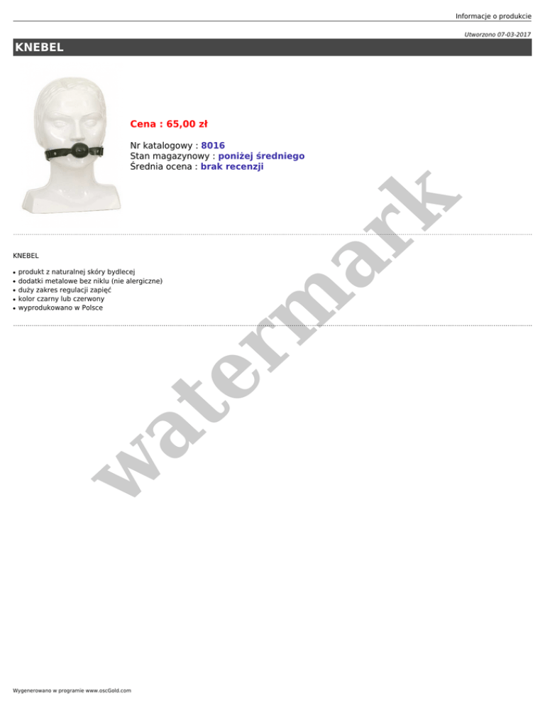 Informacje o produkcie Utworzono 07-03-2017 KNEBEL Cena : 65,00 zł er m ar k Nr katalogowy : 8016 Stan magazynowy : poniżej średniego Średnia ocena : brak recenzji KNEBEL ● ● ● ● w at ● produkt z naturalnej skóry bydlecej dodatki metalowe bez niklu (nie alergiczne) duży zakres regulacji zapięć kolor czarny lub czerwony wyprodukowano w Polsce Wygenerowano w programie www.oscGold.com