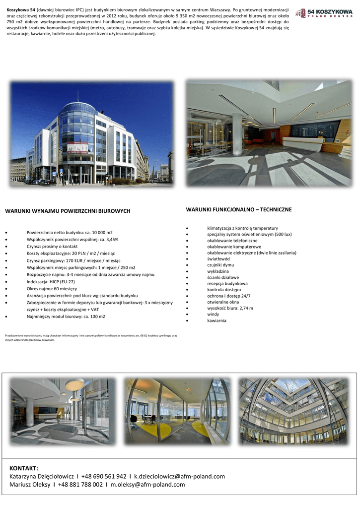 Koszykowa 54 (dawniej biurowiec IPC) jest budynkiem biurowym zlokalizowanym w samym centrum Warszawy. Po gruntownej modernizacji oraz częściowej rekonstrukcji przeprowadzonej w 2012 roku, budynek oferuje około 9 350 m2 nowoczesnej powierzchni biurowej or az około 750 m2 dobrze wyeksponowanej powierzchni handlowej na parterze. Budynek posiada parking podziemny oraz bezpośredni dostęp do wszystkich środków komunikacji miejskiej (metro, autobusy, tramwaje oraz szybka kolejka miejska). W sąsiedztwie Koszykowej 54 znajdują się restauracje, kawiarnie, hotele oraz dużo przestrzeni użyteczności publicznej. WARUNKI WYNAJMU POWIERZCHNI BIUROWYCH Powierzchnia netto budynku: ca. 10 000 m2 Współczynnik powierzchni wspólnej: ca. 3,45% Czynsz: prosimy o kontakt Koszty eksploatacyjne: 20 PLN / m2 / miesiąc Czynsz parkingowy: 170 EUR / miejsce / miesiąc Współczynnik miejsc parkingowych: 1 miejsce / 250 m2 Rozpoczęcie najmu: 3-4 miesiące od dnia zawarcia umowy najmu Indeksacja: HICP (EU-27) Okres najmu: 60 miesięcy Aranżacja powierzchni: pod klucz wg standardu budynku Zabezpieczenie w formie depozytu lub gwarancji bankowej: 3 x miesięczny czynsz + koszty eksploatacyjne + VAT Najmniejszy moduł biurowy: ca. 100 m2 WARUNKI FUNKCJONALNO – TECHNICZNE klimatyzacja z kontrolą temperatury specjalny system oświetleniowym (500 lux) okablowanie telefoniczne okablowanie komputerowe okablowanie elektryczne (dwie linie zasilania) światłowód czujniki dymu wykładzina ścianki działowe recepcja budynkowa kontrola dostępu ochrona i dostęp 24/7 otwieralne okna wysokość biura: 2,74 m windy kawiarnia Przedstawione warunki najmu mają charakter informacyjny i nie stanowią oferty handlowej w rozumieniu art. 66 §1 kodeksu cywilnego oraz innych właściwych przepisów prawnych. KONTAKT: Katarzyna Dzięciołowicz I +48 690 561 942 I [email protected] Mariusz Oleksy I +48 881 788 002 I [email protected] Koszykowa 54 (dawniej biurowiec IPC) jest budynkiem biurowym zlokalizowanym w samym centrum Warszawy. Po gruntownej modernizacji oraz częściowej rekonstrukcji przeprowadzonej w 2012 roku, budynek oferuje około 9 350 m2 nowoczesnej powierzchni biurowej or az około 750 m2 dobrze wyeksponowanej powierzchni handlowej na parterze. Budynek posiada parking podziemny oraz bezpośredni dostęp do wszystkich środków komunikacji miejskiej (metro, autobusy, tramwaje oraz szybka kolejka miejska). W sąsiedztwie Koszykowej 54 znajdują się restauracje, kawiarnie, hotele oraz dużo przestrzeni użyteczności publicznej. LOKALIZACJA KONTAKT: Katarzyna Dzięciołowicz I +48 690 561 942 I [email protected] Mariusz Oleksy I +48 881 788 002 I [email protected] Koszykowa 54 (dawniej biurowiec IPC) jest budynkiem biurowym zlokalizowanym w samym centrum Warszawy. Po gruntownej modernizacji oraz częściowej rekonstrukcji przeprowadzonej w 2012 roku, budynek oferuje około 9 350 m2 nowoczesnej powierzchni biurowej or az około 750 m2 dobrze wyeksponowanej powierzchni handlowej na parterze. Budynek posiada parking podziemny oraz bezpośredni dostęp do wszystkich środków komunikacji miejskiej (metro, autobusy, tramwaje oraz szybka kolejka miejska). W sąsiedztwie Koszykowej 54 znajdują się restauracje, kawiarnie, hotele oraz dużo przestrzeni użyteczności publicznej. RZUT TYPOWEGO PIĘTRA POWIERZCHNIE PIĘTER 7 6 5 4 3 2 1 0 640 1320 1500 1490 1540 1530 1320 770 m2 m2 m2 m2 m2 m2 m2 m2 KONTAKT: Katarzyna Dzięciołowicz I +48 690 561 942 I [email protected] Mariusz Oleksy I +48 881 788 002 I [email protected]