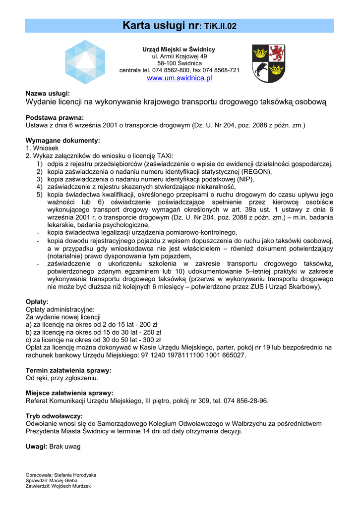 Karta usługi nr: TiK.II.02 Urząd Miejski w Świdnicy ul. Armii Krajowej 49 58-100 Świdnica centrala tel. 074 8562-800, fax 074 8568-721 www.um.swidnica.pl Nazwa usługi: Wydanie licencji na wykonywanie krajowego transportu drogowego taksówką osobową Podstawa prawna: Ustawa z dnia 6 września 2001 o transporcie drogowym (Dz. U. Nr 204, poz. 2088 z późn. zm.) Wymagane dokumenty: 1. Wniosek 2. Wykaz załączników do wniosku o licencję TAXI: 1) odpis z rejestru przedsiębiorców (zaświadczenie o wpisie do ewidencji działalności gospodarczej, 2) kopia zaświadczenia o nadaniu numeru identyfikacji statystycznej (REGON), 3) kopia zaświadczenia o nadaniu numeru identyfikacji podatkowej (NIP), 4) zaświadczenie z rejestru skazanych stwierdzające niekaralność, 5) kopia świadectwa kwalifikacji, określonego przepisami o ruchu drogowym do czasu upływu jego ważności lub 6) oświadczenie poświadczające spełnienie przez kierowcę osobiście wykonującego transport drogowy wymagań określonych w art. 39a ust. 1 ustawy z dnia 6 września 2001 r. o transporcie drogowym (Dz. U. Nr 204, poz. 2088 z późn. zm.) – m.in. badania lekarskie, badania psychologiczne, - kopia świadectwa legalizacji urządzenia pomiarowo-kontrolnego, - kopia dowodu rejestracyjnego pojazdu z wpisem dopuszczenia do ruchu jako taksówki osobowej, a w przypadku gdy wnioskodawca nie jest właścicielem – również dokument potwierdzający (notarialnie) prawo dysponowania tym pojazdem, - zaświadczenie o ukończeniu szkolenia w zakresie transportu drogowego taksówką, potwierdzonego zdanym egzaminem lub 10) udokumentowanie 5–letniej praktyki w zakresie wykonywania transportu drogowego taksówką (przerwa w wykonywaniu transportu drogowego nie może być dłuższa niż kolejnych 6 miesięcy – potwierdzone przez ZUS i Urząd Skarbowy). Opłaty: Opłaty administracyjne: Za wydanie nowej licencji a) za licencję na okres od 2 do 15 lat - 200 zł b) za licencję na okres od 15 do 30 lat - 250 zł c) za licencje na okres od 30 do 50 lat - 300 zł Opłat za licencję można dokonywać w Kasie Urzędu Miejskiego, parter, pokój nr 19 lub bezpośrednio na rachunek bankowy Urzędu Miejskiego: 97 1240 1978111100 1001 665027. Termin załatwienia sprawy: Od ręki, przy zgłoszeniu. Miejsce załatwienia sprawy: Referat Komunikacji Urzędu Miejskiego, III piętro, pokój nr 309, tel. 074 856-28-96. Tryb odwoławczy: Odwołanie wnosi się do Samorządowego Kolegium Odwoławczego w Wałbrzychu za pośrednictwem Prezydenta Miasta Świdnicy w terminie 14 dni od daty otrzymania decyzji. Uwagi: Brak uwag Opracowała: Stefania Horodyska Sprawdził: Maciej Gleba Zatwierdził: Wojciech Murdzek