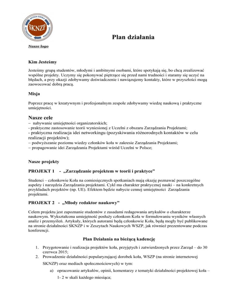 Plan działania Nasze logo Kim Jesteśmy Jesteśmy grupą studentów, młodymi i ambitnymi osobami, które spotykają się, bo chcą zrealizować wspólne projekty. Uczymy się pokonywać piętrzące się przed nami trudności i staramy się uczyć na błędach, a przy okazji zdobywamy doświadczenie i nawiązujemy kontakty, które w przyszłości mogą zaowocować dobrą pracą. Misja Poprzez pracę w kreatywnym i profesjonalnym zespole zdobywamy wiedzę naukową i praktyczne umiejętności. Nasze cele − nabywanie umiejętności organizatorskich; - praktyczne zastosowanie teorii wyniesionej z Uczelni z obszaru Zarządzania Projektami; - praktyczna realizacja idei networkingu (pozyskiwania różnorodnych kontaktów w celu realizacji projektów); − podwyższanie poziomu wiedzy członków koła w zakresie Zarządzania Projektami; − propagowanie idei Zarządzania Projektami wśród Uczelni w Polsce; Nasze projekty PROJEKT 1 - „Zarządzanie projektem w teorii i praktyce” Studenci – członkowie Koła na comiesięcznych spotkaniach mają okazję poznawać poszczególne aspekty i narzędzia Zarządzania projektami. Cykl ma charakter praktycznej nauki – na konkretnych przykładach projektów (np. UE). Efektem będzie nabycie cennej umiejętności Zarządzania projektami. PROJEKT 2 - „Młody redaktor naukowy” Celem projektu jest zapoznanie studentów z zasadami redagowania artykułów o charakterze naukowym. Wykształcona umiejętność posłuży członkom Koła w formułowaniu wyników własnych analiz i przemyśleń. Artykuły, których autorami będą członkowie Koła, będą mogły być publikowane na stronie działalności SKNZP i w Zeszytach Naukowych WSZP, jak również prezentowane podczas konferencji. Plan Działania na bieżącą kadencję 1. Przygotowanie i realizacja projektów koła, przyjętych i zatwierdzonych przez Zarząd – do 30 czerwca 2015; 2. Prowadzenie działalności popularyzującej dorobek koła, WSZP (na stronie internetowej SKNZP) oraz mediach społecznościowych) w tym: a) opracowanie artykułów, opinii, komentarzy z tematyki działalności projektowej koła – 1- 2 w skali każdego miesiąca; b) wiadomości z życia koła – raz w miesiącu; c) opracowanie sprawozdań z przedsięwzięć naukowych w których brali udział członkowie koła i ich publikowanie na stronie; d) opracowywanie i publikowanie sprawozdań okresowych z realizacji projektów koła; 3. Udział w przedsięwzięciach naukowych organizowanych przez organizacje studenckie (koła naukowe studentów) z innych uczelni; 4. Nawiązanie współpracy z Kołami naukowymi o tym samym profilu działającymi w Warszawie i na obszarze Polski; 5. Przeprowadzenie spotkania (prelekcji) z ludźmi nauki oraz praktykami z zakresu Zarządzania Projektami – 3 – 4 spotkania w terminie do 30 czerwca 2015; 6. Zorganizowanie i zrealizowanie wyjścia zbiorowego członków koła do Centrum Nauki Kopernik – 1 – 2 razy – do 30 czerwca 2015; 7. Zorganizowanie i zrealizowanie spotkania integracyjnego koła – II dekada maja, 8. Przygotowanie i przeprowadzenie Zebrania Sprawozdawczo Wyborczego SKNZP – termin II dekada listopada 2015r. Przewodnicząca SKNZP o/z