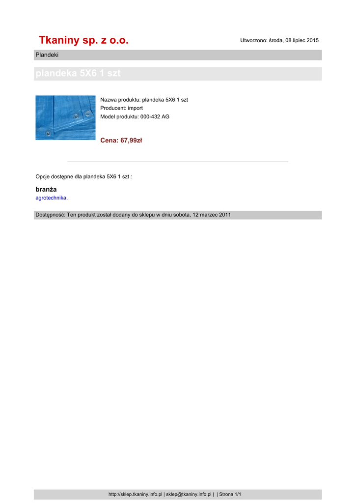 Tkaniny sp. z o.o. Utworzono: środa, 08 lipiec 2015 Plandeki plandeka 5X6 1 szt Nazwa produktu: plandeka 5X6 1 szt Producent: import Model produktu: 000-432 AG Cena: 67,99zł Opcje dostępne dla plandeka 5X6 1 szt : branża agrotechnika. Dostępność: Ten produkt został dodany do sklepu w dniu sobota, 12 marzec 2011 http://sklep.tkaniny.info.pl | [email protected] | | Strona 1/1