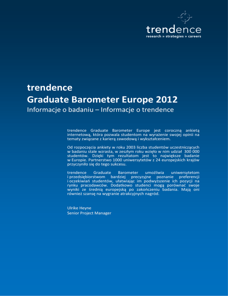 trendence Graduate Barometer Europe 2012 Informacje o badaniu – Informacje o trendence trendence Graduate Barometer Europe jest coroczną ankietą internetową, która pozwala studentom na wyrażenie swojej opinii na tematy związane z karierą zawodową i wykształceniem. Od rozpoczęcia ankiety w roku 2003 liczba studentów uczestniczących w badaniu stale wzrasta, w zeszłym roku wzięło w nim udział 300 000 studentów. Dzięki tym rezultatom jest to największe badanie w Europie. Partnerstwo 1000 uniwersytetów z 24 europejskich krajów przyczyniło się do tego sukcesu. trendence Graduate Barometer umożliwia uniwersytetom i przedsiębiorstwom bardziej precyzyjne poznanie preferencji i oczekiwiań studentów, ułatwiając im podwyższenie ich pozycji na rynku pracodawców. Dodatkowo studenci mogą porównać swoje wyniki ze średnią europejską po zakończeniu badania. Mają oni również szansę na wygranie atrakcyjnych nagród. Ulrike Heyne Senior Project Manager trendence Graduate Barometer Europe 2012 Informacje o badaniu Fakty i korzyści Jak przeprowadzić badanie ? trendence Graduate Barometer jest przeprowadzane w formie internetowej ankiety. Za uczestnictwo nie są pobierane żadne opłaty, a współpraca jest łatwa i nie zabiera wiele czasu. Najlepszą metodą zagwarantowania dużego udziału studentów w badaniu jest rozesłanie linka bezpośrednio do studentów. W tym celu prześlemy Państwu wzór listu do studentów, który mogą Państwo przesłać we własnym imieniu. Stosowanie tej metody pozwala uzyskać najwyższy odsetek odpowiedzi, co optymalizuje dokładność wyników przedstawionych w Raporcie Partnerskim. Alternatywnie, mogą Państwo przesłać link do ankiety w newsletterze albo umieścić go na stronie internetowej. Chętnie pomożemy Państwu wybrać najodpowiedniejszą metodę przeprowadzenia badania, jak również dostarczymy wszelkich potrzebnych informacji i dokumentów. Jakie korzyści dla uniwersytetu wynikają z uczestnictwa w badaniu? Partner Report Jeżeli wezmą Państwo udział w badaniu trendence Graduate Barometer i zgromadzą odpowiednią liczbę odpowiedzi, otrzymają Państwo od nas Partner Report. Ten raport porównuje wynki z Państwa uczelni ze średnimi wynikami w Europie. Będą mieli Państwo również możliwość wyboru wersji raportu, dostosowanego do Państwa potrzeb, skupiającego się na odpowiedziach: • • • najlepiej wszystkich studentów studentów kierunków ekonomicznych engineering/IT students Jakie pytania są zadawane studentom? Niektóre z tematów poruszanych w badaniu trendence Graduate Barometer: • • • • • • • • Najistotniejsze czynniki decydujące o wyborze uniwersytetu Ogólna ocena uczelni przez studentów Czas i liczba podań wysłanych w celu znalezienia pierwszej pracy Stopień mobilności zawodowej studentów Oczekiwane wynagrodzenie, czas pracy i długość zatrudnienia w pierwszej pracy Wczesniejsze doświadczenie i stopień znajomości języka angielskiego Opinie studentów odnośnie edukacji i zatrudnienia Najbardziej popularni pracodawcy wśród studentów Jakie korzyści dla studentów wynikają z uczestnictwa w badaniu? Jeżeli studenci wezmą udział w badaniu trendence Graduate Barometer, otrzymają Student Report. Ten raport porównuje wyniki badania trendence Graduate Barometer 2012 ze średnią wyników w Rankingu Top Pracodawcy w Europie. Ponadto mogą wygrać kilka nagród pieniężnych. Studnci otrzymają w zależności od kierunku studiów: • Ekonomiczny Student Report • Engineering/IT Student report 2 trendence Graduate Barometer Europe 2012 About trendence Dane i Fakty trendence badania ESOMAR Members agree to abide by the ICC/ESOMAR International Code on Market and Social Research, which has been jointly drafted by ESOMAR and the International Chamber of Commerce and is endorsed by the major national professional bodies around the world. trendence jest wiodącym instytutem badawczym w Europie, specjalizującym się w employer branding, marketingu personalnym i rekrutacji. Co roku ponad 530 000 maturzystów, studentów i absolwentów z całego świata bierze udział w naszych badaniach dotyczących ambicji zawodowych i wyboru pracodawcy. Wyniki tych badań są nieocenionym wsparciem dla działu HR: dostarczając wiarygodnych, reprezentatywnych informacji o potencjalnych pracownikach, ułatwiają podejmowanie kluczowych decyzji dotyczących rekrutacji i strategii marketingowych. Ponadto nasze wyniki stanowią wsparcie dla szkół i wyższych uczelni w ocenie ich działalności i rozwoju strategicznych celów. The ‘Top 100’ - Rankingi najbardziej pożądanych pracodawców, opracowane na podstawie naszych badań, stanowią cenne źródło informacji dla mediów, pracodawców i potencjalnych pracowników. O naszym zaangażowaniu w jakość wyników badań trendence świadczy fakt, że główni członkowie naszego zespołu posiadają członkowstwo ESOMAR, jak również bezwzględne przestrzeganie ISO 20252 i innych uznanych standardów badań marketingowych. trendence wydaje także różne publikacje drukowane i elektroniczne, mające na celu wsparcie maturzystów i studentów w podejmowaniu ich zawodowych decyzji. trendence jest częścią Group GTI, największego na świecie wydawcy publikacji o karierze, który posiada biura w Europie i Azji. Jako lider dynamicznie rozwijającego się rynku, trendence regularnie odnotowuje dwucyfrowe roczne stopy wzrostu. Naszymi klientami są przede wszystkim organizacje prowadzące działalność w skali międzynarodowej i globalnej. Media impact Nasze badania są przeprowadzane na wszystkich najważniejszych rynkach Europy i uchodzą za istotny i niezależny instrument pomiaru. Mamy zaszczyt publikacji w najważnieszych mediach w każdym kraju. To tylko niektórzy z naszych partnerów: The Guardian (UK), Le Figaro (FR), Neue Zürcher Zeitung (CH), Karieri (BG), Kurier (AT), Ekonomika (CZ) i wiele innych. W celu uzyskania 
