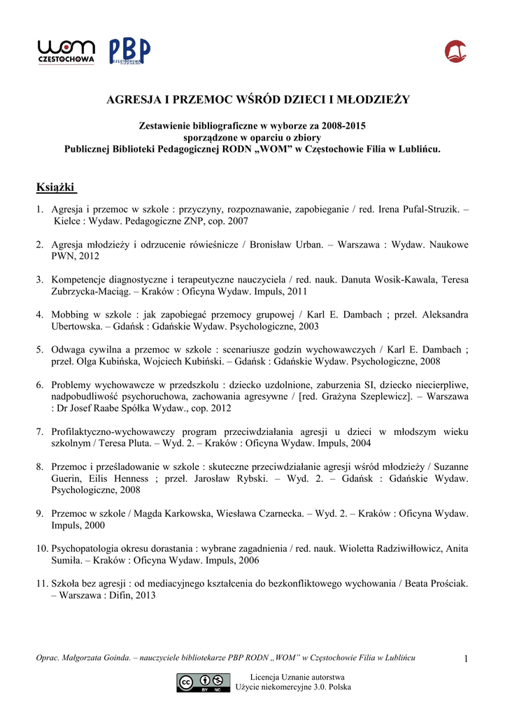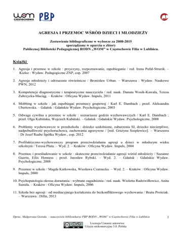 AGRESJA I PRZEMOC WŚRÓD DZIECI I MŁODZIEŻY Zestawienie bibliograficzne w wyborze za 2008-2015 sporządzone w oparciu o zbiory Publicznej Biblioteki Pedagogicznej RODN „WOM” w Częstochowie Filia w Lublińcu. Książki 1. Agresja i przemoc w szkole : przyczyny, rozpoznawanie, zapobieganie / red. Irena Pufal-Struzik. – Kielce : Wydaw. Pedagogiczne ZNP, cop. 2007 2. Agresja młodzieży i odrzucenie rówieśnicze / Bronisław Urban. – Warszawa : Wydaw. Naukowe PWN, 2012 3. Kompetencje diagnostyczne i terapeutyczne nauczyciela / red. nauk. Danuta Wosik-Kawala, Teresa Zubrzycka-Maciąg. – Kraków : Oficyna Wydaw. Impuls, 2011 4. Mobbing w szkole : jak zapobiegać przemocy grupowej / Karl E. Dambach ; przeł. Aleksandra Ubertowska. – Gdańsk : Gdańskie Wydaw. Psychologiczne, 2003 5. Odwaga cywilna a przemoc w szkole : scenariusze godzin wychowawczych / Karl E. Dambach ; przeł. Olga Kubińska, Wojciech Kubiński. – Gdańsk : Gdańskie Wydaw. Psychologiczne, 2008 6. Problemy wychowawcze w przedszkolu : dziecko uzdolnione, zaburzenia SI, dziecko niecierpliwe, nadpobudliwość psychoruchowa, zachowania agresywne / [red. Grażyna Szeplewicz]. – Warszawa : Dr Josef Raabe Spółka Wydaw., cop. 2012 7. Profilaktyczno-wychowawczy program przeciwdziałania agresji u dzieci w młodszym wieku szkolnym / Teresa Pluta. – Wyd. 2. – Kraków : Oficyna Wydaw. Impuls, 2004 8. Przemoc i prześladowanie w szkole : skuteczne przeciwdziałanie agresji wśród młodzieży / Suzanne Guerin, Eilis Henness ; przeł. Jarosław Rybski. – Wyd. 2. – Gdańsk : Gdańskie Wydaw. Psychologiczne, 2008 9. Przemoc w szkole / Magda Karkowska, Wiesława Czarnecka. – Wyd. 2. – Kraków : Oficyna Wydaw. Impuls, 2000 10. Psychopatologia okresu dorastania : wybrane zagadnienia / red. nauk. Wioletta Radziwiłłowicz, Anita Sumiła. – Kraków : Oficyna Wydaw. Impuls, 2006 11. Szkoła bez agresji : od mediacyjnego kształcenia do bezkonfliktowego wychowania / Beata Prościak. – Warszawa : Difin, 2013 Oprac. Małgorzata Goinda. – nauczyciele bibliotekarze PBP RODN „WOM” w Częstochowie Filia w Lublińcu Licencja Uznanie autorstwa Użycie niekomercyjne 3.0. Polska 1 Artykuły z czasopism 12. Agresja – sposoby zapobiegania przemocy wśród młodzieży środowiska szkolnego / Anna WoźniakCzerwińska // Częstochowski Biuletyn Oświatowy. – 2010, nr 4, s. 44-48 13. Agresja dzieci i młodzieży / Edyta Szot-Odrobina // Wszystko dla Szkoły. – 2008, nr 11, s. 17-20 14. Agresja dzieci i młodzieży : przejawy, przyczyny, przeciwdziałanie : bibliografia / J. R. // Problemy Opekuńczo-Wychowawcze. – 2009, nr 3, s. 60-64 15. Agresja elektroniczna – nowe wyzwania / Kamila Knol // Remedium. – 2010, nr 2, s. 30-31 16. Agresja elektroniczna – program zajęć dla uczniów / Radosław Mysior // Problemy OpiekuńczoWchowawcze. – 2013, nr 10, s. 29-34 17. Agresja elektroniczna - wirtualne ciosy, realne rany - cz. III / Jacek Pyżalski // Remedium. – 2009, nr 10, s. 10 –12 18. Agresja elektroniczna - wirtualne ciosy, realne rany - cz. IV / Jacek Pyżalski // Remedium. – 2010, nr 7/8, s. 6-7 19. Agresja i przemoc w środowisku szkolnym w świetle badań pedagogicznych / Edmund Kurowski // Wychowawca. – 2015, nr 2, s. 10-17 20. Agresja i przemoc w telewizji / Maria Owczarek // Edukacja Elementarna w Teorii i Praktyce. – 2011, nr 1, s. 39-50 21. Agresja i przemoc wśród rówieśników : (zestawienie bibliograficzne w wyborze) / Elżbieta Trojan // Nowa Szkoła. – 2014, nr 9, s. 50-57 22. Agresja i przemoc zaczyna się w podstawówce / Ewa Jonakowska // Życie Szkoły. – 2013, nr 2, s. 2629 23. Agresja w różnym wieku – przejawy i konsekwencje / Marta Komorowska // Remedium. – 2009, nr 4, s. 8-9 24. Agresja w szkole – obraz sprawcy i ofiary / Krzysztof Kruszko // Problemy Narkomanii. – 2008, nr 1, s. 13-21 25. Agresja w szkole jako przejaw patologii instytucji / Katarzyna Gazicka // Problemy Narkomanii. – 2009, nr 2, s. 80-94 26. Agresja wśród młodzieży / Bożena Pilczuk // Poradnik Bibliotekarza. – 2011, nr 9, s. 3-8 27. Agresor i ofiara przemocy w klasie szkolnej i na przerwie, rola nauczyciela / Jolanta Gęsiarz // Częstochowski Biuletyn Oświatowy. – 2014, nr 4, s. 64-65 28. Agresywna młodzież / Aleksandra Jędryszek-Geisler // Problemy Opiekuńczo-Wychowawcze. - 2011, nr 3, s. 30-34 29. Biblioterapia w przeciwdziałaniu przemocy rówieśniczej / Elżbieta Szefler // Problemy OpiekuńczoWychowawcze. – 2010, nr 8, s. 35-47 Oprac. Małgorzata Goinda. – nauczyciele bibliotekarze PBP RODN „WOM” w Częstochowie Filia w Lublińcu Licencja Uznanie autorstwa Użycie niekomercyjne 3.0. Polska 2 30. Biologiczne uwarunkowania agresji / Aleksandra Jędryszek-Geisler // Wychowawca. – 2015, nr 2, s. 20-21 31. Bulling – charakterystyka zjawiska i uwarunkowania / Aleksandra Tłuściak-Deliowska // Remedium. – 2010, nr 9, s. 1-3 32. Bulling uprzedzeniowy i jego rodzaje / Aleksandra Tłusciak-Deliowska // Problemy OpiekuńczoWychowawcze. – 2013, nr 8, s. 16-21 33. Co się dzieje z agresją w szkole? / Elżbieta Marek // Życie Szkoły. – 2008, nr 4, s. 61-64 34. Co w prawie piszczy? : "let the sunshine in..." / Maciej Osuch // Dyrektor Szkoły. – 2008, nr 10, s. 44[45] 35. Cyberprzemoc i przemoc rówieśnicza / Anna Maria Wesołowska // Dyrektor Szkoły. – 2012, nr 2, s. 46-49 36. Czy agresji można się nauczyć? / Ewa Racinowska // Wychowanie w Przedszkolu. – 2014, nr 4, s. 4951 37. Diagnozowanie i rozumienie agresji – trudności i wskazówki / Anna Karłyk-Ćwik // Problemy Opiekuńczo-Wychowawcze. – 2008, nr 1, s. 5-13 38. Dlaczego szkoła nie radzi sobie z agresją i przemocą? / Bogusław Kruk // Nowa Szkoła. – 2010, nr 7, s. 18-28 39. Dręczyciel i ofiara – dwie strony świata przemocy / Monika Chorab // Opieka, Wychowanie, Terapia. – 2009, nr 1/2, s. 5-7 40. Dziecięca agresja a umiejętność mentalizowania / Joanna Kossewska // Edukacja.
