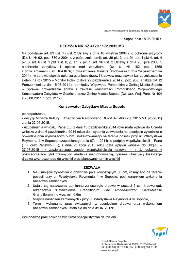Biuro Konserwatora Zabytków Miasta Sopotu Sopot, dnia 18.08.2015 r. DECYZJA NR KZ.4120.1172.2015.MC Na podstawie art. 83 ust. 1 i ust. 2 Ustawy z dnia 16 kwietnia 2004 r. o ochronie przyrody (Dz. U. Nr 92, poz. 880 z 2004 r. z późn. zmianami); art. 89 pkt 2, art. 91 ust. 4 pkt 4, art. 4 pkt 3, art. 6 ust. 1 pkt 1 lit. b, g, art. 7 pkt 1, art. 96 ust. 2 Ustawy z dnia 23 lipca 2003 r. o ochronie zabytków i opiece nad zabytkami (Dz. U. Nr 162 poz. 1568 z późn. zmianami); art. 104 KPA; Obwieszczenie Ministra Środowiska z dnia 24 października 2014 r. w sprawie stawek opłat za usunięcie drzew i krzewów oraz stawek kar za zniszczenie zieleni na rok 2015 – Monitor Polski z dnia 29 października 2014 r., poz. 958, a także pkt 12 Porozumienia z dn. 15.07.2011 r. pomiędzy Wojewodą Pomorskim z Gminą Miasta Sopotu w sprawie prowadzenia spraw z zakresu właściwości Pomorskiego Wojewódzkiego Konserwatora Zabytków w Gdańsku przez Gminę Miasta Sopotu (Dz. Urz. Woj. Pom. Nr 104 z 25.08.2011 r. poz. 2112) Konserwator Zabytków Miasta Sopotu po rozpatrzeniu: - decyzji Ministra Kultury i Dziedzictwa Narodowego DOZ-OAiK-660.260.2015.MT [25/2015] z dnia 23.06.2015, - uzupełnienia wniosku Pana (…) z dnia 16 października 2014 roku (data wpływu do Urzędu wniosku z dnia 6 października 2014 roku) dot. wydania zezwolenia na usunięcie żywotnika o obwodzie pnia wynoszącym 50cm zlokalizowanego na terenie posesji przy ul. Władysława Reymonta 4 w Sopocie, uzupełnionego dnia 07.11.2014r. o podpisy współwłaścicieli – Pana (…), oraz Państwo (…), z dnia 23 lipca 2015 roku (data wpływu wniosku do Urzędu – 27.07.2015 r.) zawierającego zgodę współwłaściciela drzewa – (…), dokumenty poświadczające tytuł prawny do władania nieruchomością, rysunek ukazujący lokalizacje drzewa wyznaczonego do wycinki oraz planowany termin wycinki 1. 2. 3. 4. ZEZWALA Na usunięcie żywotnika o obwodzie pnia wynoszącym 50 cm, rosnącego na terenie posesji przy ul. Władysława Reymonta 4 w Sopocie, pod warunkiem wykonania nasadzeń zamiennych Ustala się nasadzenia zamienne za usunięte drzewo w postaci 5 szt. krzewu gat. różanecznik ‘Catawbiense Grandiflorum’ (łac. Rhododendron ‘Catawbiense Grandiflorum’), o wys. min 0,6m Miejsce nasadzeń zamiennych - przy ul. Władysława Reymonta 4 w Sopocie, Termin wykonania prac związanych z usunięciem drzewa oraz wykonaniem nasadzeń zamiennych ustala się do dnia 31.07.2017r. Wykonawcą prac powinna być firma specjalistyczna ds. zieleni. Urząd Miasta Sopotu ul. Tadeusza Kościuszki 25/27, 81 704 Sopot tel.: (+48 58) 52 13 632, fax: (+48 58) 551 01 33 www.sopot.pl Biuro Konserwatora Zabytków Miasta Sopotu Termin ważności zezwolenia ustala się do 31.07.2017r., stosując w okresie od 1.03 do 15.10 zakazy określone w § 6.1. oraz § 8.1. Rozporządzenia Ministra Środowiska z dnia 06 października 2014r. w sprawie ochrony gatunkowej zwierząt (Dz. U. z 2014r. poz. 1348 z późn. zm.). Odpowiedzialny za prace jest inwestor. Uzasadnienie W dniu 27 lipca 2015 roku do Biura Konserwatora Zabytków wpłynęło uzupełnienie wniosku Pana (…) z dnia 16 października 2014 roku (data wpływu do Urzędu wniosku z dnia 6 października 2014 roku) dot. wydania zezwolenia na usunięcie drzewa zlokalizowanego na terenie posesji przy ul. Władysława Reymonta 4 w Sopocie, uzupełnionego dnia 07.11.2014r. o podpisy współwłaścicieli – Pana (…) oraz Państwo (…), zawierające zgodę współwłaściciela drzewa – Pani (…), dokumenty poświadczające tytuł prawny do władania nieruchomością, rysunek ukazujący lokalizacje drzewa wyznaczonego do wycinki oraz planowany termin wycinki, o które organ wezwał pismem o nr KZ.4120.1017.2015.MC z dnia 15.07.2015r. na podstawie decyzji Ministra Kultury i Dziedzictwa Narodowego DOZ-OAiK660.260.2015.MT [25/2015] z dnia 23.06.2015. W związku z ww. wnioskiem dokonano szczegółowej analizy pod względem formalnoprawnym oraz merytorycznym dokumentacji zgromadzonej w przedmiotowej sprawie. Dnia 05.08.2015 roku przeprowadzono oględziny wytypowanej do wycinki roślinności oraz wykonano dokumentację fotograficzną. Podczas oględzin w terenie nie stwierdzono występowania w obrębie zadrzewień gatunków chronionych, wg art. 83 ust. 2c Ustawy z dnia 16 kwietnia 2004 roku o ochronie przyrody. W załączeniu organ przesyła kopię protokołu sporządzonego podczas ww. wizji w terenie. Zgodnie z art. 86 ust. 1 pkt. 2 Ustawy z dnia 16 kwietnia 2004 roku o ochronie przyrody nie pobiera się opłaty za usunięcie przedmiotowego drzewa. Przedmiotowy żywotnik rośnie w bardzo bliskim sąsiedztwie schodów do budynku przy ul. Władysława Reymonta 4 w Sopocie, kolidując zarówno z samymi schodami jak i z elewacją budynku. Drzewo w chwili obecnej posiada zniekształconą przez podkrzesanie koronę, ale nie wpłynęło to na kondycję drzewa i znajduje się ono w dobrym stanie zdrowotnym. W ocenie Organu rzeczone drzewo nie posiada wysokich walorów krajobrazowych, dlatego uznaje się za zasadne wydanie zgody na jego usunięcie, pod warunkiem wykonania nasadzeń zamiennych. Posesja przy ul. Reymonta 4 w Sopocie nie posiada geodezyjnego podziału, jednakże posiada podział umowny. Teren, na którym rośnie przedmiotowy żywotnik jest wygrodzony w stosunku do całej posesji i zagospodarowany jest bogato i bardzo estetycznie. Faktem jest, iż w tej części posesji nie ma miejsca na nowe nasadzenia, jednakże pozostały Urząd Miasta Sopotu ul. Tadeusza Kościuszki 25/27, 81 704 Sopot tel.: (+48 58) 52 13 632, fax: (+48 58) 551 01 33 www.sopot.pl Biuro Konserwatora Zabytków Miasta Sopotu teren działki o nr 112/1 ark. mapy 30 w Sopocie jest dużo większy i o wiele mniej starannie zagospodarowany. Miejsce na nowe nasadzenia znajduje się w części frontowej posesji, a także w południowej, która jest zaniedbana i porośnięta zdziczałą roślinnością. Zauważyć należy, iż przedmiotowy żywot