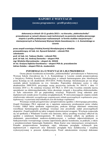 RAPORT Z WIZYTACJI (ocena programowa – profil praktyczny) dokonanej w dniach 10-11 grudnia 2015 r. na kierunku „elektrotechnika” prowadzonym w ramach obszaru nauk technicznych na poziomie studiów pierwszego stopnia o profilu praktycznym realizowanych w formie studiów stacjonarnych i niestacjonarnych w Państwowej Wyższej Szkole Zawodowej im. J. A. Komeńskiego w Lesznie przez zespół oceniający Polskiej Komisji Akredytacyjnej w składzie: przewodniczący: dr hab. inż. Ryszard Golański – członek PKA członkowie: prof. dr hab. inż. Tadeusz Skubis – członek PKA prof. dr hab. inż. Andrzej Demenko – ekspert PKA mgr Wioletta Marszelewska – ekspert ds. WSZJK dr inż. Grażyna Dębicka-Ozorkiewicz – ekspert PKA ds. pracodawców Adrian Duleba – ekspert PKA ds. studenckich INFORMACJA O WIZYTACJI I JEJ PRZEBIEGU Ocena jakości kształcenia na kierunku „elektrotechnika” prowadzonym w Państwowej Wyższej Szkole Zawodowej im. J. A. Komeńskiego w Lesznie została przeprowadzona z inicjatywy Polskiej Komisji Akredytacyjnej w ramach harmonogramu prac określonych przez Komisję na rok akademicki 2015/2016. Polska Komisja Akredytacyjna po raz drugi oceniała jakość kształcenia na ww. kierunku. Poprzednio dokonano oceny w roku akademickim 2009/2010, przyznając ocenę pozytywną (uchwała Nr 304/10 z dnia 15 kwietnia 2010 r.). Po ostatniej wizytacji ZO PKA w 2010 roku Uczelnia zmieniła nazwę specjalności na elektromechatronika, która akcentuje związek z dyscypliną elektrotechnika, co było zaleceniem ZO po poprzedniej wizytacji. Większość uwag odnośnie prac dyplomowych zostało przez Uczelnię uwzględnionych. W niewystarczającym stopniu zostało zrealizowane zalecenie szczegółowego rozgraniczenia wkładu poszczególnych współautorów pracy dyplomowej i wystawiania indywidualnych ocen dla każdego współautora. Wizytacja została przygotowana i przeprowadzona zgodnie z obowiązującą procedurą. Zespół Oceniający PKA zapoznał się z raportem samooceny przekazanym przez władze Uczelni. Odbył także spotkanie organizacyjne, podczas którego dokonano ostatecznej weryfikacji harmonogramu przebiegu wizytacji oraz przydziału zadań poszczególnych ekspertów. Zespół podzielił się także wstępnie dostrzeżonymi uwagami. Wizytacja rozpoczęła się od spotkania z Władzami Uczelni oraz Instytutu, dalszy przebieg wizytacji odbywał się zgodnie z ustalonym harmonogramem. W trakcie wizytacji odbyły się spotkania ze studentami, pracownikami naukowo-dydaktycznymi, z osobami odpowiedzialnymi za funkcjonowanie wewnętrznego systemu zapewnienia jakości kształcenia, za praktyki, a także z przedstawicielami Samorządu Studentów, Biura Karier oraz interesariuszy zewnętrznych. Ponadto przeprowadzono hospitacje zajęć, dokonano przeglądu wybranych prac dyplomowych i etapowych oraz dokonano przeglądu bazy dydaktycznej i socjalnej wykorzystywanej w procesie dydaktycznym. Przed zakończeniem wizytacji dokonano 1 wstępnych podsumowań, sformułowano uwagi i zalecenia, o których Przewodniczący Zespołu oraz eksperci poinformowali władze Uczelni na spotkaniu podsumowującym. OCENA SPEŁNIENIA KRYTERIÓW OCENY PROGRAMOWEJ DLA KIERUNKÓW STUDIÓW O PROFILU PRAKTYCZNYM Ocena końcowa spełnienia kryterium Kryterium oceny wyróżniająco 1. Jednostka sformułowała koncepcję kształcenia i realizuje na ocenianym kierunku studiów program kształcenia umożliwiający osiągnięcie zakładanych efektów kształcenia 2. Liczba i jakość kadry naukowo-dydaktycznej zapewniają realizację programu kształcenia na ocenianym kierunku oraz osiągnięcie przez studentów zakładanych efektów kształcenia 3. Współpraca z otoczeniem społecznym, gospodarczym lub kulturalnym w procesie kształcenia 4. Jednostka dysponuje infrastrukturą dydaktyczną umożliwiającą realizację programu kształcenia o profilu praktycznym i osiągnięcie przez studentów zakładanych efektów kształcenia 5. Jednostka zapewnia studentom wsparcie w procesie uczenia się i wchodzenia na rynek pracy 6. W jednostce działa skuteczny wewnętrzny system zapewniania jakości kształcenia zorientowany na ocenę realizacji efektów kształcenia i doskonalenia programu kształcenia oraz podniesienie jakości na ocenianym kierunku studiów w znacząco częściowo niedostatecznie pełni X X X X X x 2 Jeżeli argumenty przedstawione w odpowiedzi na raport z wizytacji lub wniosku o ponowne rozpatrzenie sprawy będą uzasadniały zmianę uprzednio sformułowanych ocen, raport powinien zostać uzupełniony. Należy, w odniesieniu do każdego z kryteriów, w obrębie którego ocena została zmieniona, wskazać dokumenty, przedstawić dodatkowe informacje i syntetyczne wyjaśnienia przyczyn, które spowodowały zmianę, a ostateczną ocenę umieścić w tabeli nr 1. Zalecanie 2 (str. 32 RzW). Odpowiedź Uczelni: Jednostka przedstawiła przewidywane nowe wyposażenie wymienionych laboratoriów (Zał. 3) i opisy poszczególnych zmodernizowanych ćwiczeń laboratoryjnych. Uczelnia załączyła (Zał. 4 i Zał. 4. a) w odpowiedzi wiarygodne dokumenty potwierdzające wydatkowanie kwoty ok. 85 tys. zł na sprzęt laboratoryjny oraz ok. 85 tys. zł. na sprzęt komputerowy. Ponadto w okresie wakacyjnym 2016 na potrzeby przedmiotowych laboratoriów zostaną zaadaptowane pomieszczenia o powierzchni 120 m2. ZO PKA: ZO stwierdza, że Uczelnia od strony finansowej i w dużej części od strony merytorycznej wypełniła Zalecenie 2. Należy weryfikować na bieżąco zawartość poszczególnych ćwiczeń (w propozycjach są pewne błędy), tak aby unikać prezentowania studentom niestosowanych obecnie metod pomiarowych, natomiast wprowadzać pomiary parametrów dynamicznych, a nie tylko statycznych. Aby tak się stało należy korzystać z najnowszej literatury dotyczącej laboratoriów, a więc sfery umiejętności, która niestety w opisie co najmniej kilku ćwiczeń taką nie jest. Należy zwiększyć liczbę 