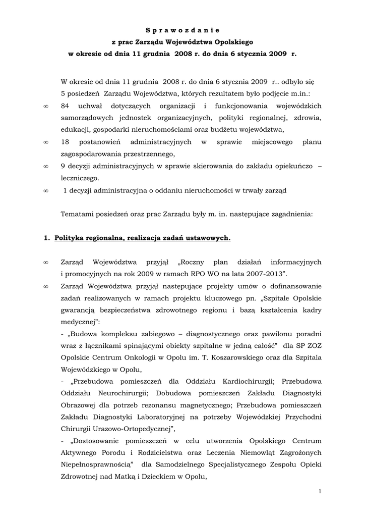 Sprawozdanie z prac Zarządu Województwa Opolskiego w okresie od dnia 11 grudnia 2008 r. do dnia 6 stycznia 2009 r. W okresie od dnia 11 grudnia 2008 r. do dnia 6 stycznia 2009 r.. odbyło się 5 posiedzeń Zarządu Województwa, których rezultatem było podjęcie m.in.: • 84 uchwał dotyczących organizacji i funkcjonowania wojewódzkich samorządowych jednostek organizacyjnych, polityki regionalnej, zdrowia, edukacji, gospodarki nieruchomościami oraz budŜetu województwa, • 18 postanowień administracyjnych w sprawie miejscowego planu zagospodarowania przestrzennego, • 9 decyzji administracyjnych w sprawie skierowania do zakładu opiekuńczo – leczniczego. • 1 decyzji administracyjna o oddaniu nieruchomości w trwały zarząd Tematami posiedzeń oraz prac Zarządu były m. in. następujące zagadnienia: 1. Polityka regionalna, realizacja zadań ustawowych. • Zarząd Województwa przyjął „Roczny plan działań informacyjnych i promocyjnych na rok 2009 w ramach RPO WO na lata 2007-2013”. • Zarząd Województwa przyjął następujące projekty umów o dofinansowanie zadań realizowanych w ramach projektu kluczowego pn. „Szpitale Opolskie gwarancją bezpieczeństwa zdrowotnego regionu i bazą kształcenia kadry medycznej”: - „Budowa kompleksu zabiegowo – diagnostycznego oraz pawilonu poradni wraz z łącznikami spinającymi obiekty szpitalne w jedną całość” dla SP ZOZ Opolskie Centrum Onkologii w Opolu im. T. Koszarowskiego oraz dla Szpitala Wojewódzkiego w Opolu, - „Przebudowa Oddziału pomieszczeń Neurochirurgii; dla Oddziału Dobudowa Kardiochirurgii; pomieszczeń Zakładu Przebudowa Diagnostyki Obrazowej dla potrzeb rezonansu magnetycznego; Przebudowa pomieszczeń Zakładu Diagnostyki Laboratoryjnej na potrzeby Wojewódzkiej Przychodni Chirurgii Urazowo-Ortopedycznej”, - „Dostosowanie pomieszczeń w celu utworzenia Opolskiego Centrum Aktywnego Porodu i Rodzicielstwa oraz Leczenia Niemowląt ZagroŜonych Niepełnosprawnością” dla Samodzielnego Specjalistycznego Zespołu Opieki Zdrowotnej nad Matką i Dzieckiem w Opolu, 1 - „Budowa Ośrodka Wczesnej Interwencji Neuroradiologicznej w zawałach mózgu wraz z rozbudową Izby Przyjęć” dla Wojewódzkiego Specjalistycznego Zespołu Neuropsychiatrycznego im. Św. Jadwigi w Opolu, • Zarząd Województwa przyjął System Identyfikacji Wizualnej Województwa Opolskiego, • Zarząd Województwa przyznał stypendia w ramach „Programu pomocy stypendialnej województwa opolskiego dla uczniów szczególnie uzdolnionych szkół gimnazjalnych i ponadgimnazjalnych”, • Zarząd Województwa zaakceptował projekt umowy o dofinansowanie projektu Instytucji Pośredniczącej w ramach poddziałania 9.1.3 Pomoc stypendialna dla uczniów szczególnie uzdolnionych PO KL pomiędzy Ministrem Rozwoju Regionalnego oraz WUP a Samorządem Województwa Opolskiego, • Zarząd Województwa przyjął projekt porozumienia z Gminą Ozimek w sprawie współpracy w ramach Stowarzyszenia DINOPARK, przedmiotowe porozumienie dotyczy m.in. zobowiązania Gminy Ozimek do nieodpłatnego przekazania Stowarzyszeniu Dinopark na okres 10 lat gruntu, na którym usytuowany jest pawilon paleontologiczny w Krasiejowie. Ww. projekt porozumienia przekazano Gminie Ozimek do akceptacji, • Zarząd Województwa powołał Zespół do oceny realizacji i monitoringu Programu Opieki nad Zabytkami Województwa Opolskiego na lata 2007-2010, • Zarząd Województwa przyjął „Okresowy plan ewaluacji Regionalnego Programu Operacyjnego Województwa Opolskiego na lata 2007-2013 na rok 2009”, • Zarząd Województwa wyraził zgodę na podpisanie umowy najmu pomieszczeń biurowych w budynku przy ul. śeromskiego 3 na potrzeby Opolskiej Regionalnej Organizacji Turystycznej, • Zarząd Województwa przyjął projekt umowy pomiędzy Województwem Opolskim a Energetyką Cieplną Opolszczyzny S.A. dotyczącej współpracy w ramach Biura Informacyjnego Województwa Opolskiego w Brukseli, • Zarząd Województwa podjął decyzję o odwołaniu się do Samorządowego Kolegium Odwoławczego w Opolu od decyzji Wójta Branic określającej wysokość podatku za 2007 i 2008 r. od nieruchomości przy ul. Szpitalnej 18 w Branicach stanowiących w tym czasie własność województwa opolskiego, • Zarząd Województwa przyjął projekt Porozumienia Ramowego z Polską Agencją Rozwoju Przedsiębiorczości (PARP) w zakresie budowania wspólnego systemu informacyjno - konsultacyjnego dla przedsiębiorców oraz osób zainteresowanych podjęciem działalności gospodarczej, • Zarząd Województwa przyjął porozumienia pomiędzy Województwem Opolskim a Województwem Zachodniopomorskim w sprawie współpracy polegającej na 2 udostępnieniu informacji związanych z projektem Urzędu Marszałkowskiego Województwa Opolskiego pn. „Gmina atrakcyjna dla inwestora”. 2. Organizacja i funkcjonowanie wojewódzkich samorządowych jednostek organizacyjnych. Zarząd Województwa przyjął projekt umowy o przekazaniu środków publicznych: - w wysokości 104 tys. zł dla PS ZOZ Opolskiego Centrum Onkologii w Opolu im. prof. T. Koszarowskiego z przeznaczeniem na dofinansowanie zakupu aparatu USG z kompletem głowic, - w wysokości 65 tys. zł na zakup aparatury medycznej dla PS ZOZ Wojewódzkie Centrum Medyczne w Opolu z przeznaczeniem na zakup aparatu do leczenia nerkozastępczego, - w wysokości 60 tys. zł dla Samodzielnego Wojewódzkiego Szpitala dla Nerwowo i Psychicznie Chorych im. Ks. Biskupa Józefa Nathana w Branicach z przeznaczeniem na zakup wyposaŜenia oddziałów psychiatrycznych, tj. krzeseł, łóŜek, szafek przyłóŜkowych, szaf, Zarząd Województwa udzielił dotacji majątkowej w wysokości 72 500,00 dla Filharmonii im. Józefa Elsnera w Opolu z przeznaczeniem na zakup instrumentów muzycznych (obój i puzon), Zarząd Województwa zatwierdził plany pracy Wojewódzkiego Ośrodka Metodycznego Ośrodka w Opolu i Wojewódzkiego Doskonalenia Info