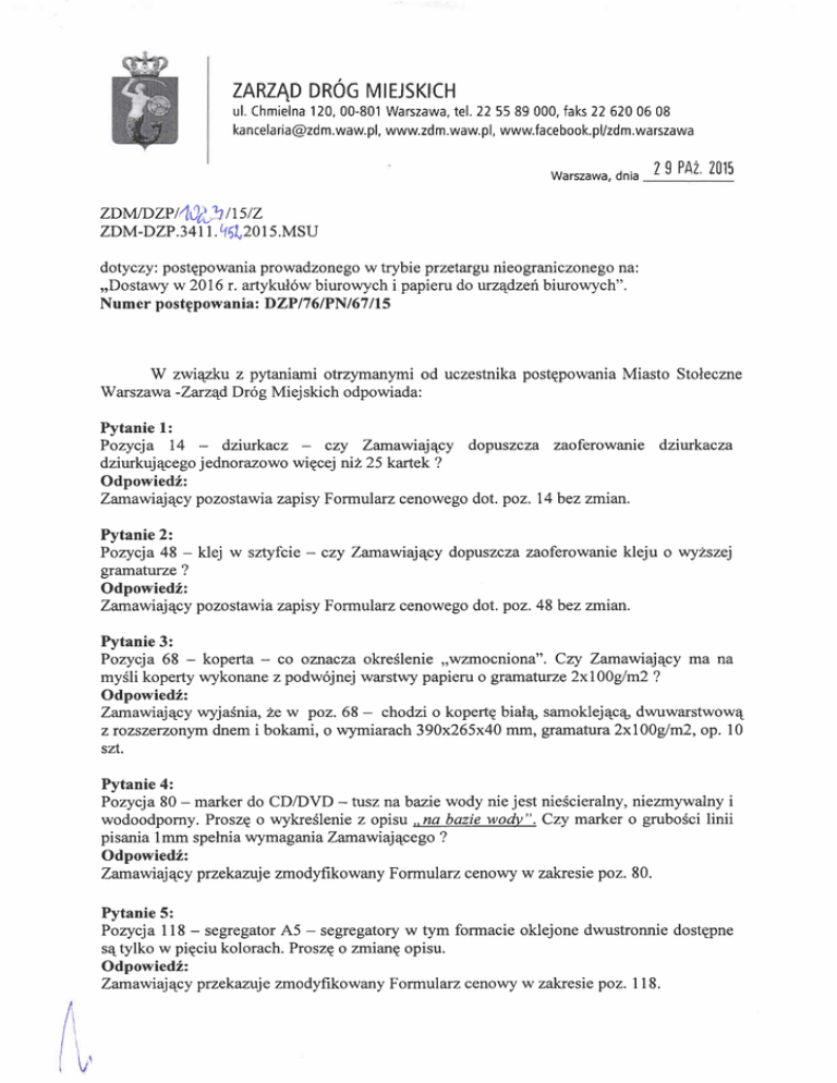 ZARZAD DROG MIEJSKICH ul. Chmielna 120, 00-801 Warszawa, tel.22 55 89 000, faks 22 620 06 08 ka ncela ria@zd m.waw.pl, www.zd m.waw, pl, www.facebook. pl/zdm,warszawa Warszawa, dnia 2 9 PA2, 2015 ttstz ^DM.DZPtrl&,* ZDM-DZP .3 4t t .?5l,ZO t S.tr,tSU dotyczy: postgpowania prowadzonego w trybie przetargu nieograniczonego na: ,,Dostawy w 2016 r. artykul6w biurowych i papieru do wzqdzefi biurowych". Numer postgpowaniaz DZP 17 6 IPN I 67 / l5 W zwiqgku z pytariarri otrzymanymi od uczestnika postEpowania Miasto Stoleczne Warszawa -Zaruqd Dr6g Miejskich odpowiada: Pytanie 1: Pozycja 14 dzlxkacz cry Zarnawiajqcy dopuszcza zaoferowanie dziwkacza dziurkuj4cego jednorazowo wigcej niz25 kartek ? Odpowiedf: Zarnawiajqcy pozostawiazapisy Formularz cenowego dot. poz. 14bez zmian. Pytanie 2: Pozycja 48 - klej w sztyfcie - czy Zarnawiajqcy dopuszcza zaoferowanie kleju o wy?szej gramaturze ? OdpowiedZ: Zamawiajqcy pozostawi a zapisy Formularz cenowego dot. poz. 48 bez zmian. Pytanie 3: Pozycja 68 - koperta - co oznacza okreSlenie ,,wzmocniona". Czy Zamawiajqcy ma na mySli koperty wykonane z podw6jnej warstwy papieru o gramaturze 2xt00g/m2 ? OdpowiedZ: Zamaviaj4cy wyjaSnia, 2e w poz. 68 - chodzi o kopertq biala, samoklej4c6 dwuwarstwowq ztozszerzonym dnem i bokami, o wymiarach 390x265x40 mm, gramatura 2xl00glm2, op. l0 szt. Pytanie 4: Pozycja 80 - marker do CD/DVD - tusz na bazie wody nie jest nieScieralny, niezmywalny i wodoodporny. Proszg o wykreSlenie z opisu ,na bazie wody". Czy marker o gruboSci linii pisania lmm spelnia wymaganiaZamawiajqcego ? Odpowied:Z: Zanaviajqcy przekazt$e zmodyfikowany Formularz cenowy w zakresie poz. 80. Pytanie 5: Pozycja I l8 - segregator ,A'5 - segregatory w tym formacie oklejone dwustronnie dostgpne sqtylko w pigciu kolorach. Proszg o zmiang opisu. OdpowiedZ: Zamaviajqcy przekazr$e zmodyfikowany Formularz cenowy w zakresie poz. I18. ノ ′ ︲ LV ︲ ︲ Pytanie 6: Porycja 166 - zeszyt A5/80k - nie wystepujq na rynku w standardowej ofercie zeszyty 80kartkowe w twardej oprawie. Proszg o wykre5lenie z opisu..twarda oprawa". OdpowiedZ: Zanawiajqcy przekazuje zmodyFrkowany Formularz cenowy w zakresie poz.166. Pytanie 7: Pozycja 169-17l - zszywacze - czy Zanawiajqcy dopuszcza zaoferowanie zszYwaczy zszywajqcych jednorazowo wigcej kartek ni2 to jest wskazane w opisie przedmiotu zam6wienia (np.odpowiednio 120,16, 30 kartek) ? Odpowiedf: Zamawiajqcy pozostawiazapisy Formularz cenowego dot. poz. 169-17l bezzmian. Pytanie 8: Jakiego opisu wymaga Zamaviaj4cy jako ,,nazwahandlowa". Czy wystarczy wpina6 np. dla poz 7 - ,,cienkopis tr6jk4tny 0,3mm", czy te2 Zanawtajqcy wymaga wskazania jeszcze innych informacji - jakich ? Odpowiedf: Zatnawiajqcy wyjaSnia,2e narlwa handlowa to oznaczenie nazwy produktu, kt6ra sluZy do odr6Znienia na rynku jednego produktu od innych, spelniaj4cych te same funkcje i majqce te same cechy i parametry lecz wyprodukowanych przez r62nych producent6w np. dla poz. 7 ,,Cienkopis STAEDTLER", ,,Cienkopis PILOT V5" itp. Miasto Stoleczne Warszawa - Zarzqd Dr6g Miejskich zgodnie z art.38 ust. 4 ustawy z zp62n'zm') dnia29 stycznia 2004r.Prawo zam6wieripublicznych (Dz.U. 22013 r.'poa.907 warunk6w Istotnych wyniku odpowiedzi na pytania zmienia tre56 Specyfrkacji Zam6wien ia poprzez modyfikacj g zapis6w w Formularzu cenowym : w l. Bylo: """ (nazwa Poz. 80 - Marker do pbrt CD/DVD EDDING 8400 lub r6wnoznaczny"' po handlowa), trwaly tusz na bazie wody, niezmywalny, nieScieralny wodoodporny wyschnigciu, szeroko66 linii pisania 0,5 - 1,0 mm, dostEpny w 4 kolorach. Jest: i Marker do ptyt CD/DVD EDDING 8400 (lub r6wnowa2ny) ........ (narrwa handlowa) tuiz trwaly, niezmywalny, nieScieralny, wodoodporny po wyschnipciu, szerokoSd linii pisania 0,5 - 1,0 mm, dostgpny w 4 kolorach. Poz. 80 - 2. Bylo: mechanizmem, oklejony na zewn4trz i wewnqtrz poliolefinq palec, dwustronna .tyti.iu. Dnvignia wysokiej jakoSci z dociskiem. Na grzbiecie, otw6r na dwa otwory na przedniej okladce. SzerokoS6 grzbietu 75 mm. Minimum 8 kolor6w. Jest: poz. 118 - Segregator A-5 z mechanizmem, oklejony na zewnqtrz i wewnqtrz poliolefin4' dwustronna etykieta. Dzrvignia wysokiej jakoSci z dociskiem. Na grzbiecie, otw6r na poz.18 - Segregator A-5 z palec, dwa otwory na przedniej okladce. SzerokoS6 grzbietu 75 mm. Minimum kolor6w. 5 A ‘ 町 3. Bylo: Poz.166 -Zeszyt A5 80 kart. twarda oprawa. Jest: Poz. 166 -kszytAs 80 kart Zgodnie z art. 38 ust. 4 ustawy Pzp dokonan4 znriang Specyfikacji Istotrych Warunk6w Zam6wienia prz.elraani,e niezwloczrie wszystkim wykonawcom, kt6rym prznlr,azano SIWZ, a jezeli specyfikacja jest udostgpniona na sfionie internetowej , z.anrieszcz,a jq|akfonatej stonie. MIE'SKICH Ot+anuja: Wykonawcyo uczestnicy w postgpowaniu o udzielenie zam6wienia